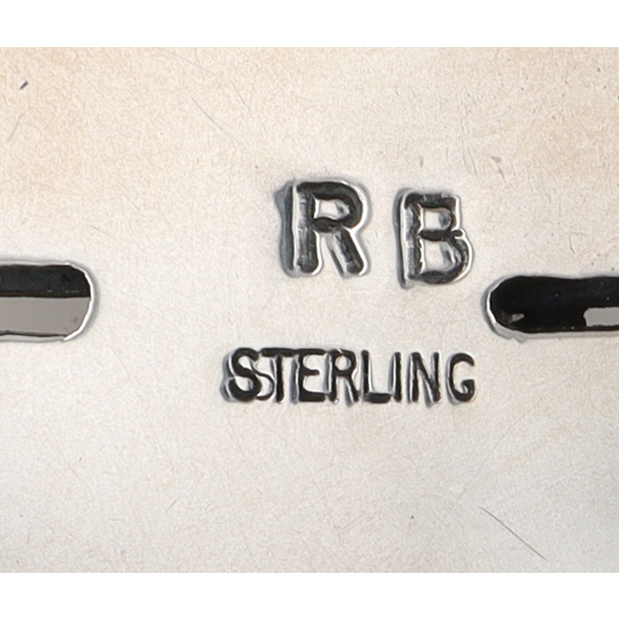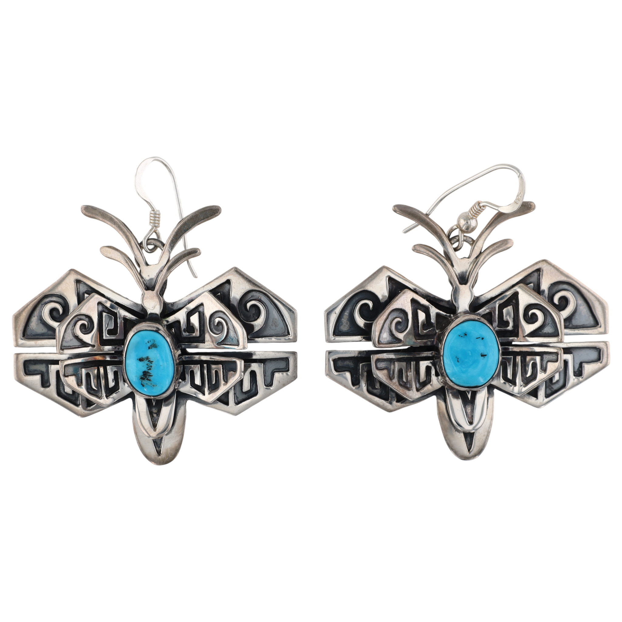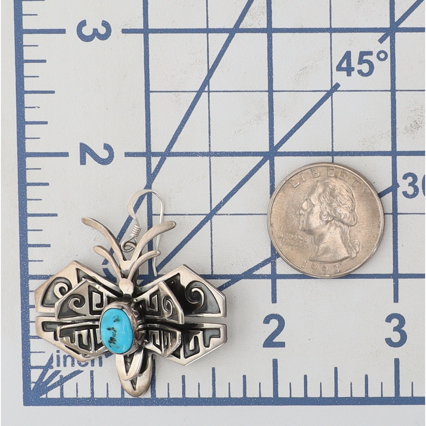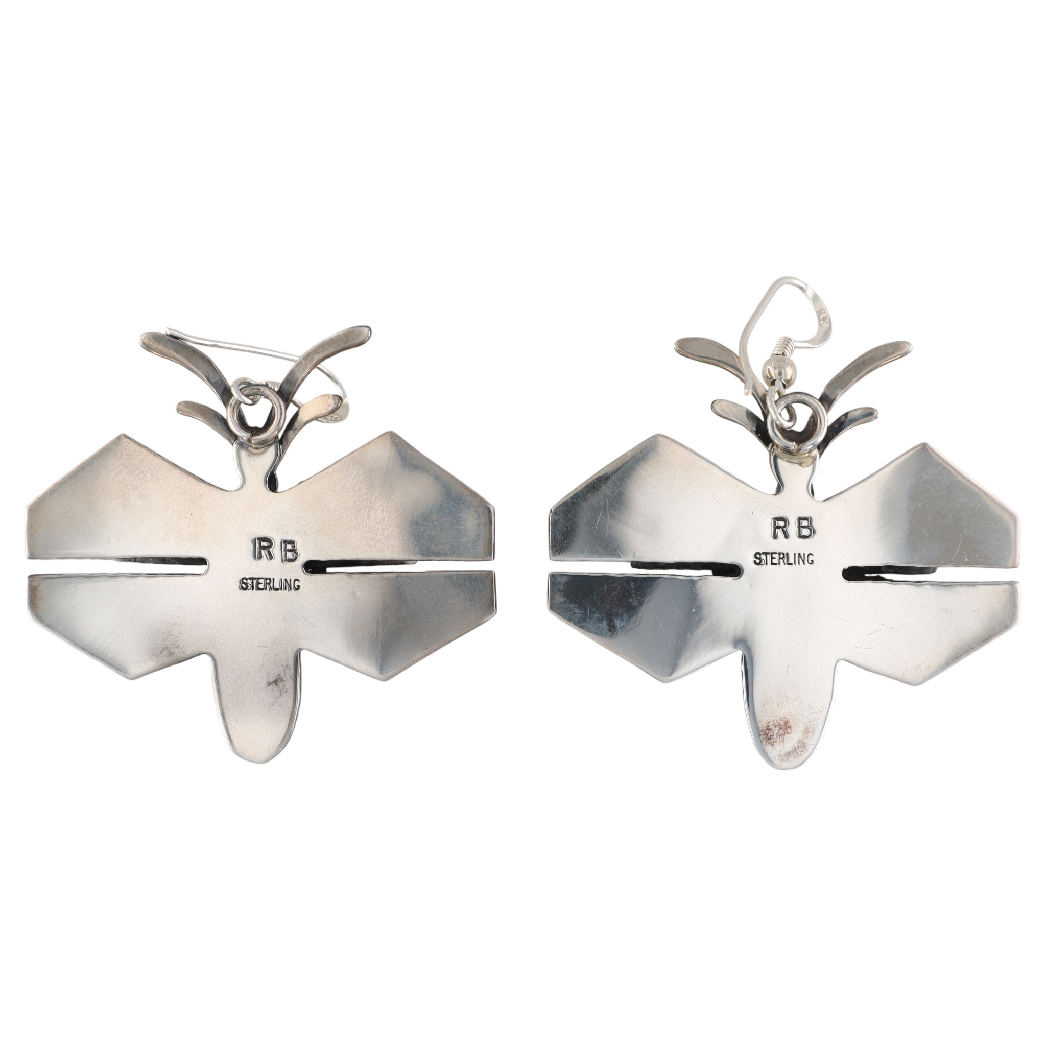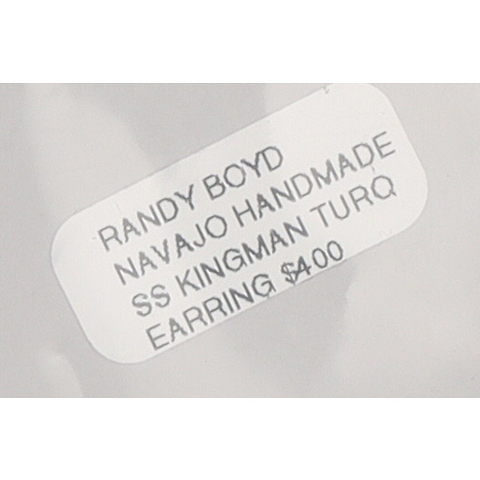 A pair of Navajo sterling silver dangle earrings by Randy Boyd. Each earring is designed as a stylized butterfly or moth with intricate cut-out geometric patterns and scrollwork on the wings. An oval, bezel-set blue cabochon stone, identified as Kingman turquoise, is centered on each butterfly body. The reverse of each earring is stamped with the maker’s mark "RB" and "STERLING". An accompanying retail tag further identifies the maker as "RANDY BOYD" and specifies "NAVAJO HANDMADE" and "SS KINGMAN TURQ".
