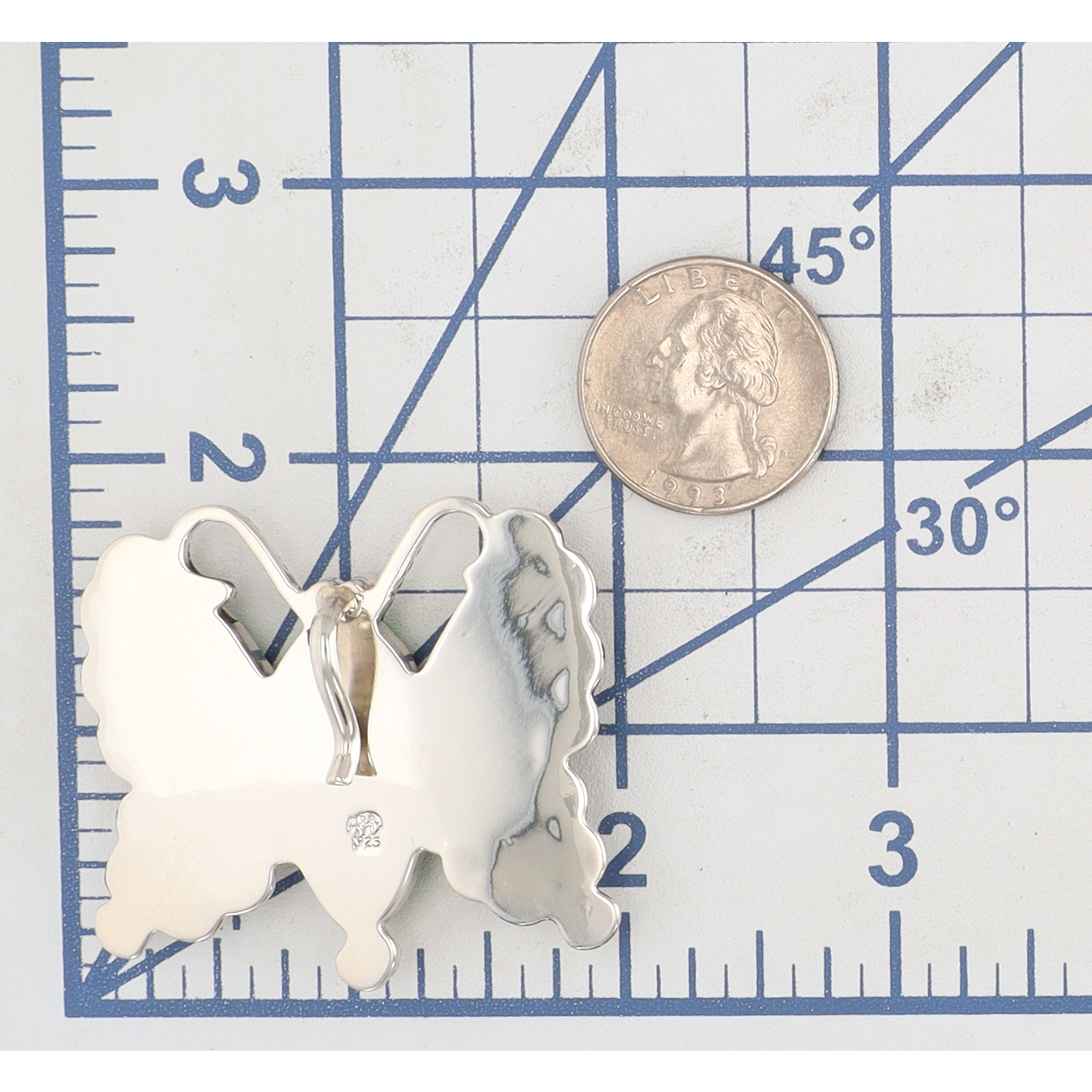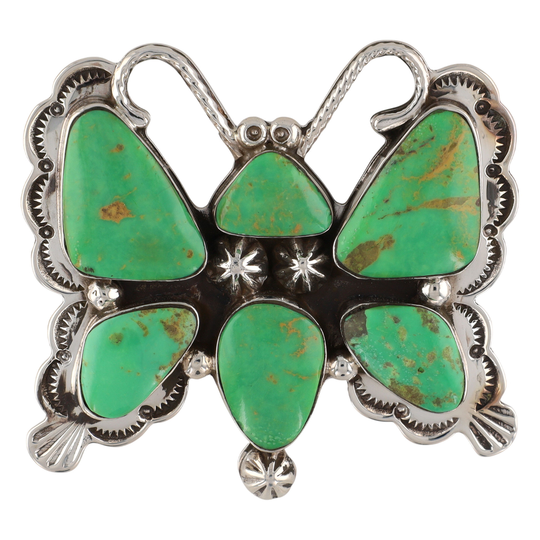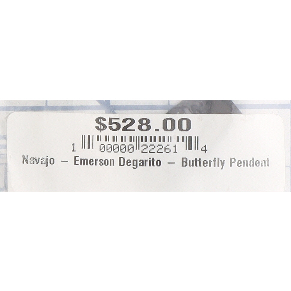 A Navajo sterling silver and turquoise butterfly-form pendant. The polished silver body is executed in a Southwestern style, with the front set with six irregularly shaped, cabochon-cut turquoise stones exhibiting natural brown matrix. The stones are bordered by scalloped edges and adorned with stamped details including small starburst motifs and dots. The reverse features a substantial bail for suspension and a stamped hallmark depicting a stylized animal figure above a partially legible "925" mark, indicating sterling silver. An accompanying label attributes the pendant to Navajo artist Emerson Degarito.