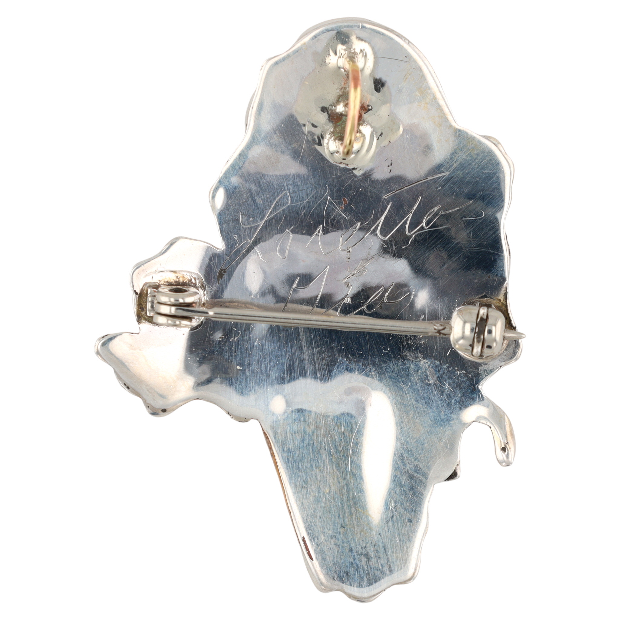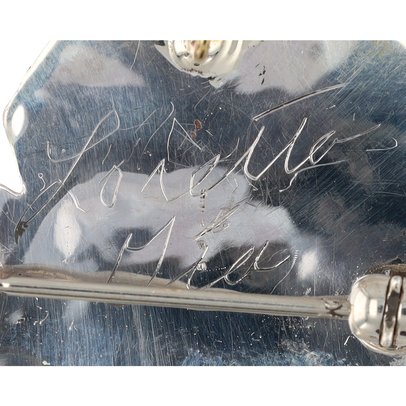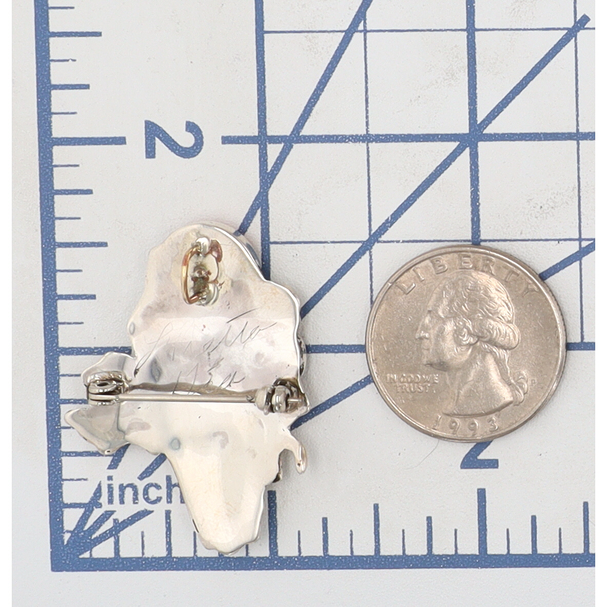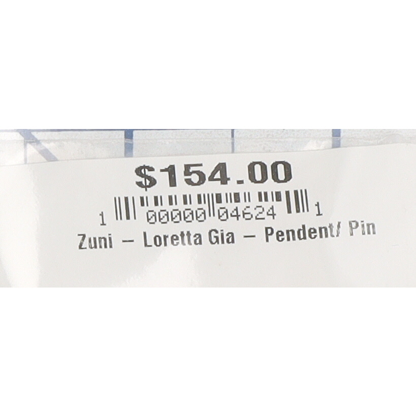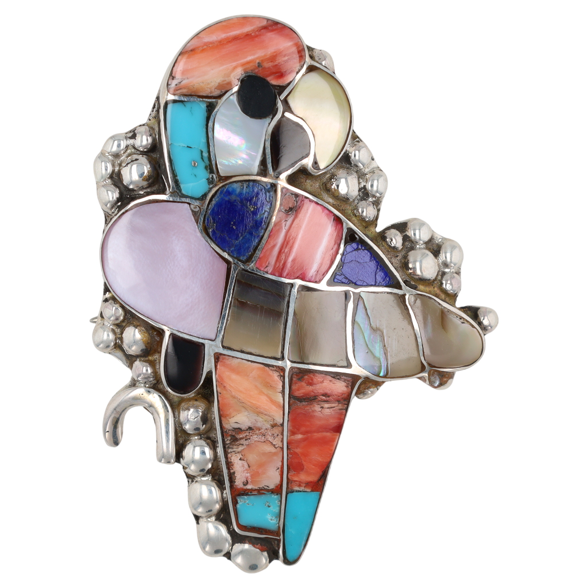 A Zuni sterling silver inlay brooch or pendant by Loretta Gia, crafted in the form of a parrot using a mosaic or channel inlay technique. The front features numerous intricately cut and fitted pieces of natural stone, spiny oyster, turquoise, mother of pearl, coral, lapis all set within a polished silver metal frame. The reverse side reveals a hinged pin stem with a safety clasp and a separate bale, allowing for wear as either a brooch or pendant. Engraved cursive script reading "Loretta Gia" is visible on the back, along with another word below it that appears to be "Zuni".
