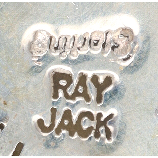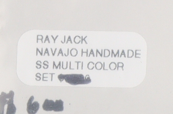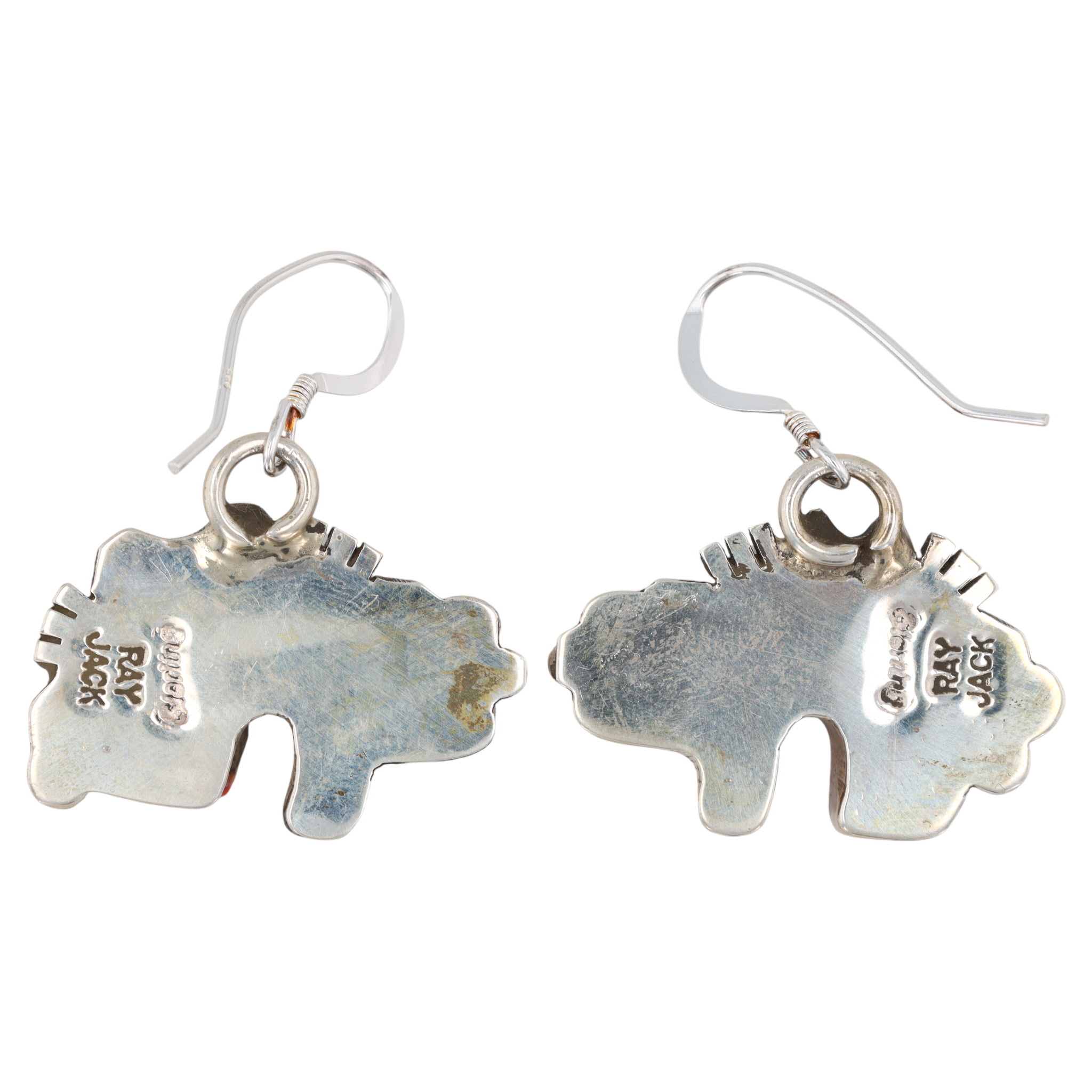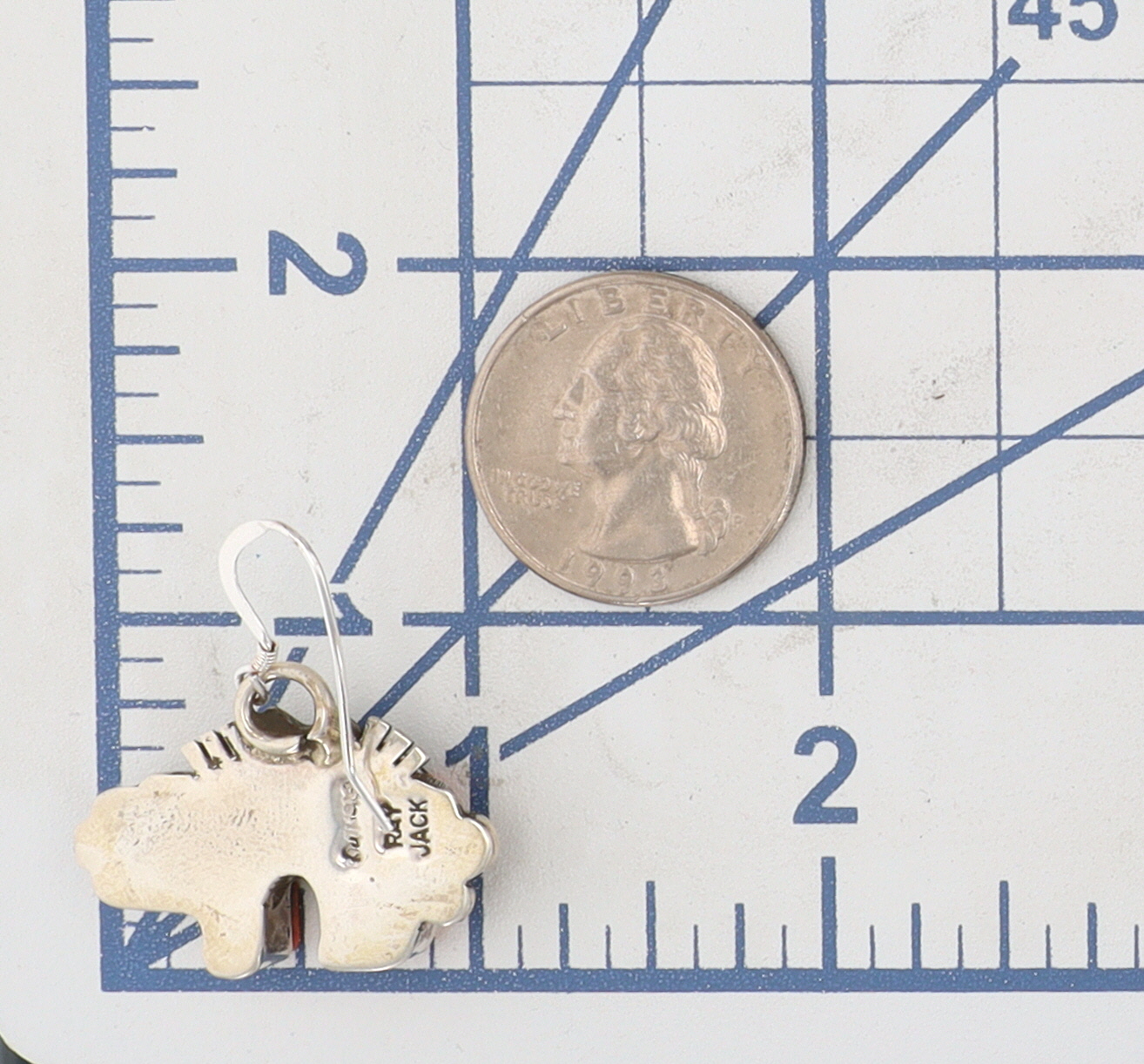 A pair of Ray Jack Navajo sterling silver multi-stone inlay bear earrings. Each earring is designed as a stylized bear fetish, crafted from sterling silver, featuring channel inlay with a predominant onyx field accented by horizontal bands of spiny oyster and vertical segments of turquoise/malachite. The earrings are fitted with wire hooks. The reverse of each earring is stamped with the marks "Sterling" and "RAY JACK". An accompanying label further identifies the maker as "RAY JACK" and notes the item as "NAVAJO HANDMADE SS MULTI COLOR SET".