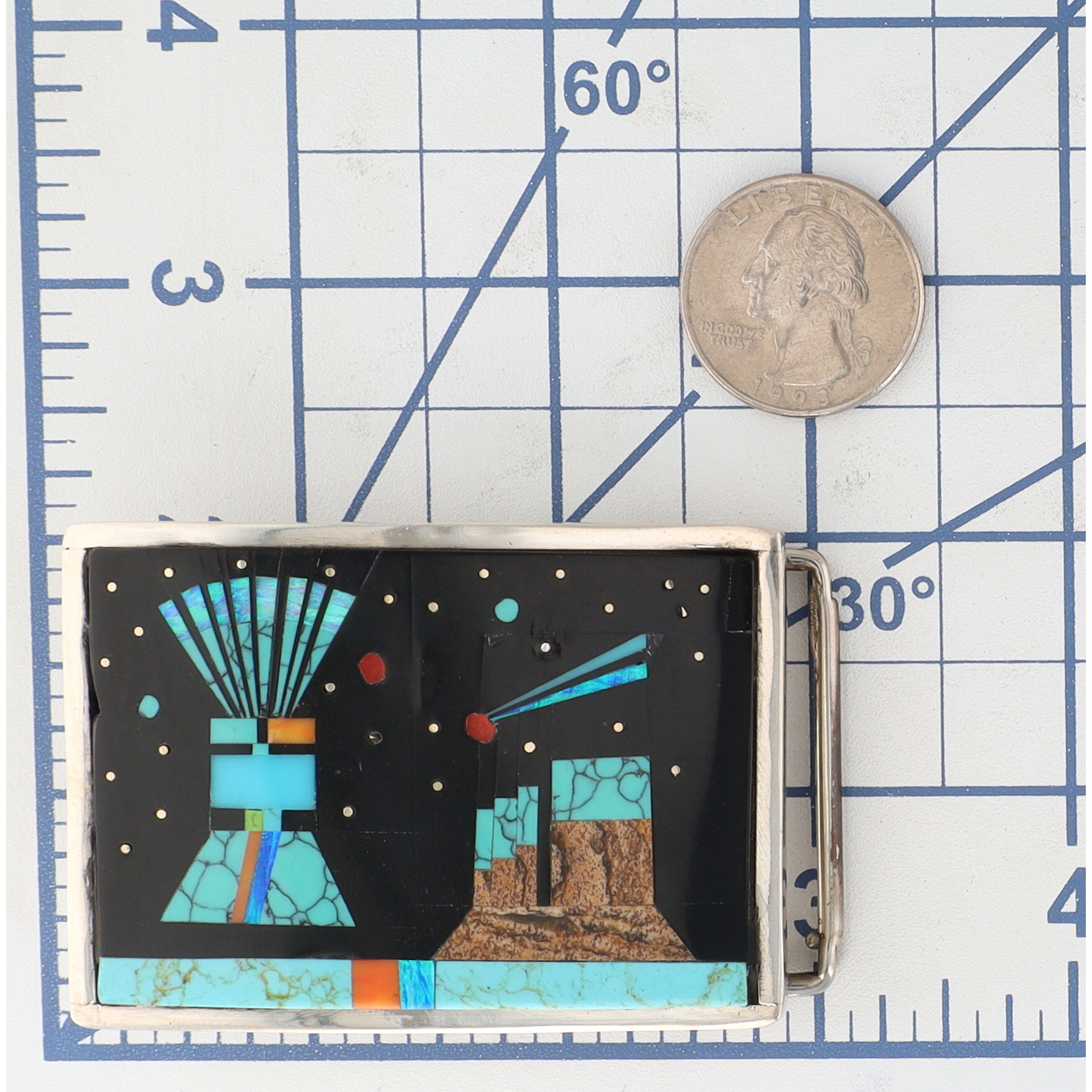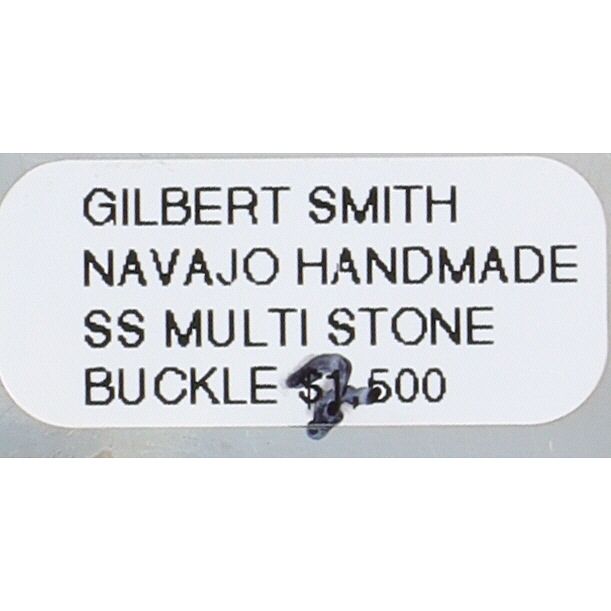 A Gilbert Smith Navajo sterling silver and multi-stone micro inlay belt buckle. This rectangular buckle features a vibrant multi-stone inlay on its front surface. The intricate design, executed primarily in a channel inlay style, depicts a stylized landscape or celestial scene against a onyx. Inlaid materials include various shades of turquoise, iridescent opal, reddish-orange spiny oyster, and textured picture jasper, arranged to form abstract architectural or geological shapes, radiating lines, and scattered dots. The reverse of the buckle is marked "Sterling" and bears the initials "GS".