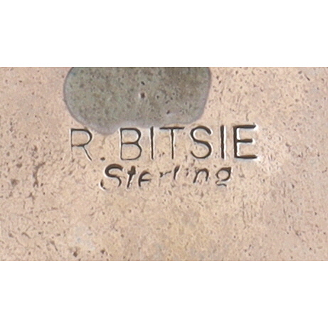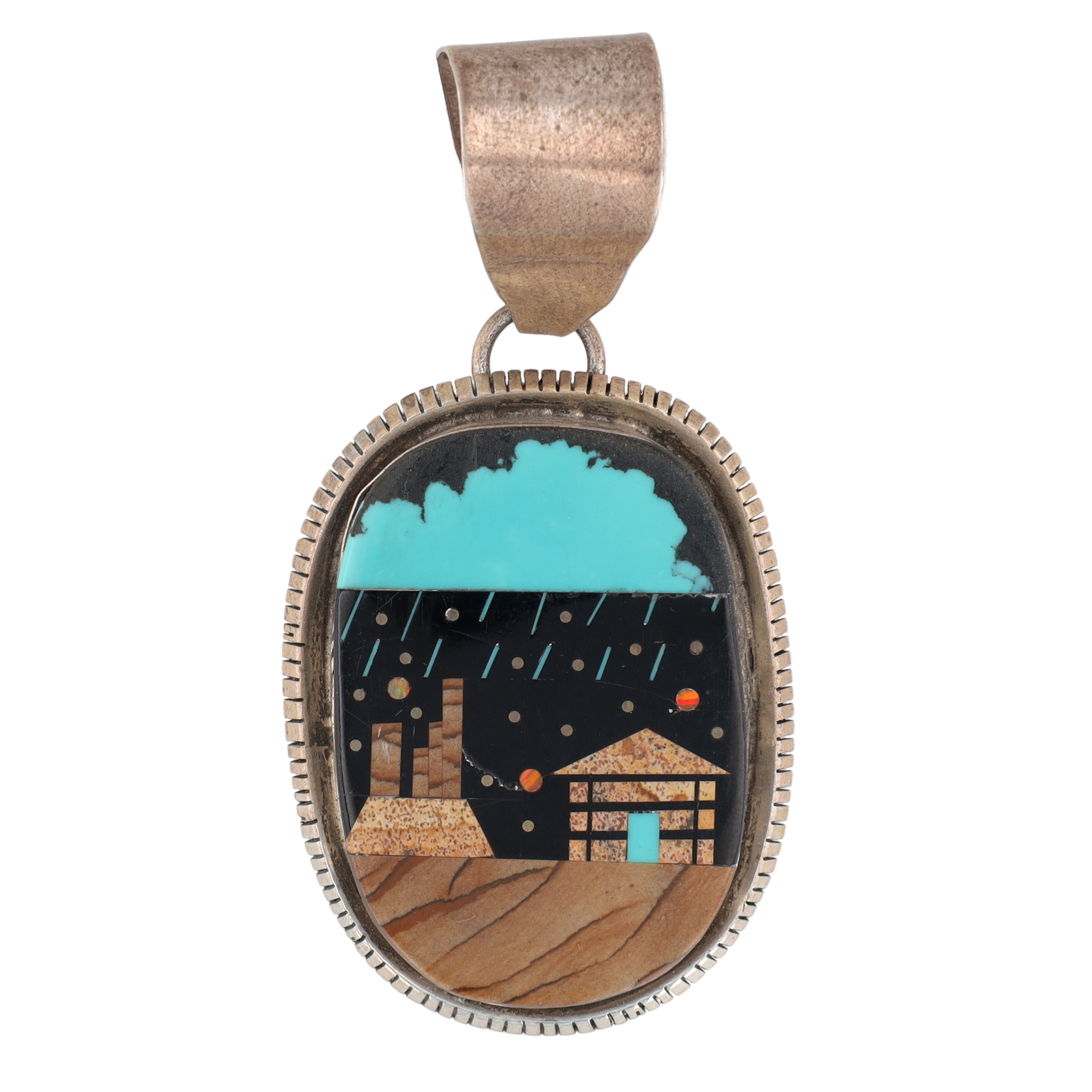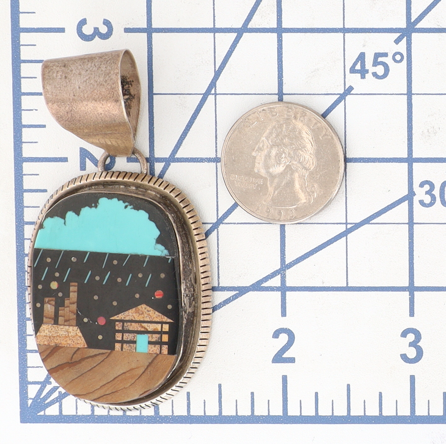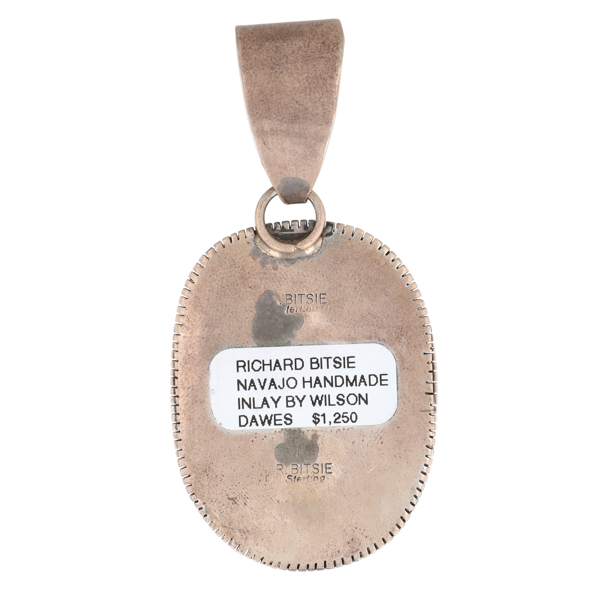 A Navajo sterling silver inlay pendant by Richard Bitsie and inlay by Wilson Dawes. This oval-shaped pendant features an intricate multi-stone inlay depicting a landscape scene. The inlay utilizes bright blue turquoise for a cloud, a onyx for the sky with smaller white, red, and orange inlaid elements suggesting, and striated picture josper forming the ground. Two structures, one appearing as a building and the other a tower-like form, are inlaid on the ground using tan, black, and light blue stones. The silver setting includes a textured border and a broad bail. The reverse of the pendant is stamped "R. BITSIE Sterling" and retains a white sticker label that reads "RICHARD BITSIE NAVAJO HANDMADE INLAY BY WILSON DAWES $1,250".