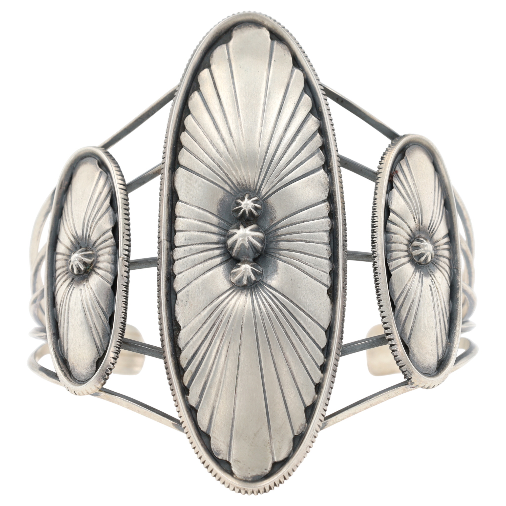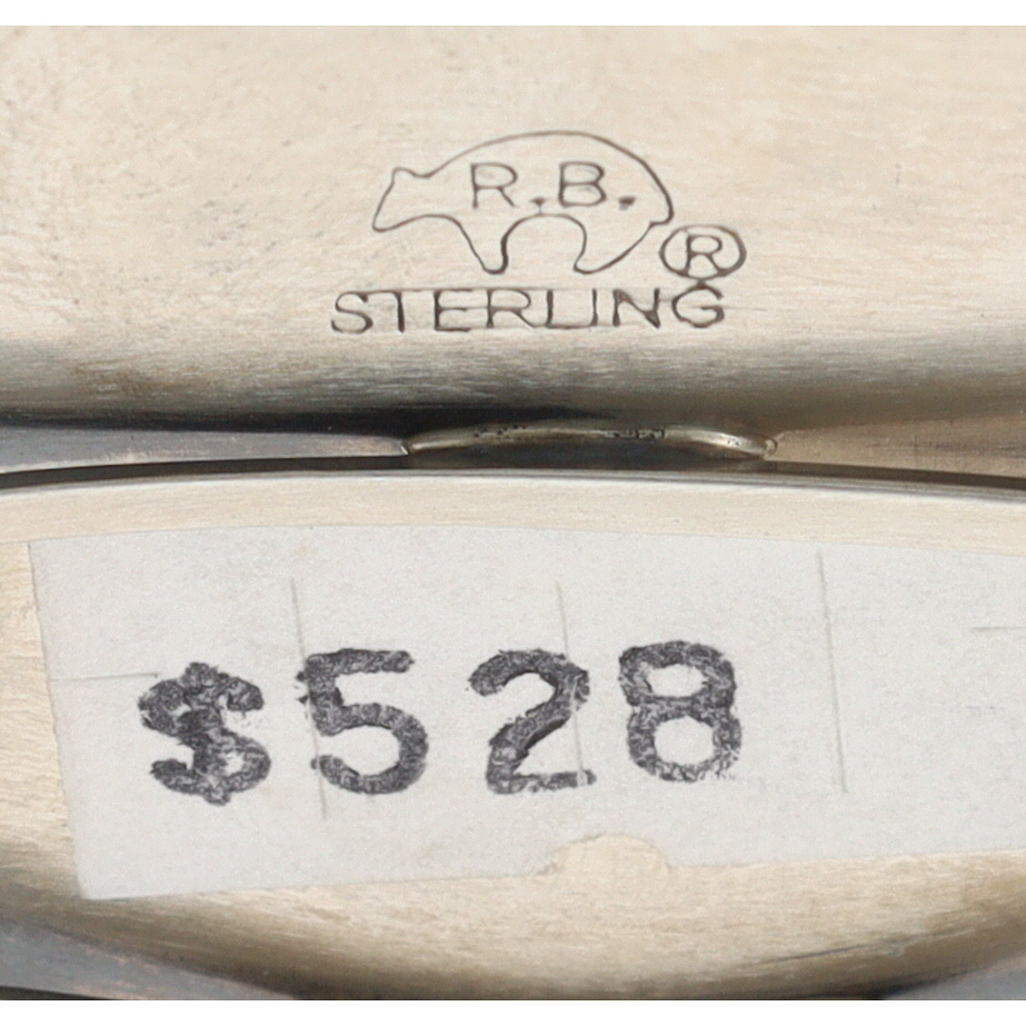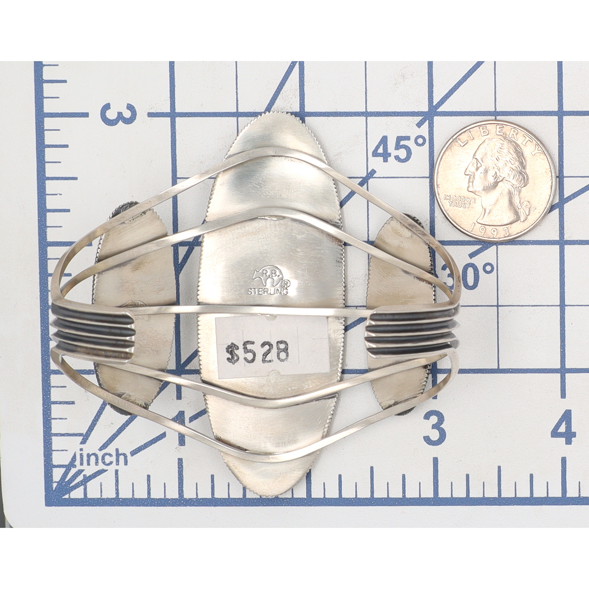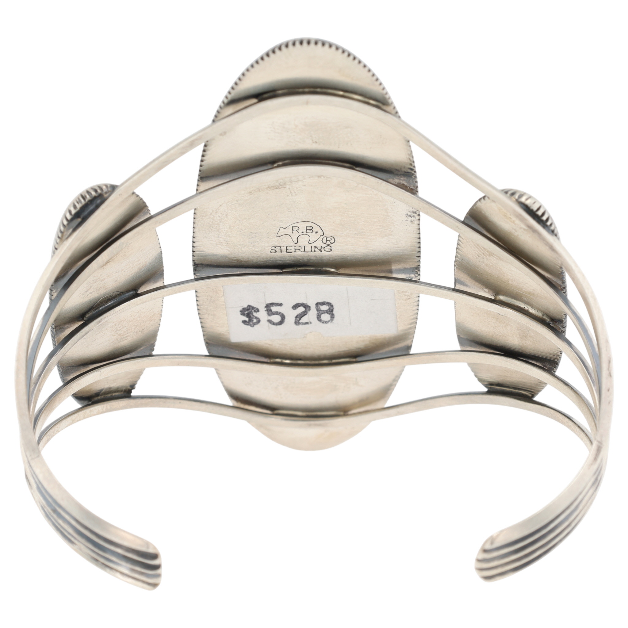 A Navajo sterling silver cuff bracelet featuring a prominent central elongated oval panel flanked by two smaller similar panels. All panels are adorned with a radiating fan-like motif and raised decorative elements, with three on the central panel and one on each flanking panel. The panels are set atop a multi-wire cuff. The reverse of the central panel is marked "R.B." within a stylized bear outline indicative of Running Bear Shop, with "STERLING" and a registered trademark symbol below it. A sticker displaying "$528" is present on the reverse.