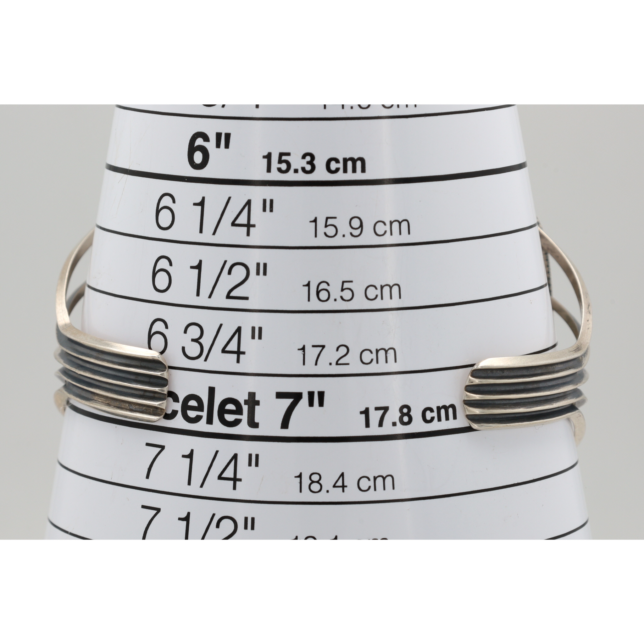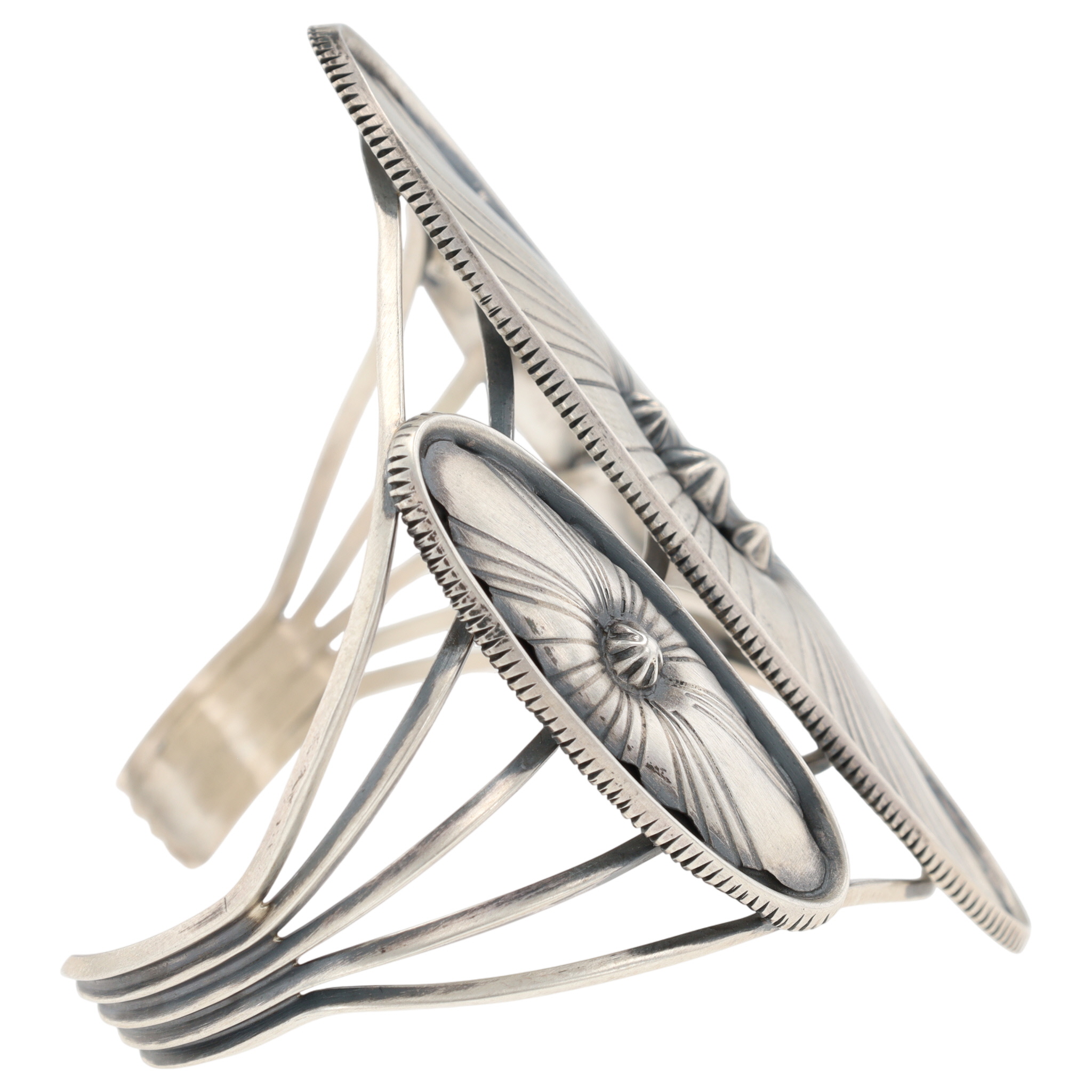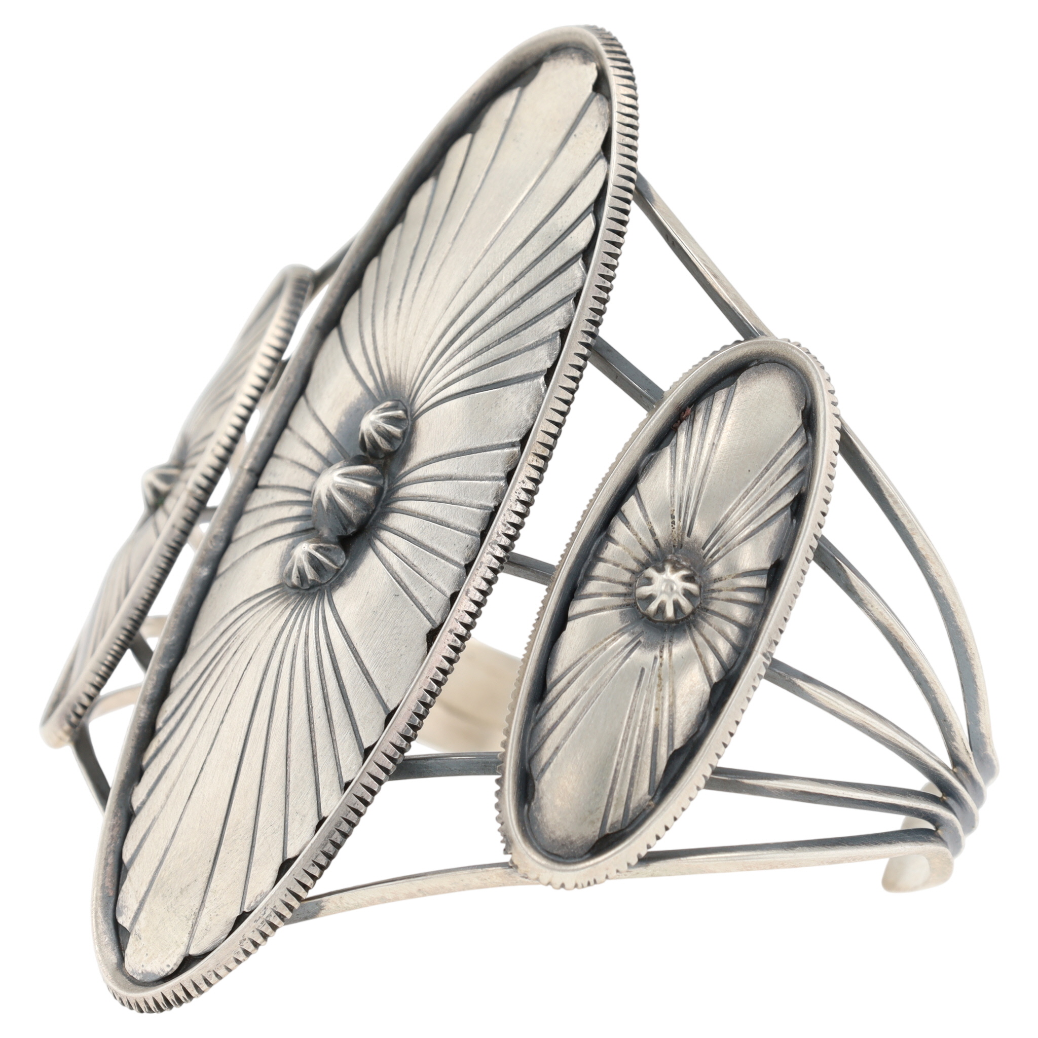 A Navajo sterling silver cuff bracelet featuring a prominent central elongated oval panel flanked by two smaller similar panels. All panels are adorned with a radiating fan-like motif and raised decorative elements, with three on the central panel and one on each flanking panel. The panels are set atop a multi-wire cuff. The reverse of the central panel is marked "R.B." within a stylized bear outline indicative of Running Bear Shop, with "STERLING" and a registered trademark symbol below it. A sticker displaying "$528" is present on the reverse.