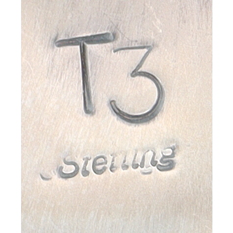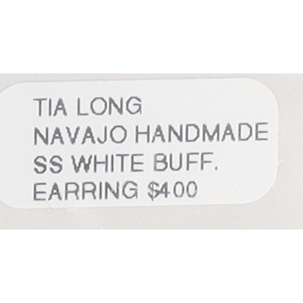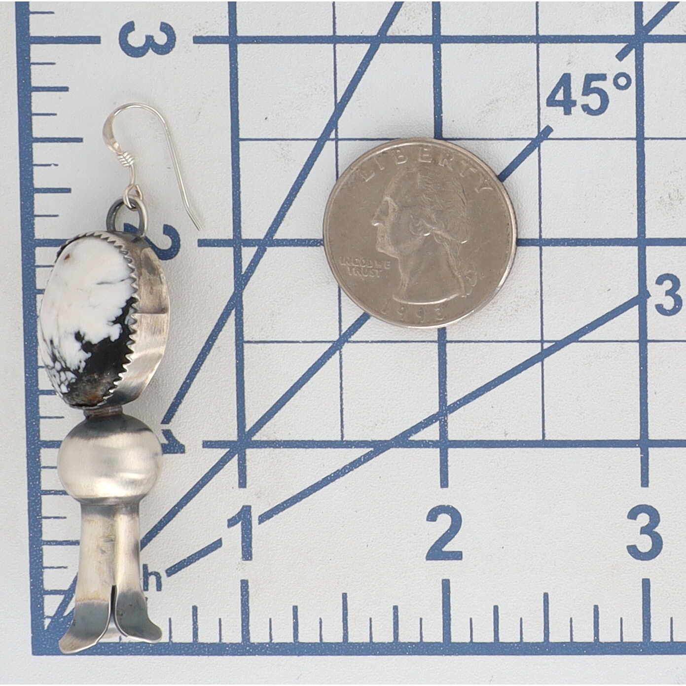 A pair of Navajo sterling silver squash blossom drop earrings by artist Tia Long, featuring oval cabochon white buffalo stones. Each earring is crafted with a silver-toned metal setting, stamped "Sterling" and bearing the "T3" mark on the reverse of the upper oval element, consistent with the work of Tia Long. The upper portion is set with an oval cabochon stone, predominantly white with distinctive black and brown matrix veining. Below the stone, a spherical element transitions into a flared, trumpet-shaped drop.