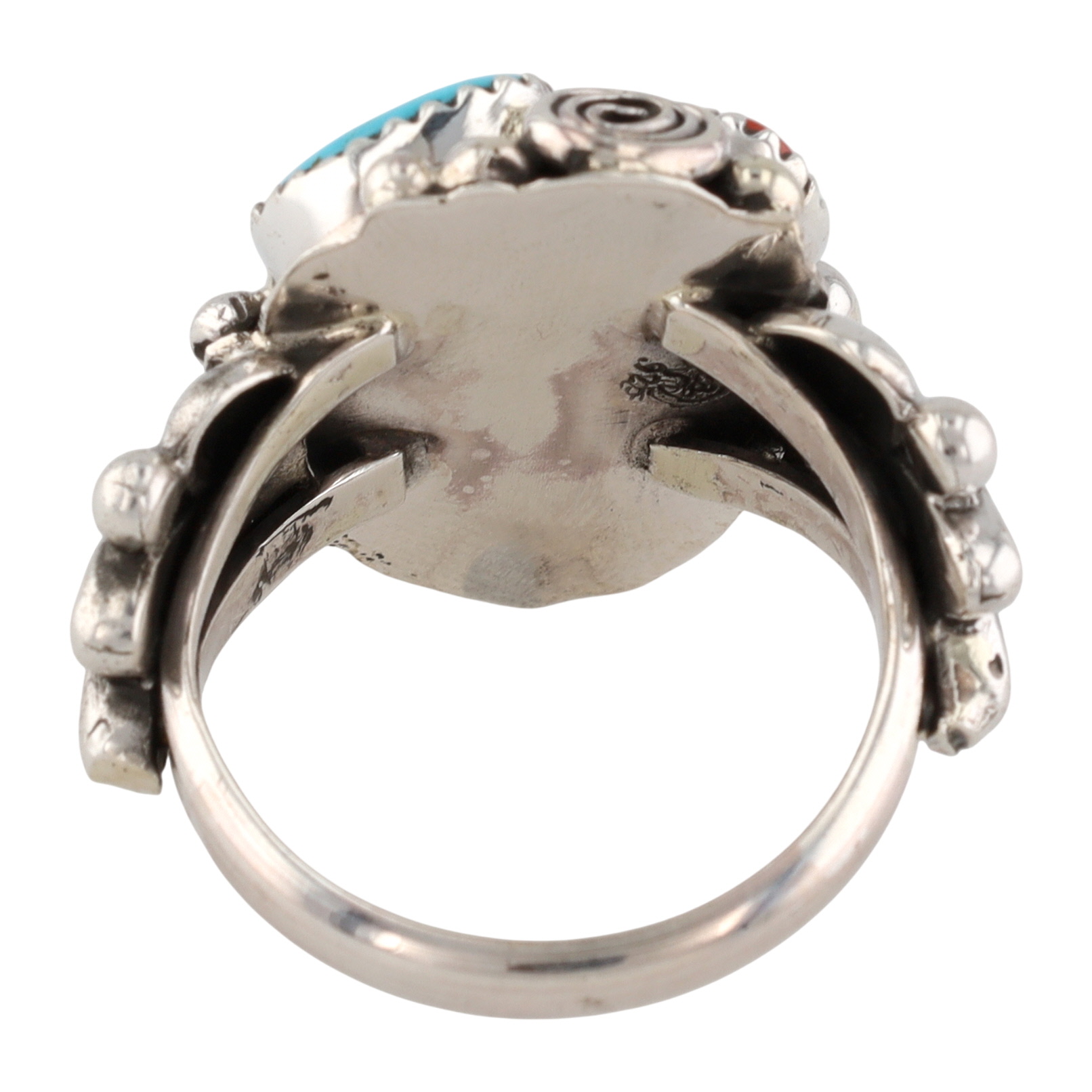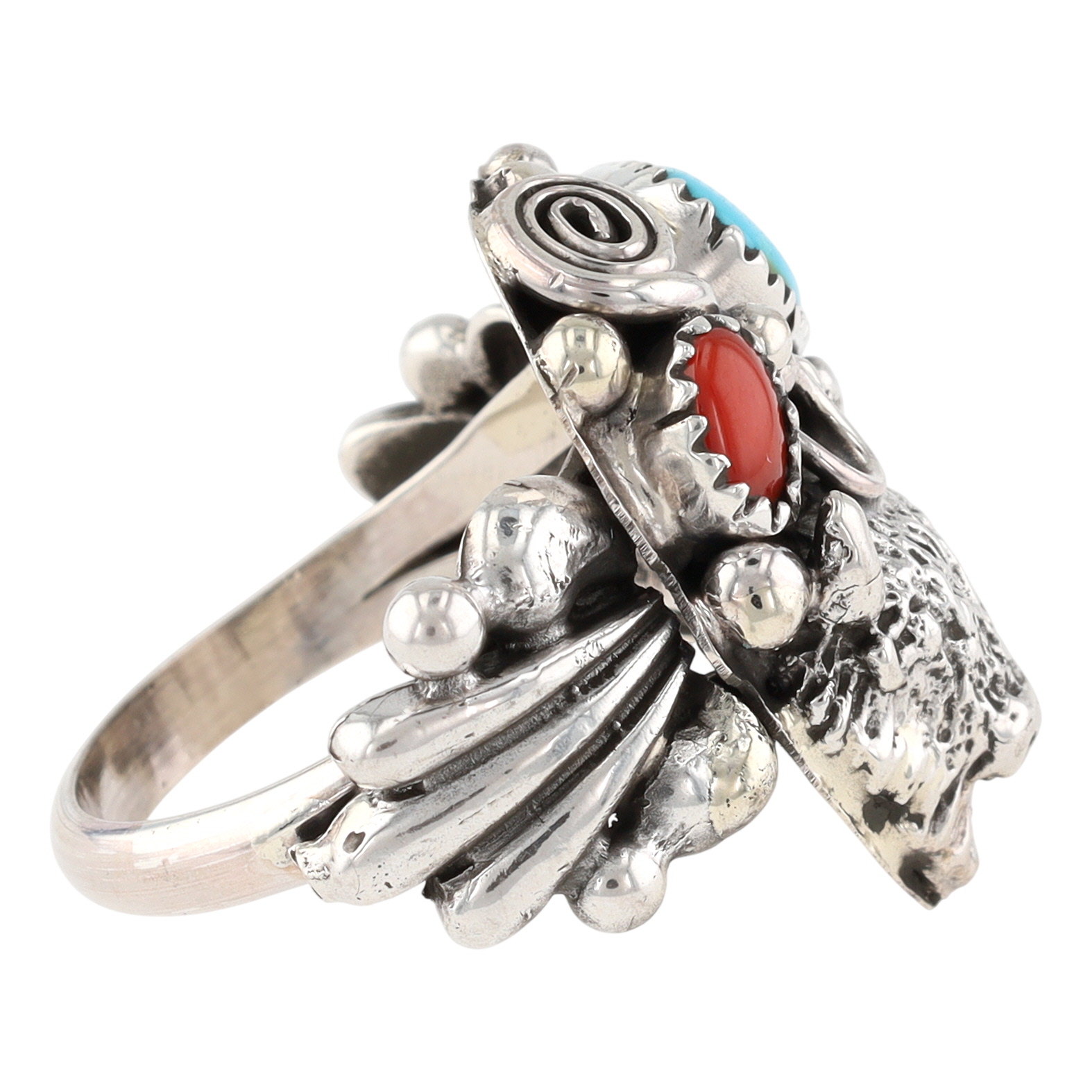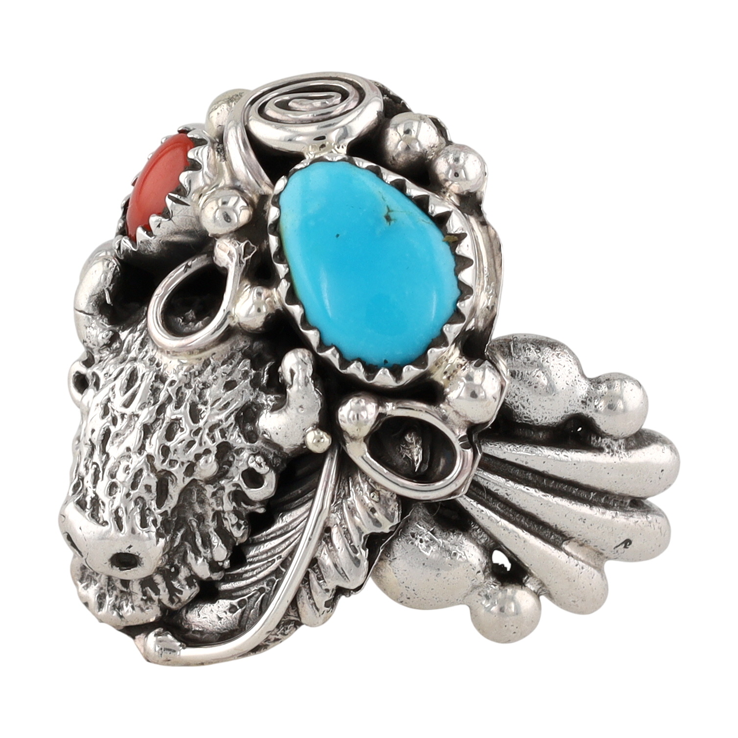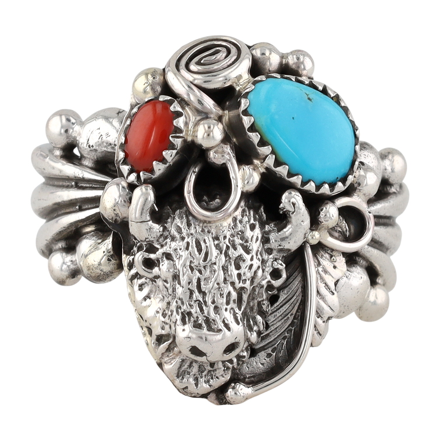 Jeanette Saunders Navajo Sterling Turquoise Coral Bison Head Ring