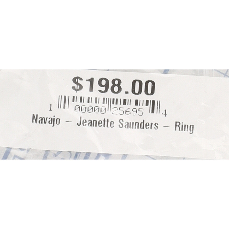 This Navajo ring by Jeanette Saunders, is crafted from silver, featuring a central design of a textured bison or buffalo head. It is accented by two oval cabochon stones, one light blue (consistent with turquoise) and one red-orange (consistent with coral), both set in serrated bezels. The design incorporates decorative elements such as scrollwork, applied silver beads, and stylized feather motifs. The overall style suggests Southwestern Native American craftsmanship. A blurry, stylized hallmark is visible on the interior of the band. An associated retail tag identifies the item as a "Navajo – Jeanette Saunders – Ring".