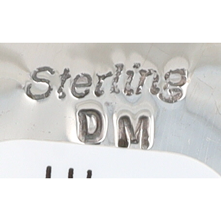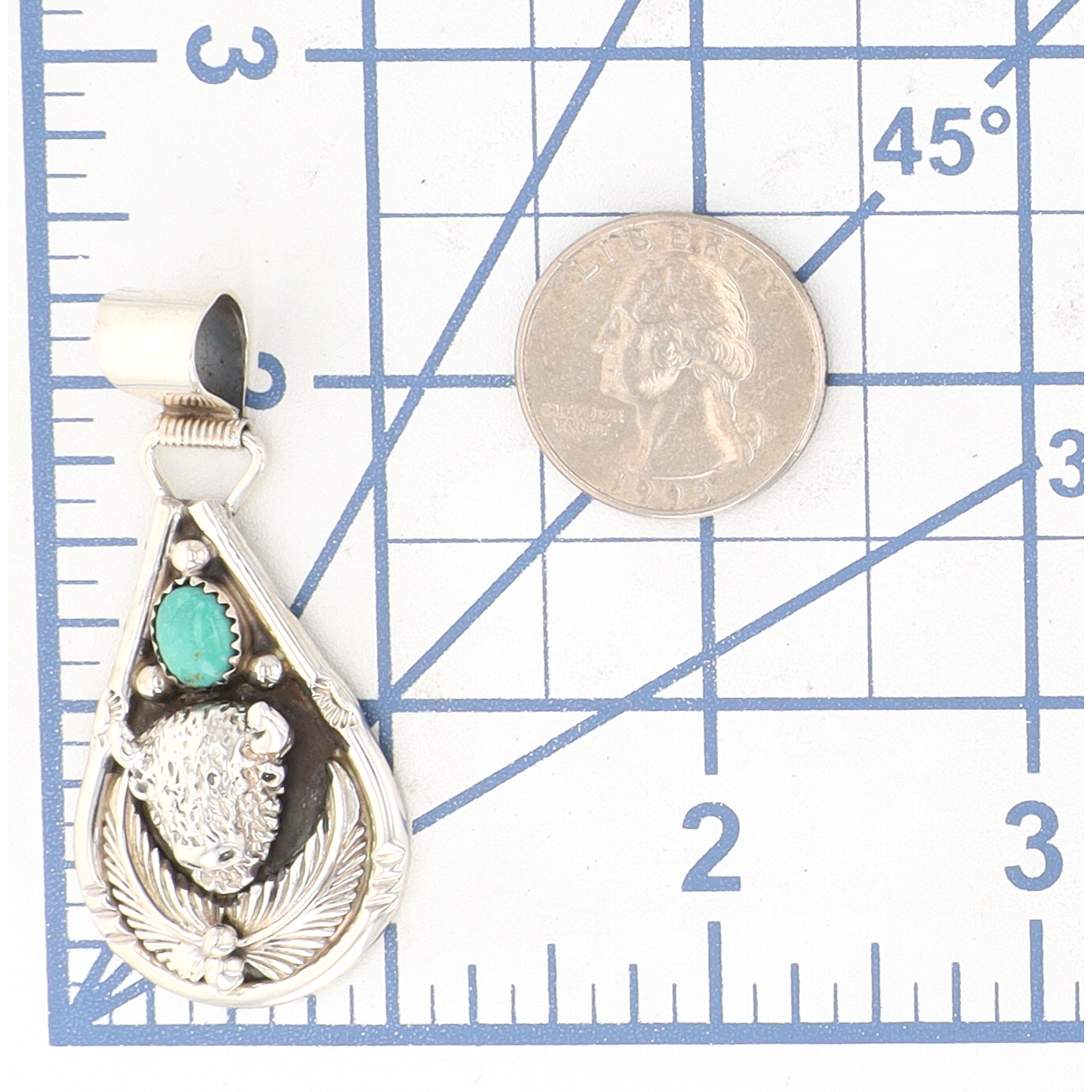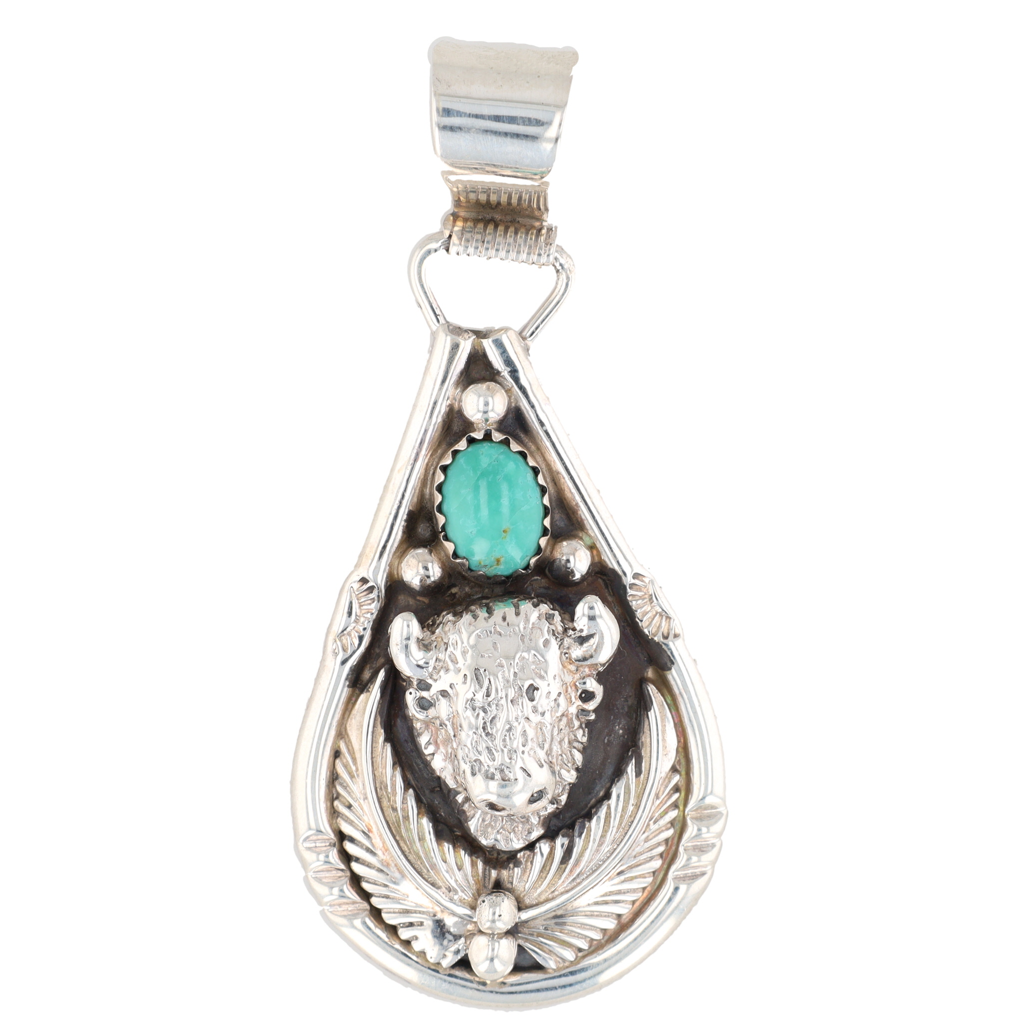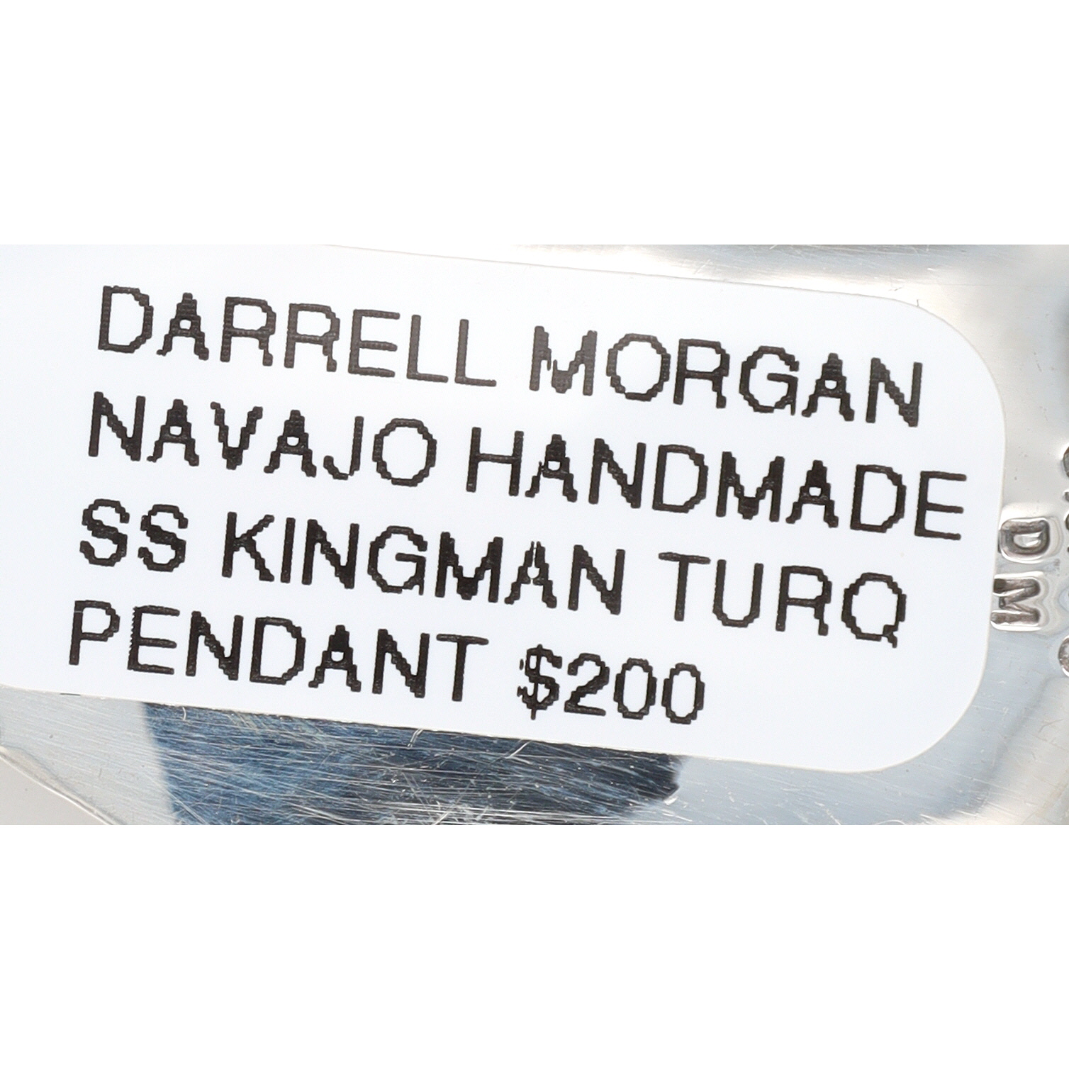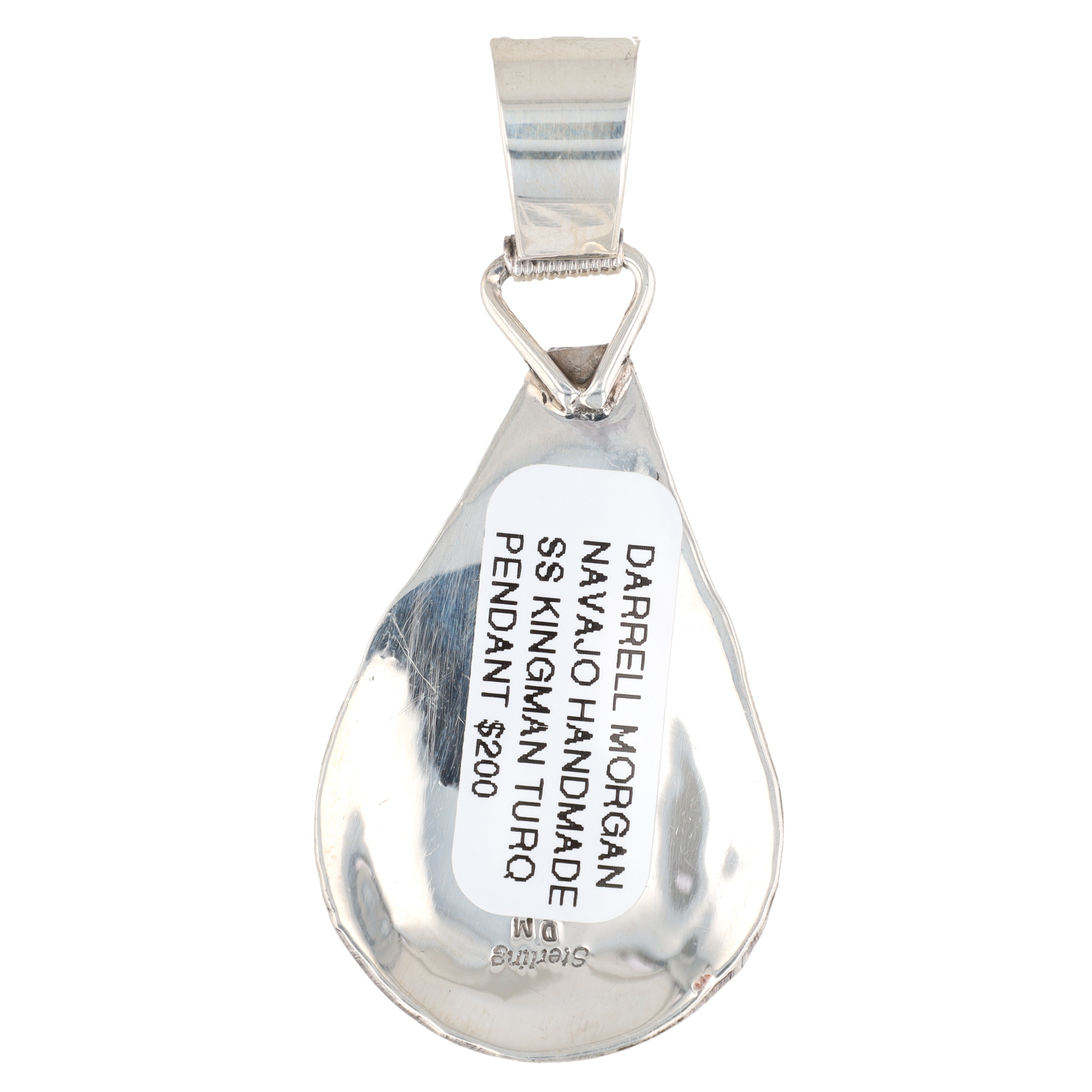 A Navajo sterling silver pendant by Darrell Morgan, featuring a central relief depiction of a buffalo head flanked by stylized feather motifs, surmounted by a small oval, bezel-set Kingman turquoise cabochon. The teardrop-shaped pendant is crafted from sterling silver. The reverse is stamped ‘Sterling’ and ‘DM’, consistent with the artist’s mark. An adhesive label on the reverse further identifies the piece as ‘DARRELL MORGAN NAVAJO HANDMADE SS KINGMAN TURQ PENDANT’.