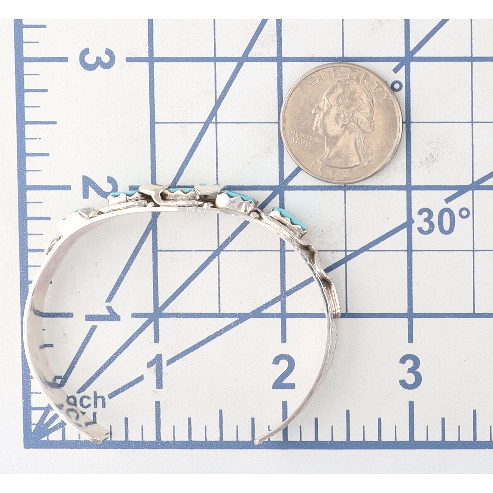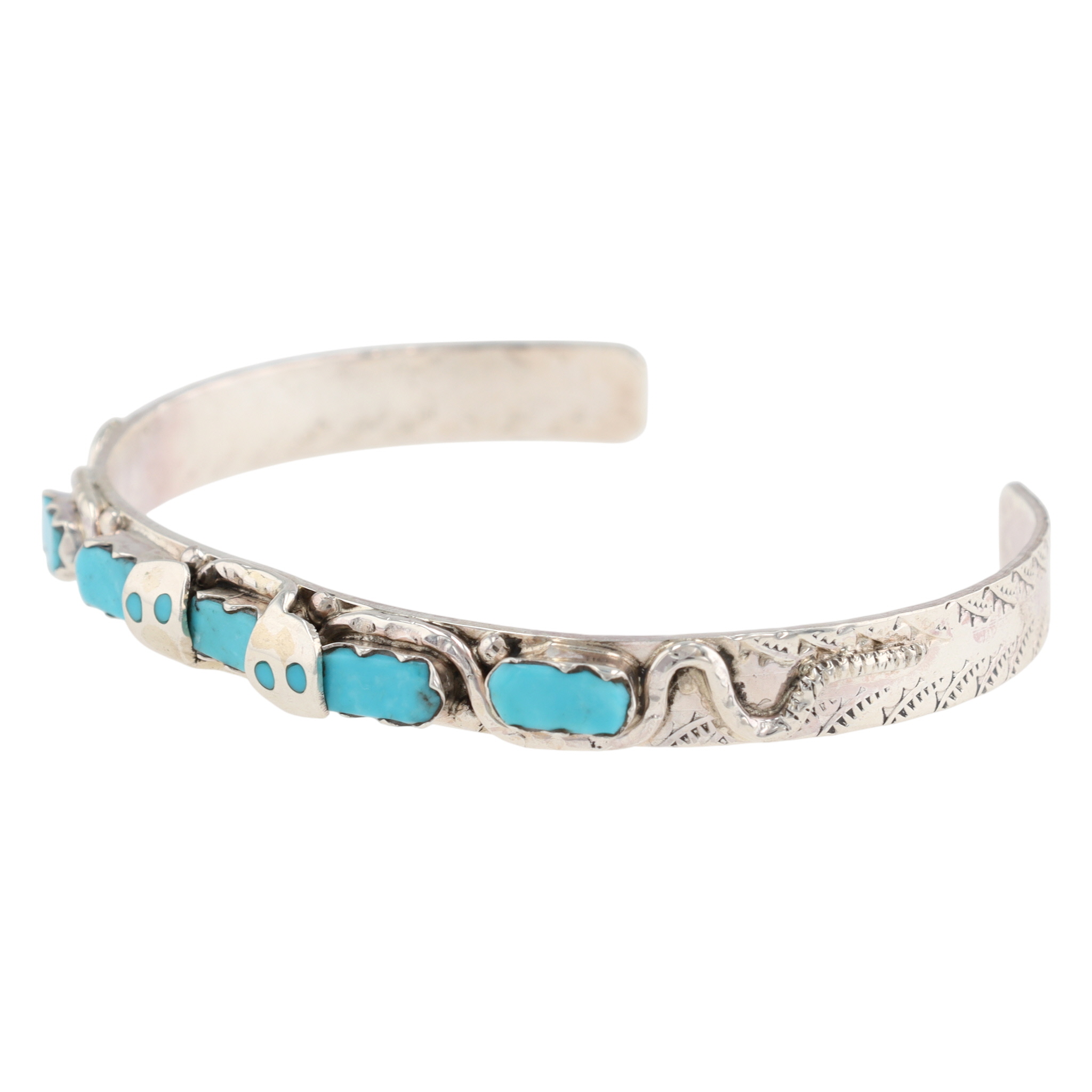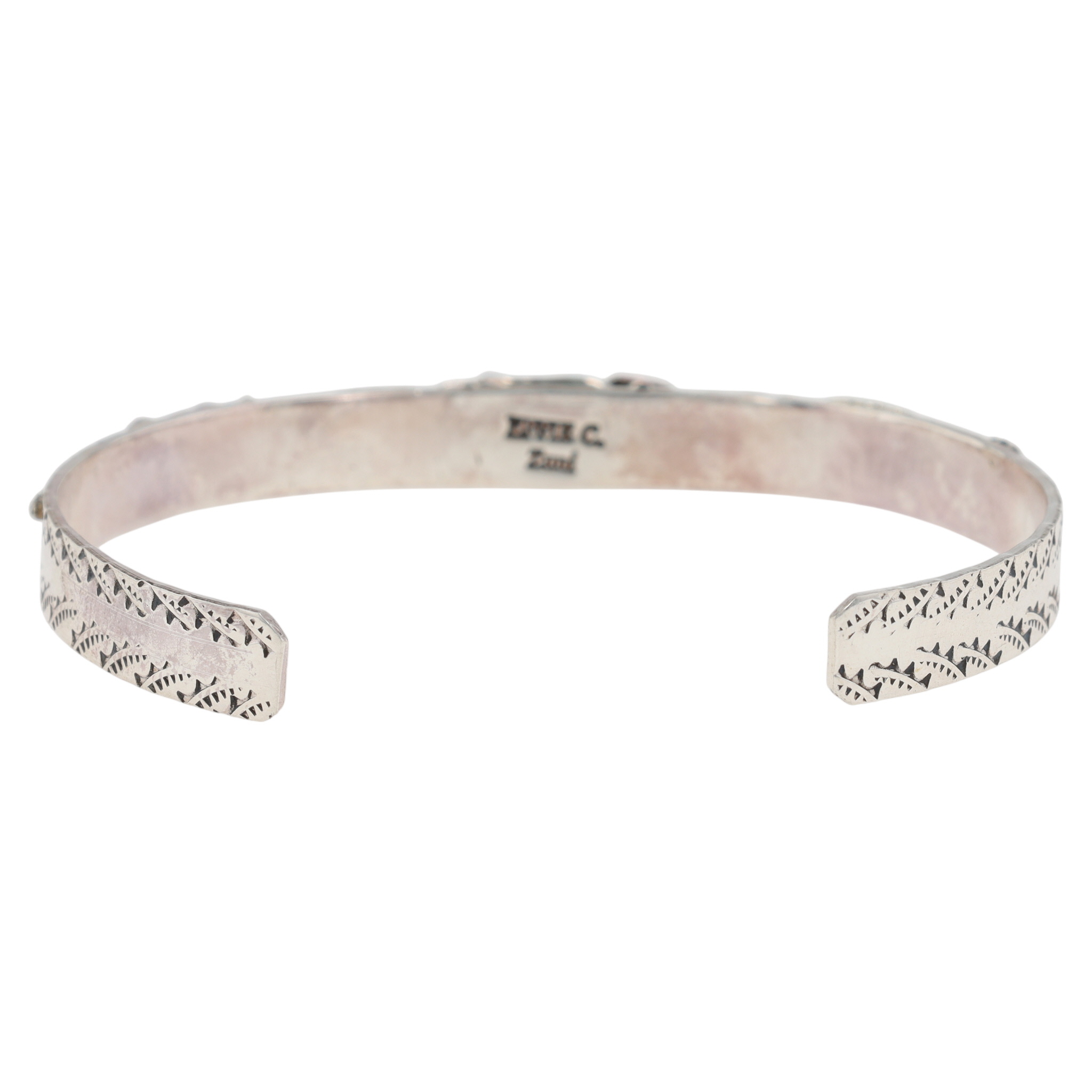 A Zuni sterling silver cuff bracelet by Joy Calavaza, daughter in law of Effie Calavaza. The central band features multiple bezel-set, polished turquoise-colored stones interspersed with stylized silver elements. The outer portions of the cuff are adorned with stamped geometric patterns and raised, textured motifs resembling serpents. The interior of the cuff is clearly stamped with "EFFIE C" above "Zuni".