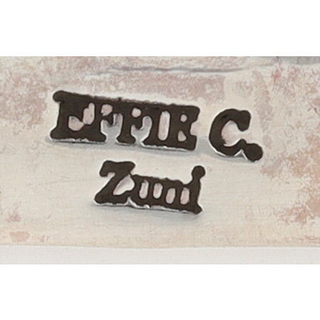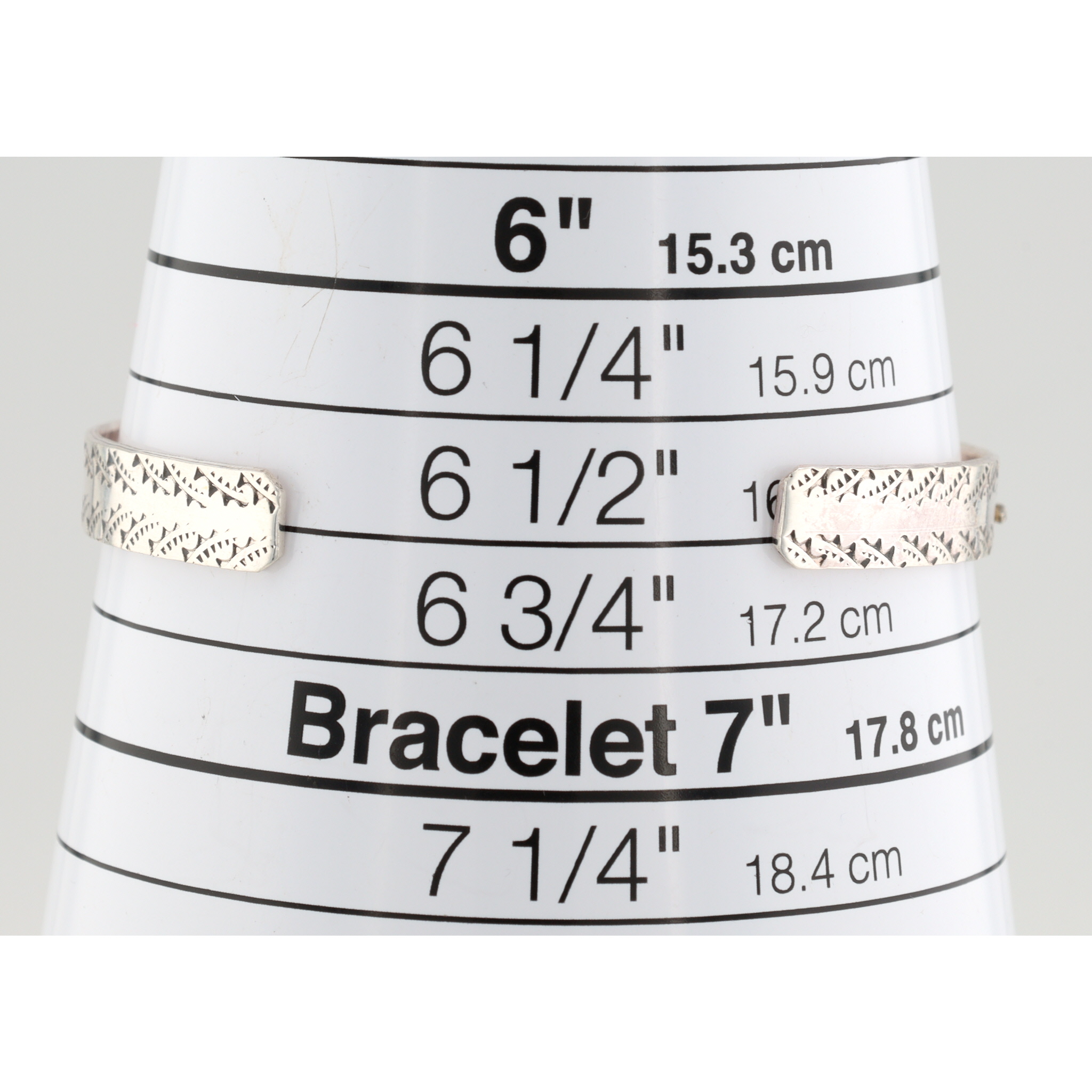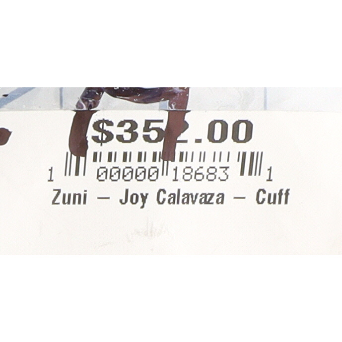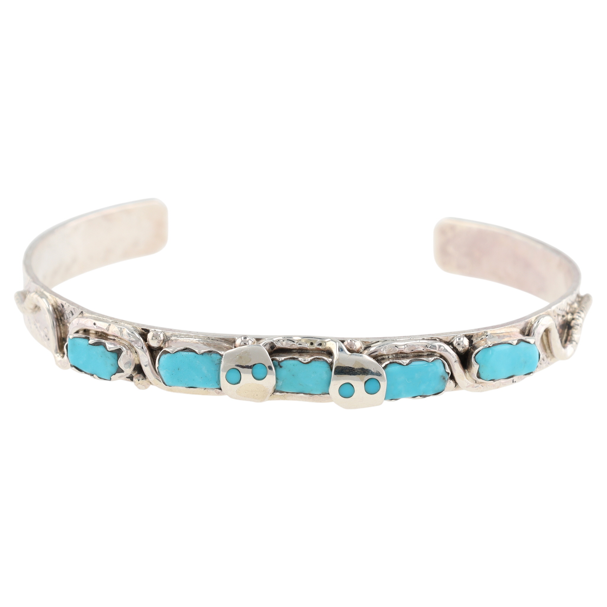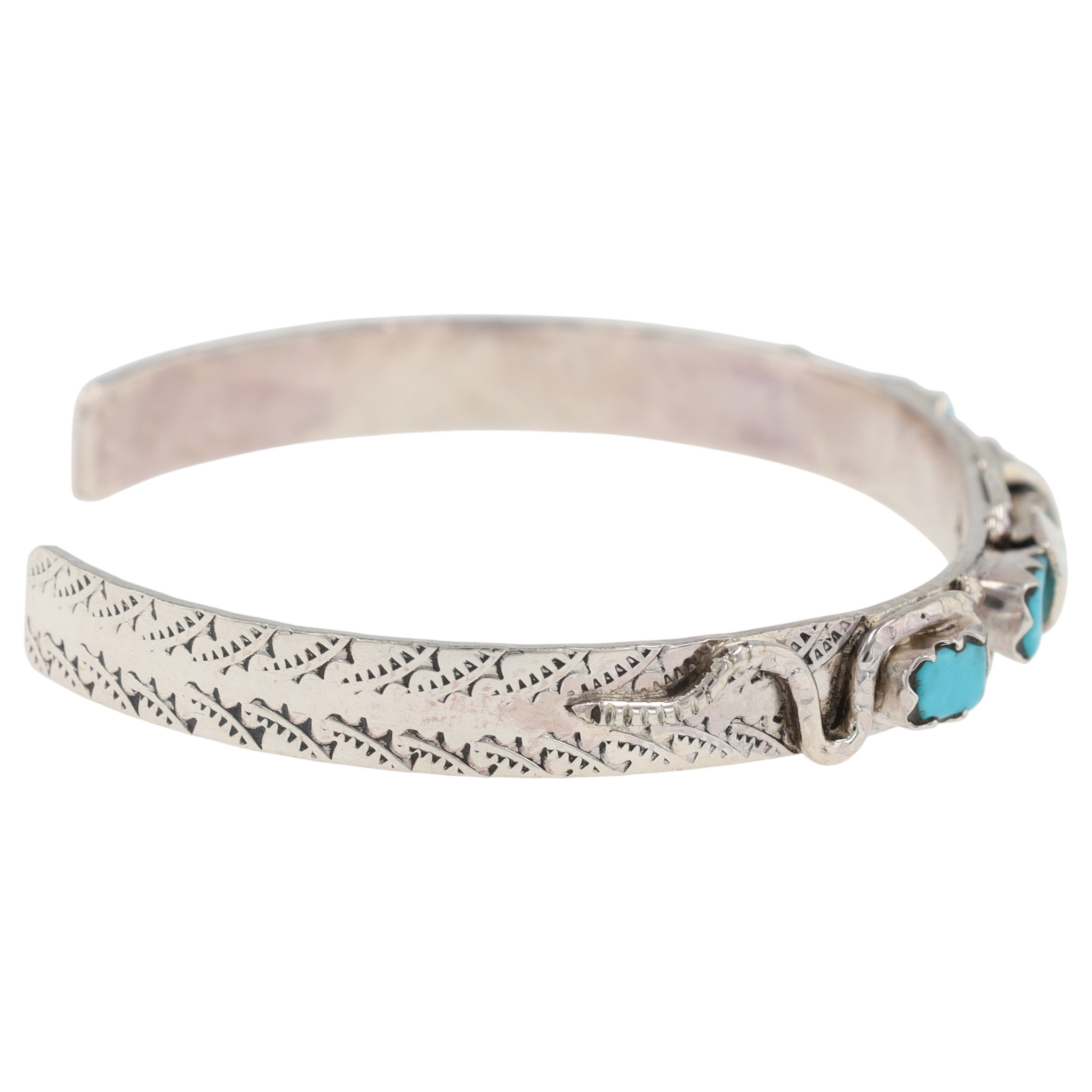 A Zuni sterling silver cuff bracelet by Joy Calavaza, daughter in law of Effie Calavaza. The central band features multiple bezel-set, polished turquoise-colored stones interspersed with stylized silver elements. The outer portions of the cuff are adorned with stamped geometric patterns and raised, textured motifs resembling serpents. The interior of the cuff is clearly stamped with "EFFIE C" above "Zuni".