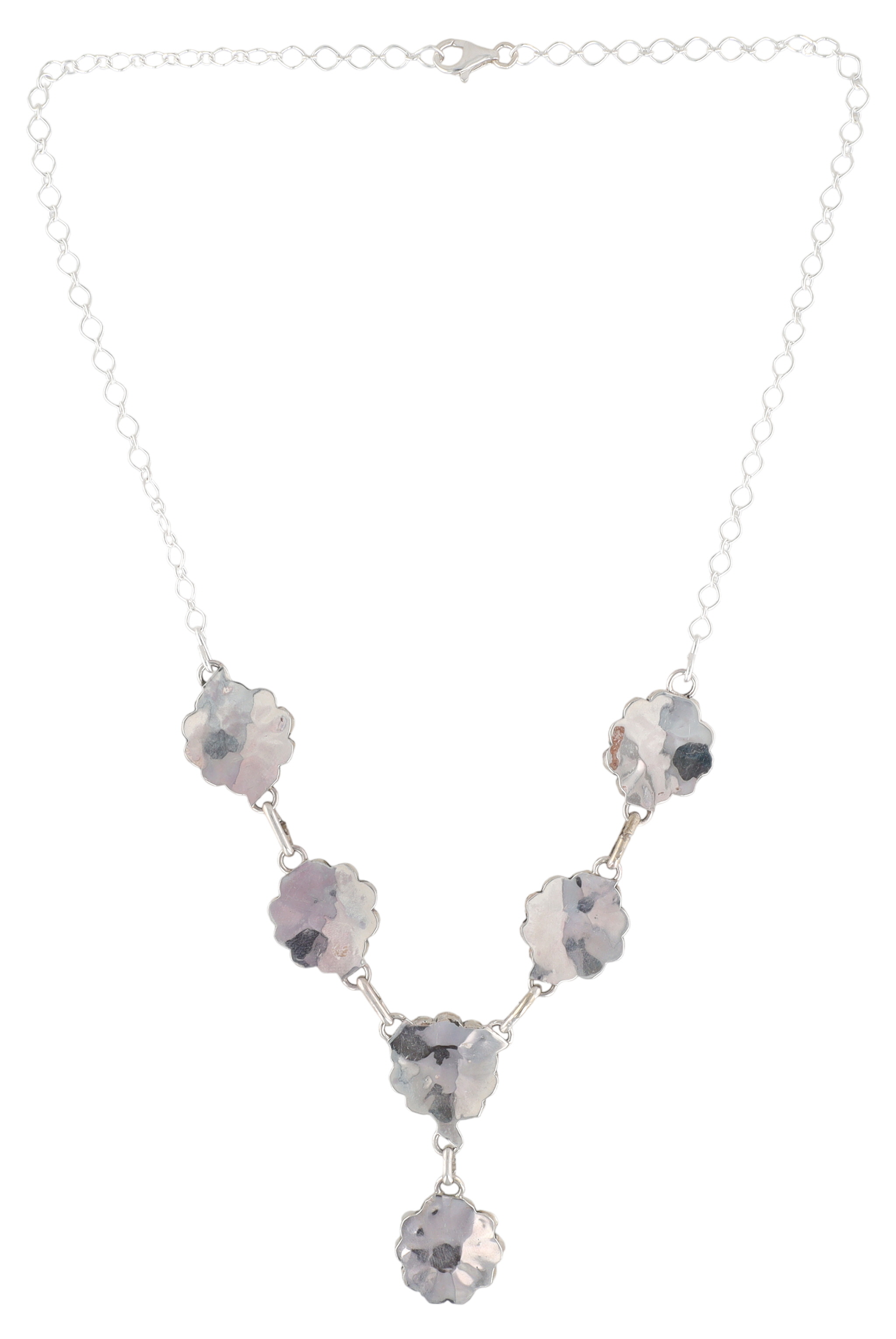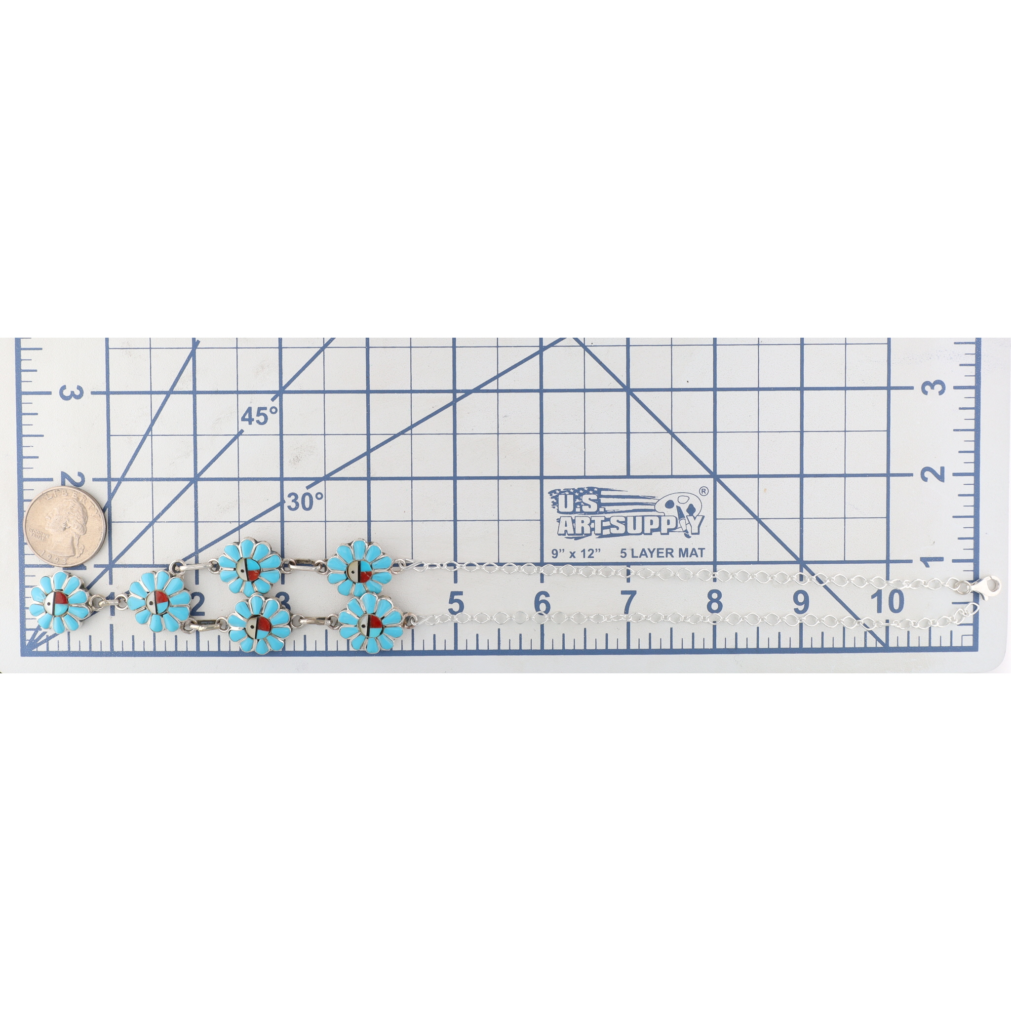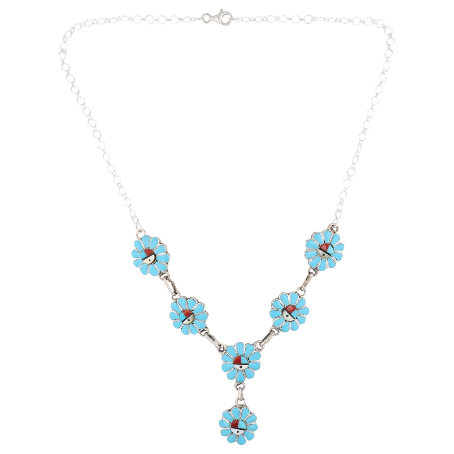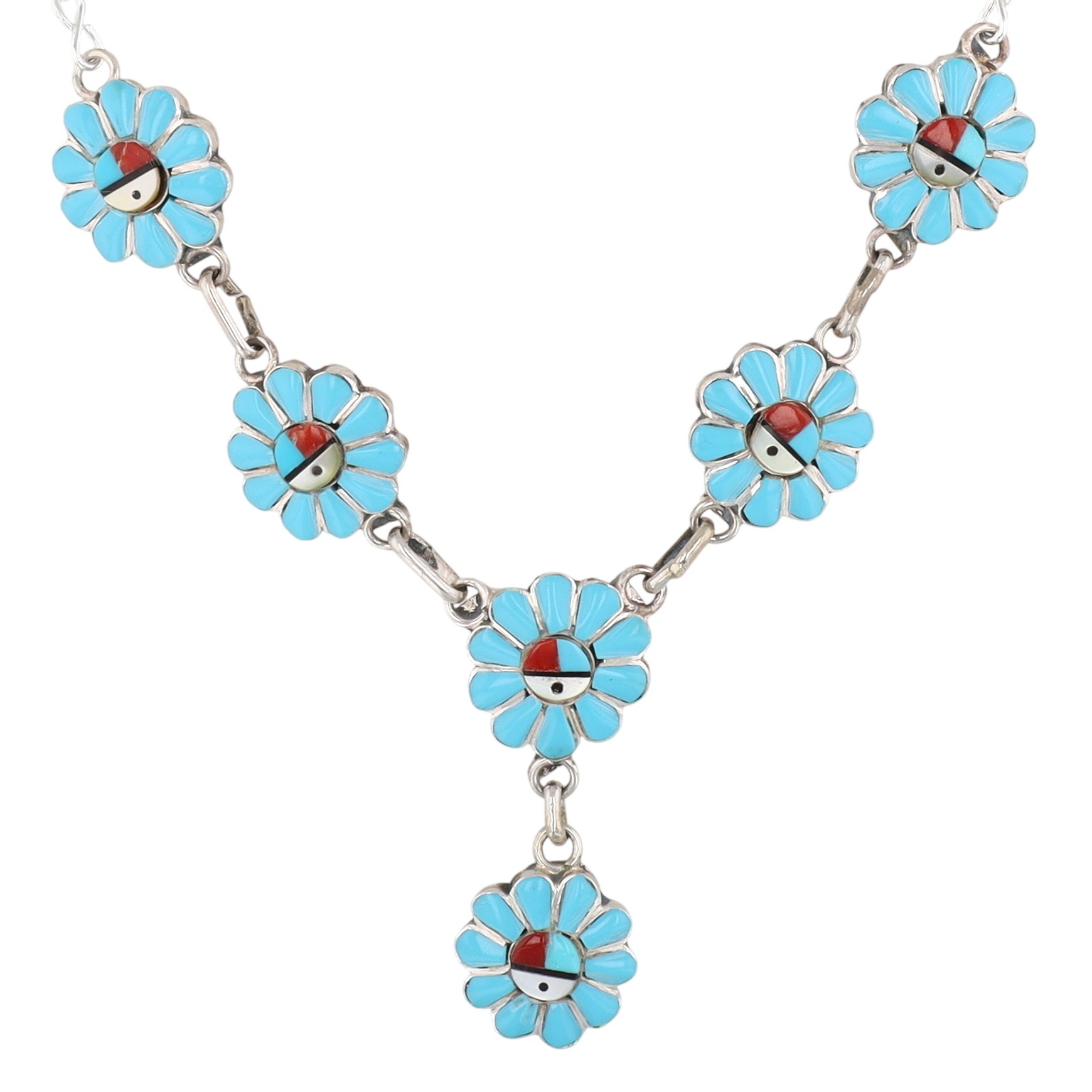 A Pauline Lonjose Zuni sterling silver inlay Sunface necklace. This necklace features an articulated string of six flower-shaped links, with a seventh similar link forming a central drop. Each floral element is inlaid with bright blue-green turquoise, forming petals around a central stylized Sunface motif. The Sunface motif depicts a vertically bisected face, with one half in white mother of pearl, a quarter in each turquoise and coral, with turquoise around the outside. A "925" mark is visible on the lobster clasp, confirming sterling silver construction.