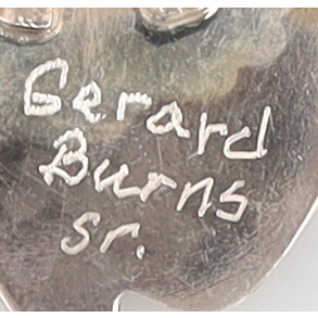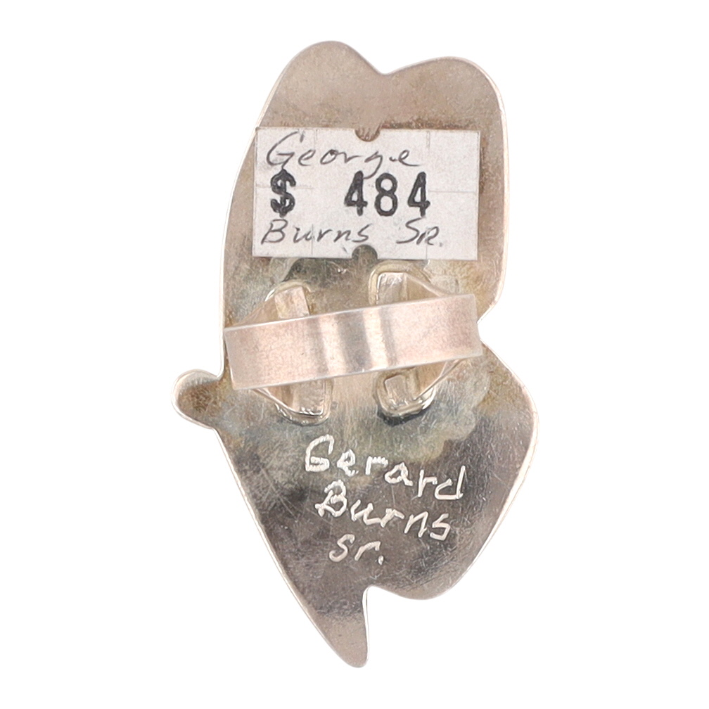 A large Zuni Native American sterling silver ring by Gerard Burs Sr., crafted in the form of a butterfly with a mosaic or channel inlay of numerous irregularly shaped light blue turquoise pieces. The silver-toned metal body features an engraved signature "Gerard Burns Sr." on the reverse of the butterfly form. A handwritten label misinforms as "George $484 Burns Sr." is also present on the reverse.