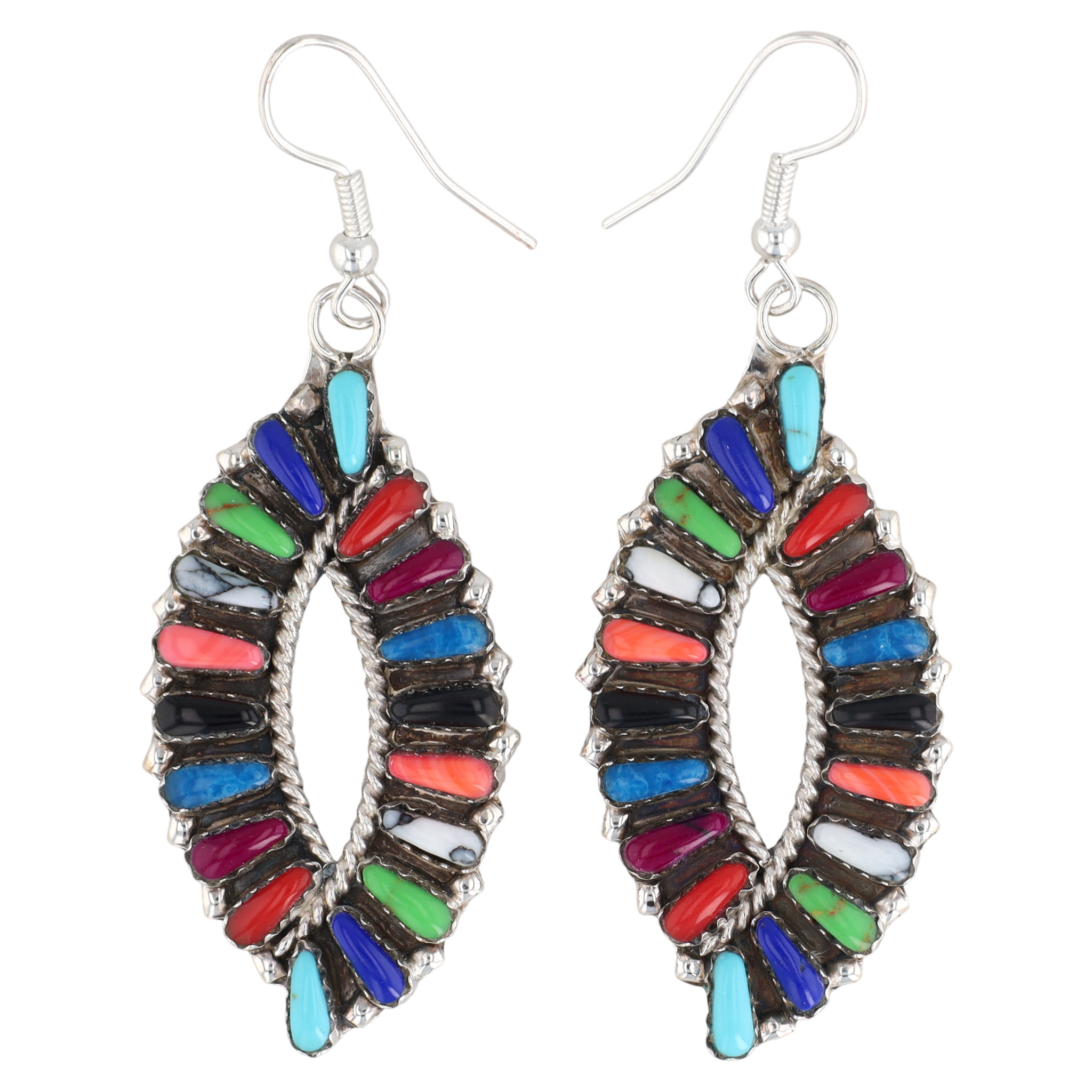 A pair of Tamara Benally Navajo sterling silver multi-stone cluster drop earrings. Each earring features an elongated ovoid form with an open center, adorned with numerous small, bezel-set cabochon stones. The stones, primarily in petit point shapes, display a variety of stones including turquoise, lapis, coral, gaspeite, white buffalo, denim lapis, spiny oyster, and purple stone, arranged along both the outer and inner perimeters. The metal setting exhibits an oxidized finish in recessed areas. Each earring is stamped ‘TB’ above ‘Sterling’ on the reverse.