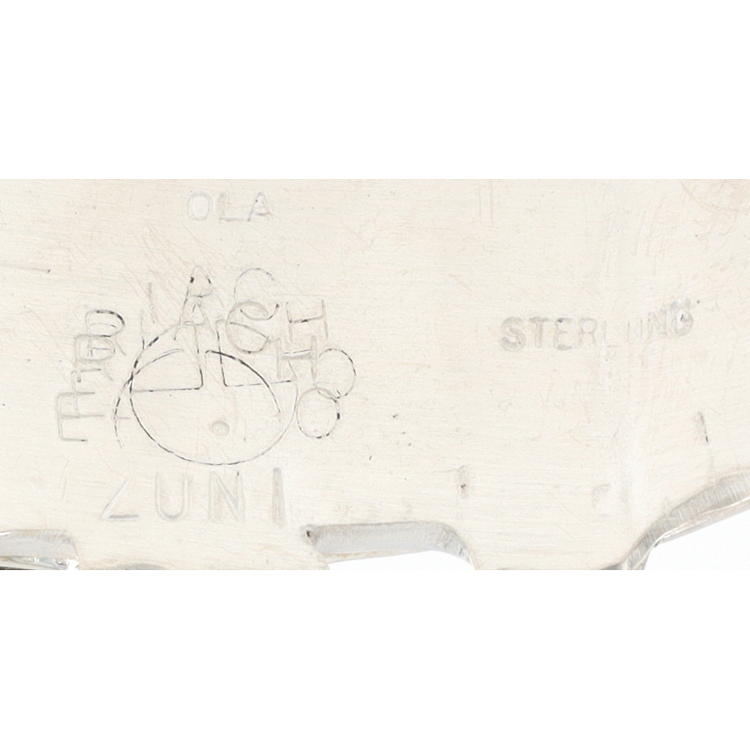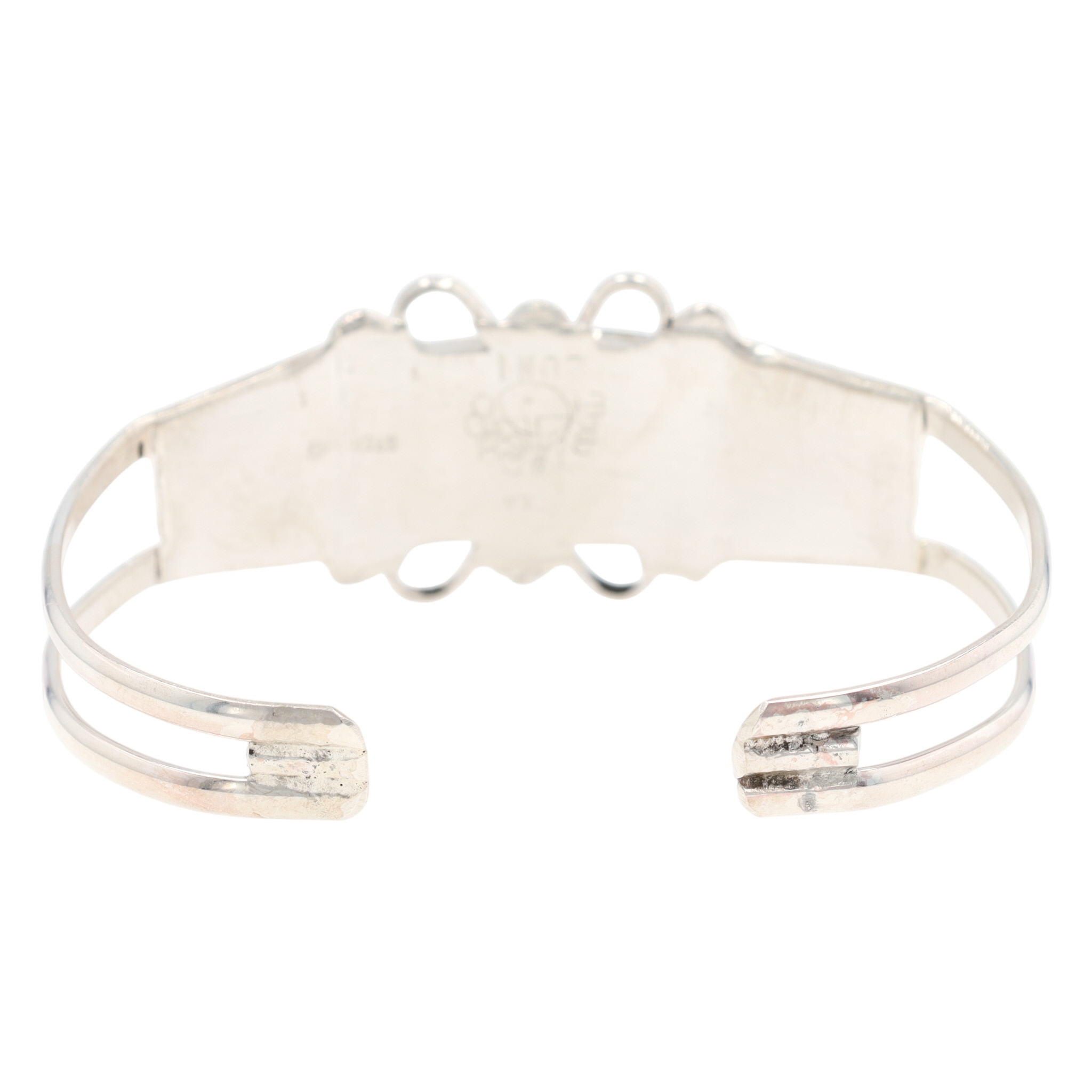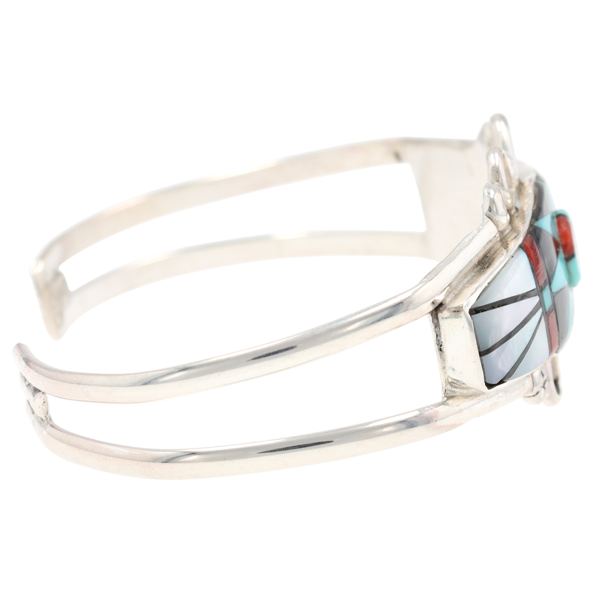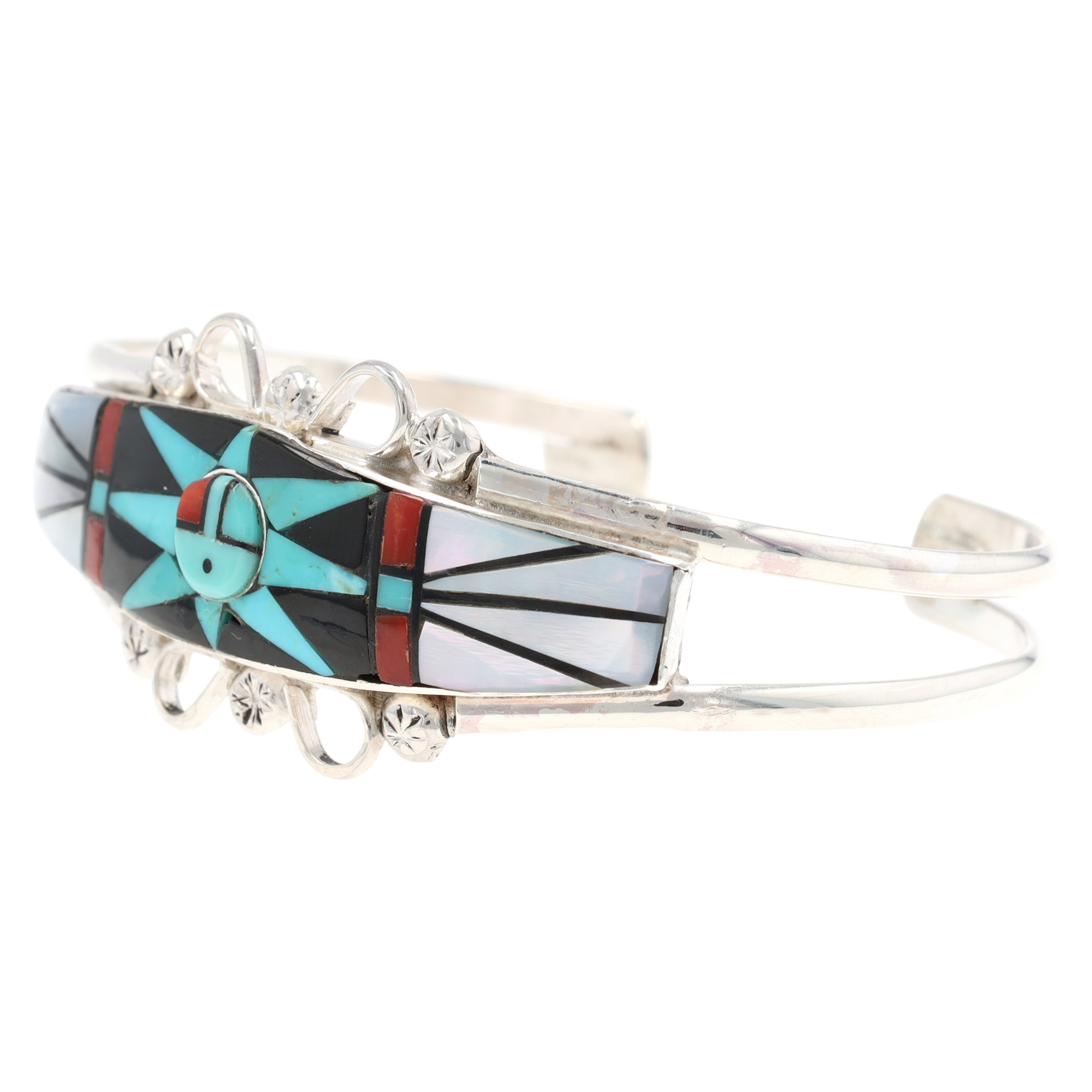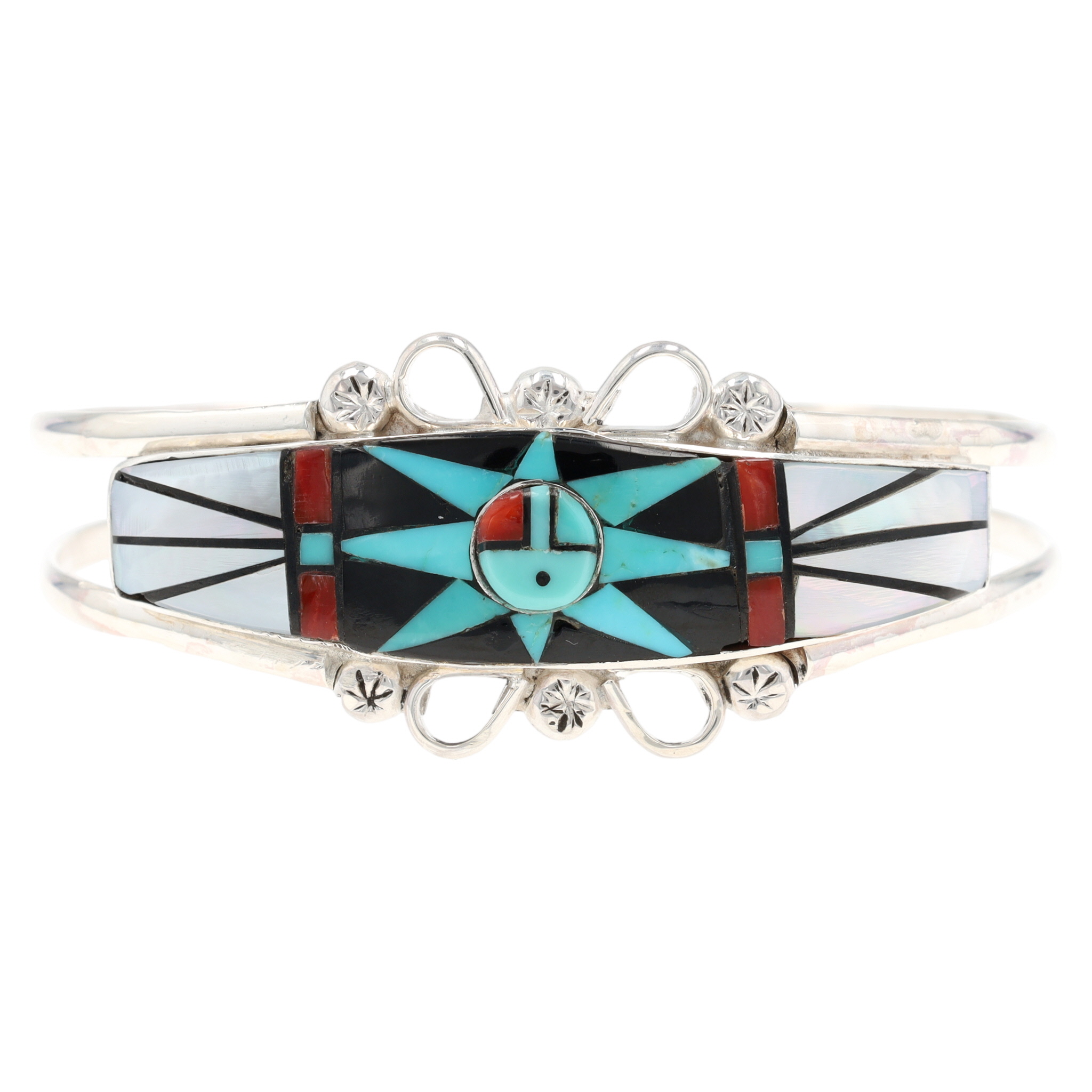 A Zuni sterling silver cuff bracelet by artist Ola Eriacho, featuring a multi-stone Sunface inlay design. The rectangular inlay panel displays a geometric motif, including a central circular element resembling a Sunface, composed of precisely cut and fitted pieces of turquoise, mother of pearl, coral, onyx The double-split shank silver band is adorned with decorative loops and stamped elements beside the central panel. The interior of the cuff is stamped "STERLING", "OLA", and "ZUNI" with an additional circular hallmark.
