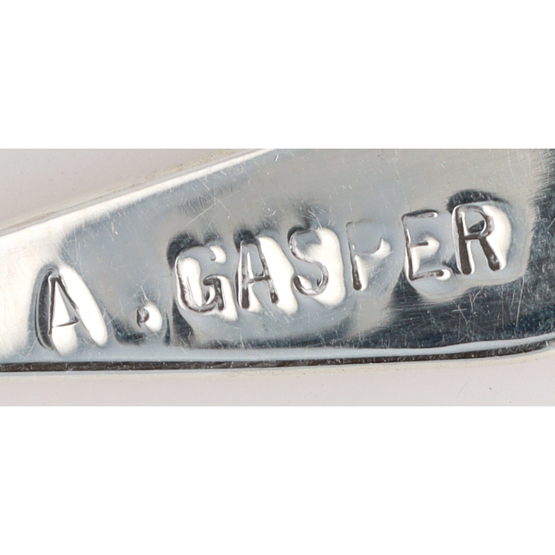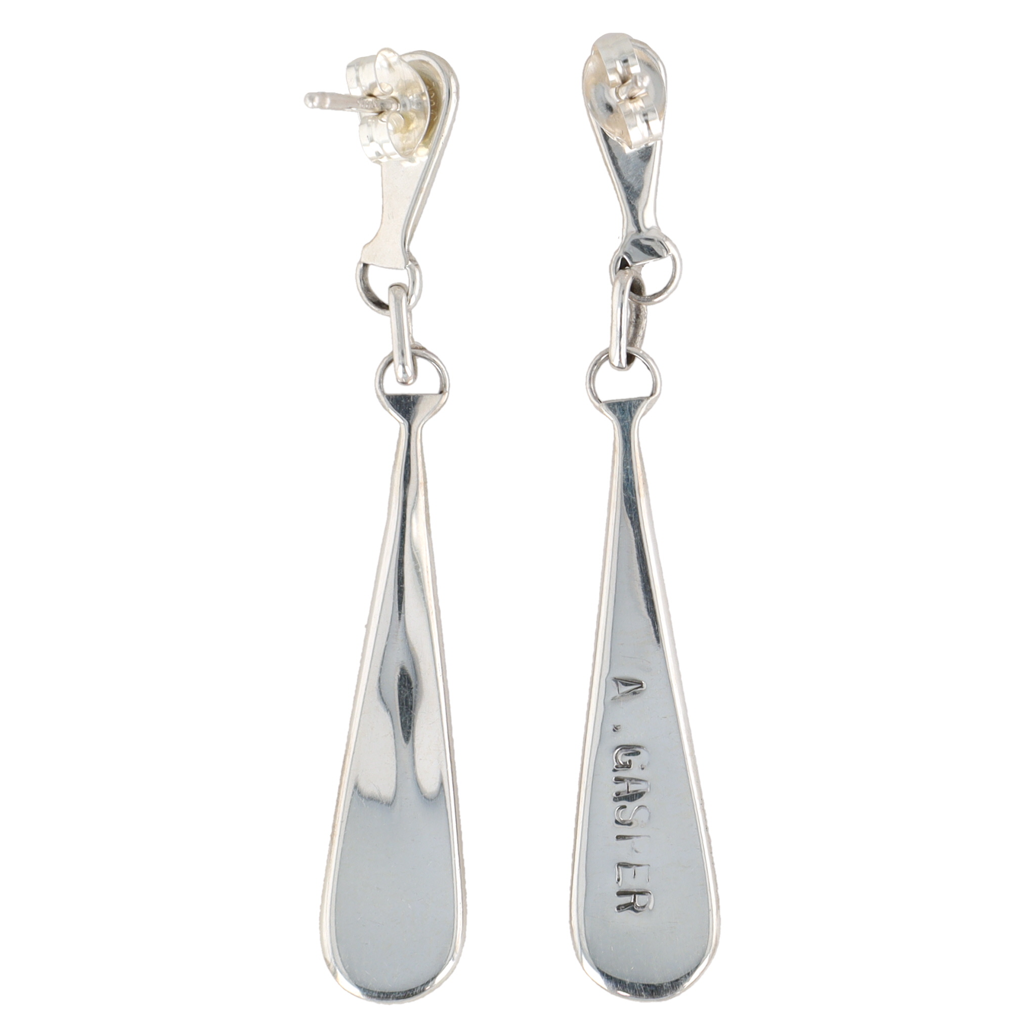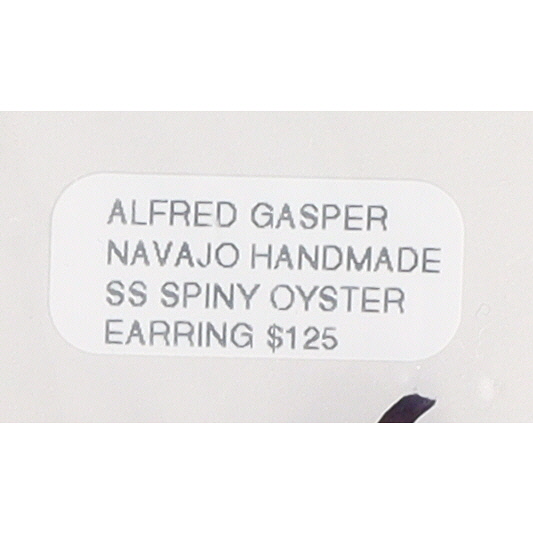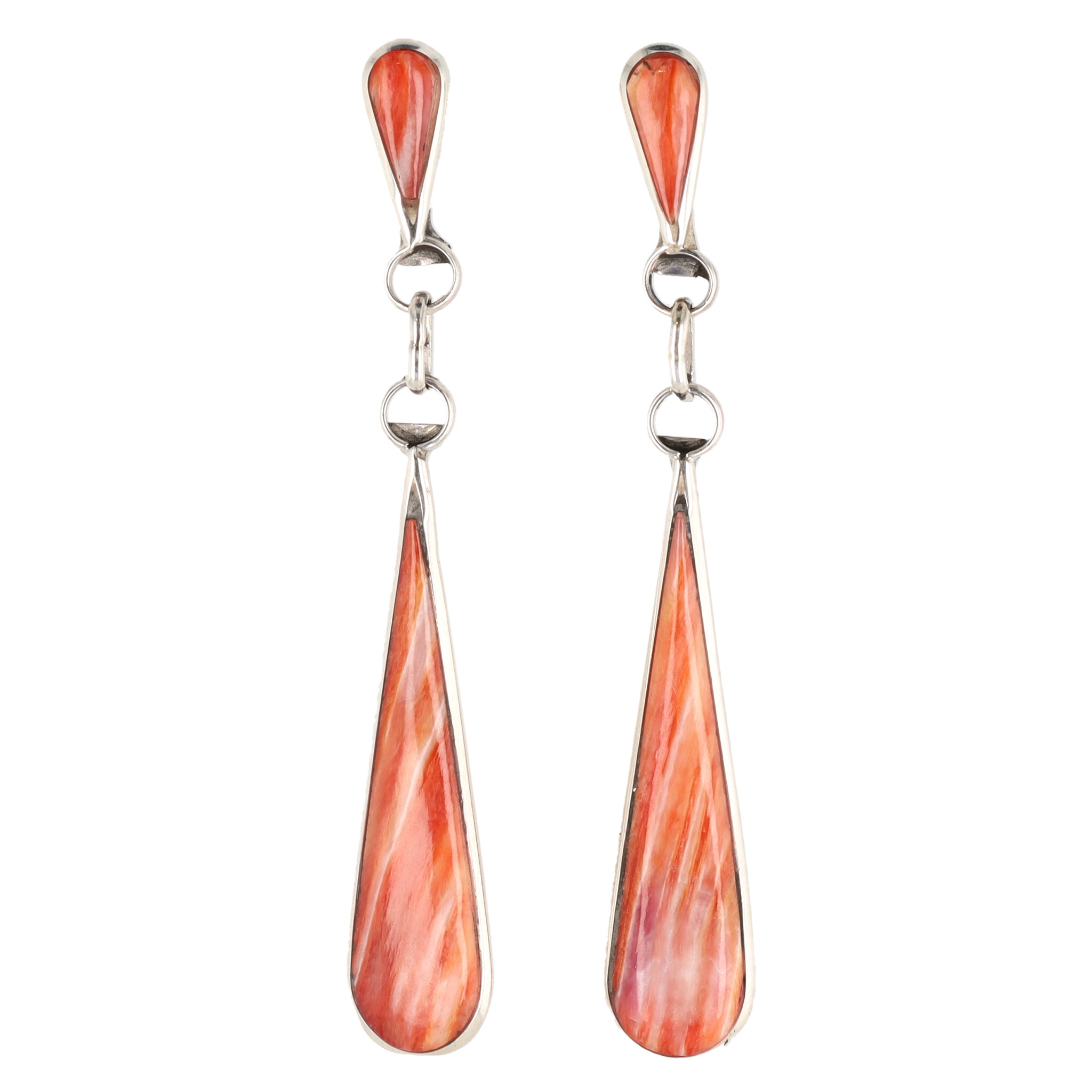 A pair of Navajo sterling silver and spiny oyster shell dangle earrings by Alfred Gasper. Each earring features an inverted teardrop-shaped stud with post backs, connected by two small rings to an elongated, tapering teardrop dangle. Both the stud and the dangle incorporate inlaid spiny oyster shell displaying distinct orange and white striations. The reverse of one main dangle is stamped with the mark "A. GASPER".