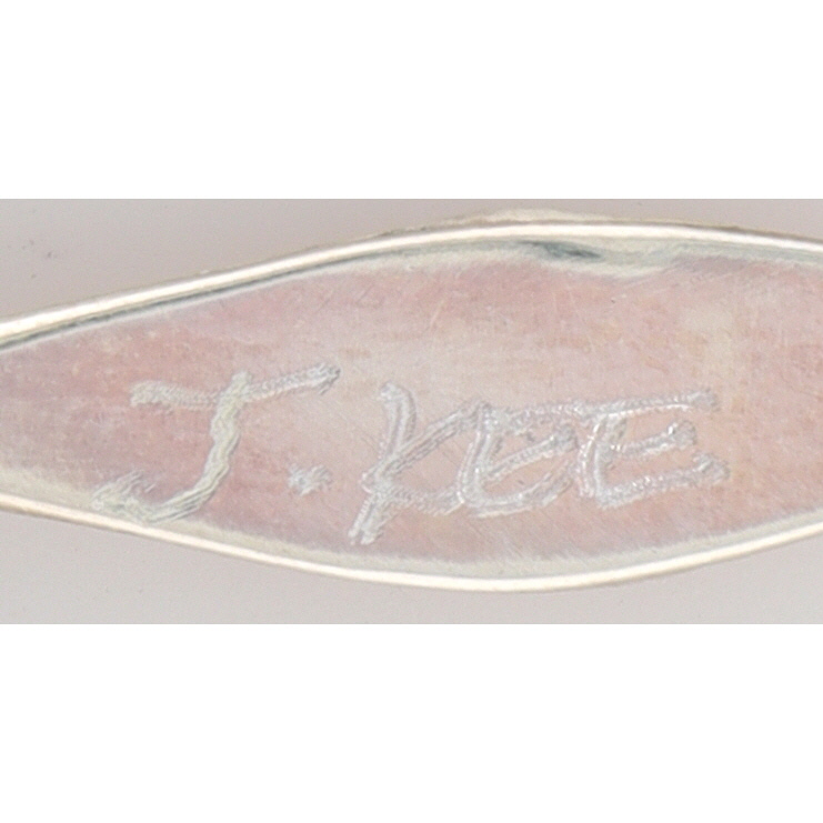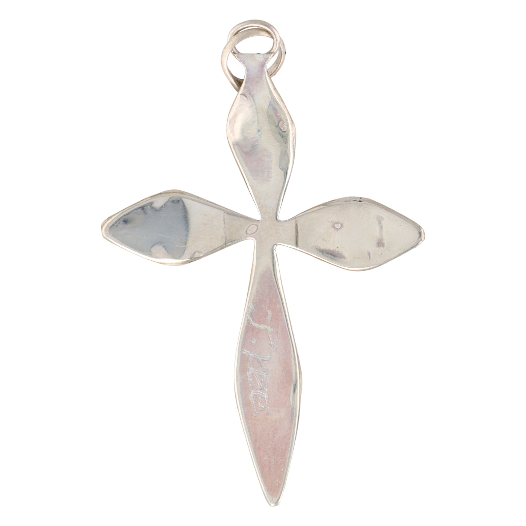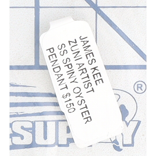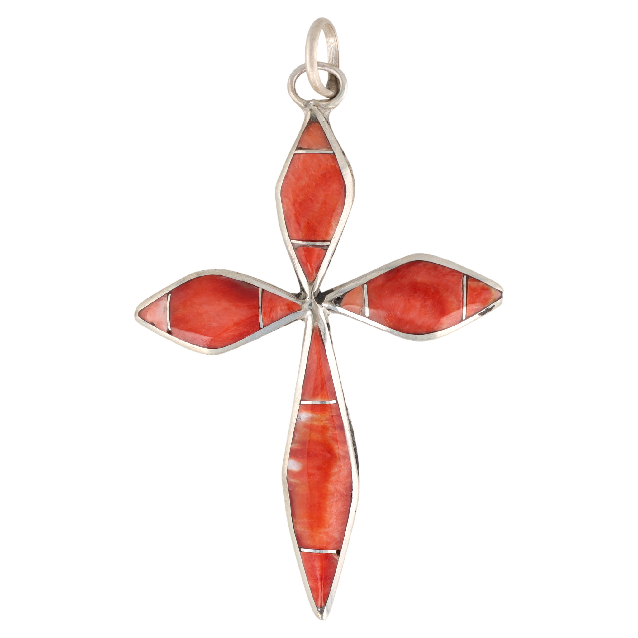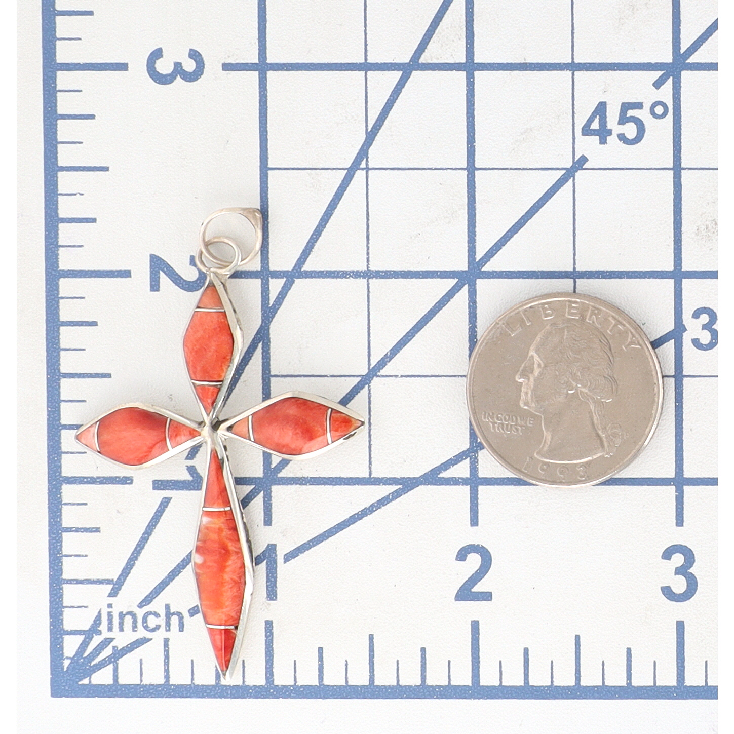A cross-shaped pendant crafted from silver-toned metal, featuring four lobed arms inlaid with segments of vibrant reddish-orange spiny oyster. The material displays natural striations and lighter inclusions. A simple circular bail is present at the top for suspension. The reverse surface is engraved with the signature ‘J. Kee’. An accompanying tag identifies the piece as ‘JAMES KEE ZUNI ARTIST SS SPINY OYSTER PENDANT’.