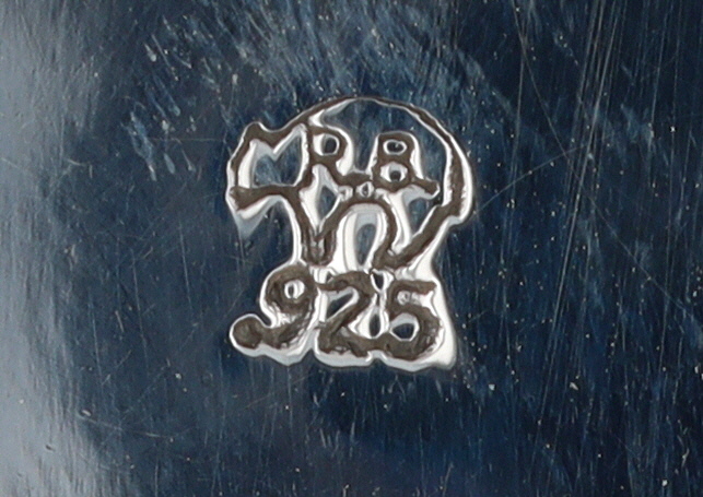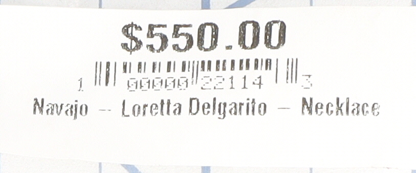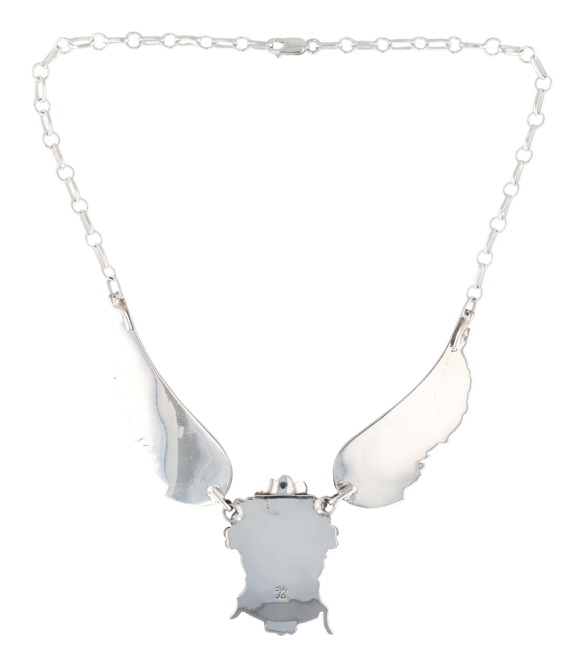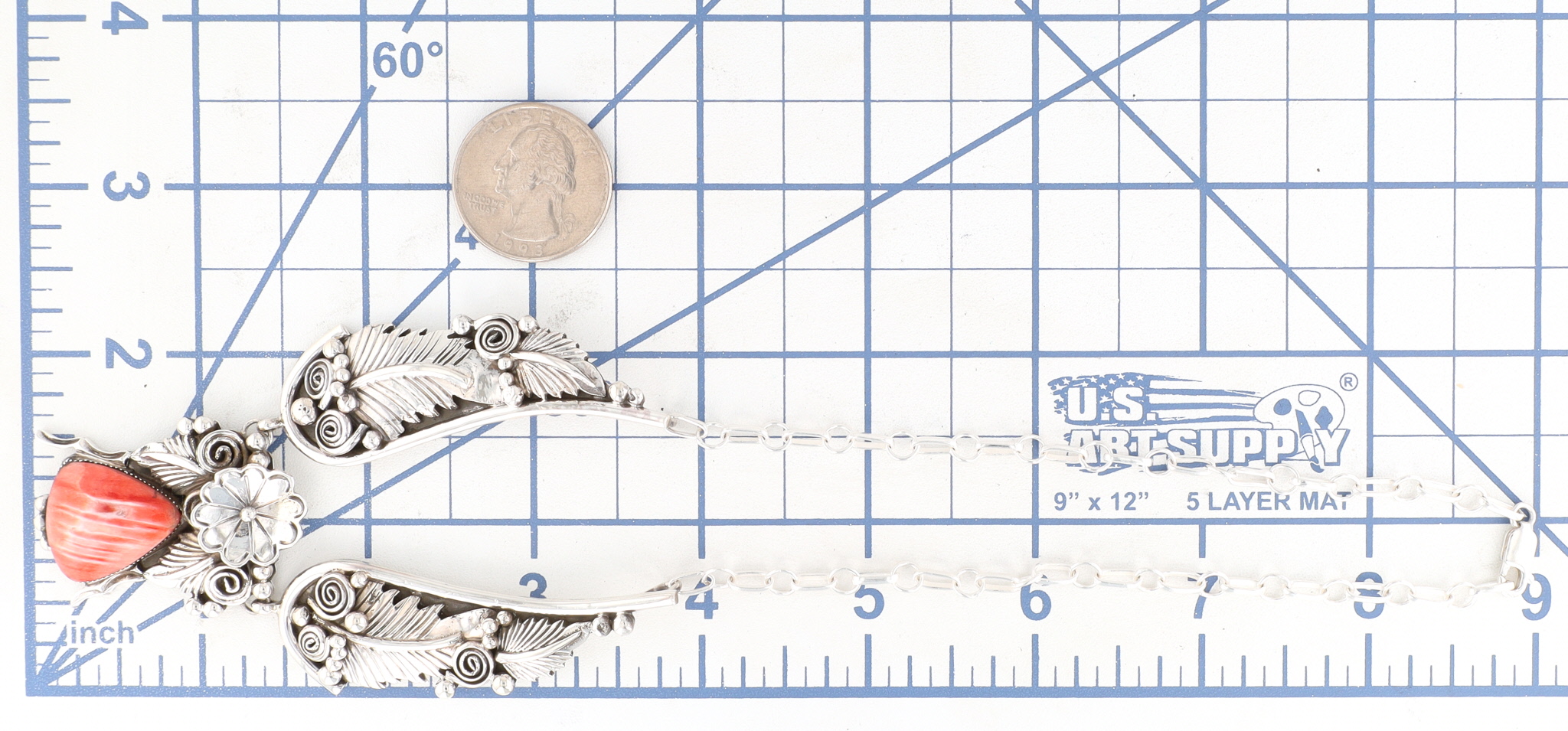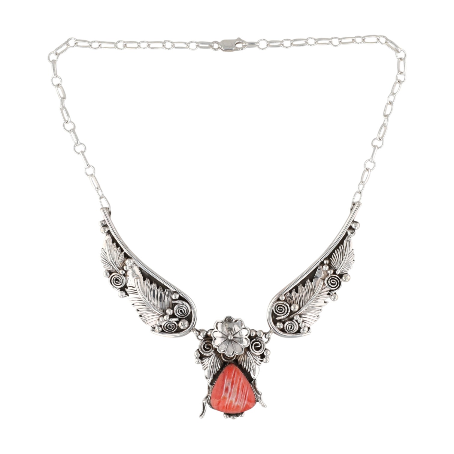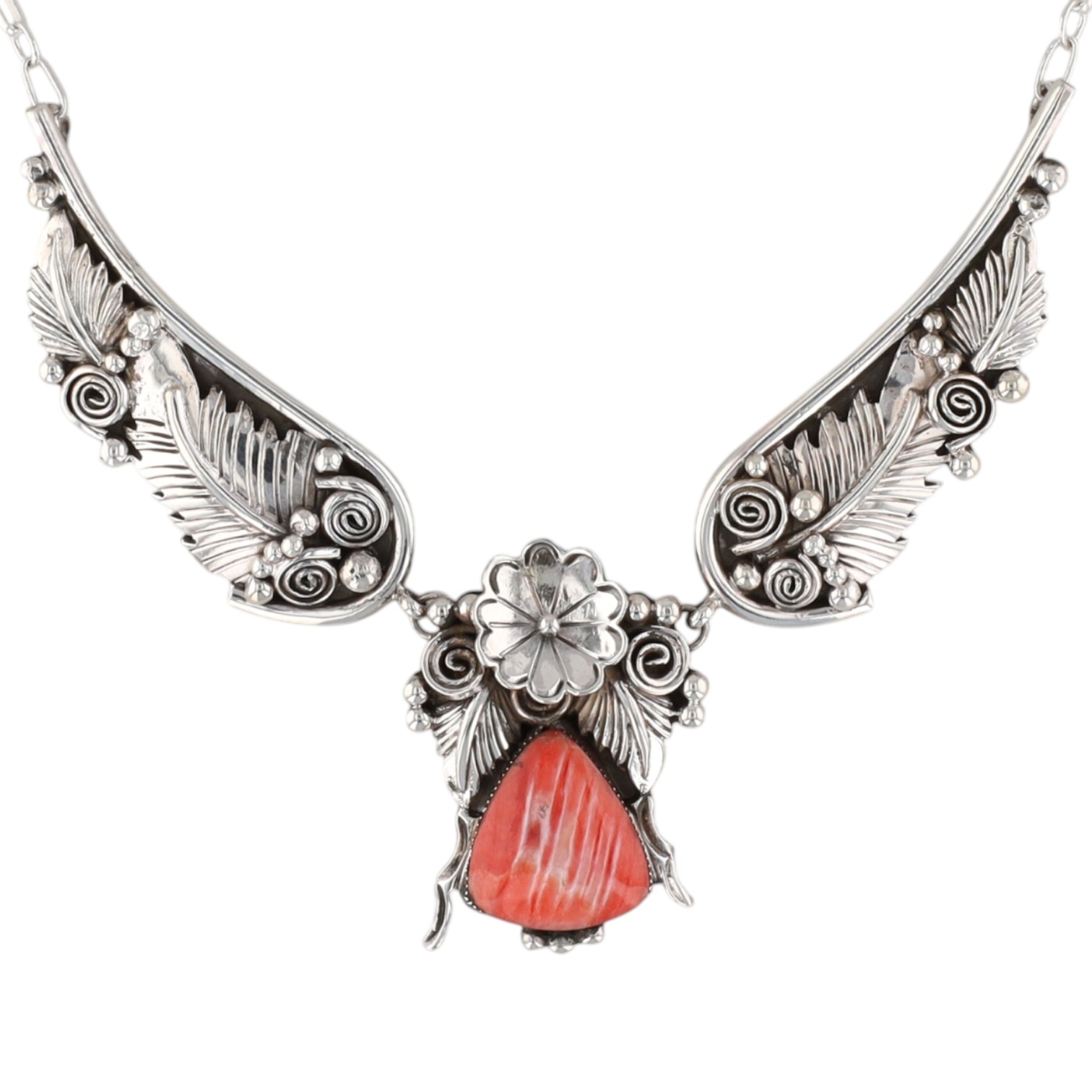 A Loretta Delgarito Navajo spiny oyster sterling silver shadowbox necklace. The piece features a central pendant with a large, roughly triangular cabochon stone exhibiting distinct reddish-orange and white striations, consistent with the shell material. The stone is set within an ornate silver frame detailed with a stylized flower, flanked by two substantial, highly decorative foliate or wing-like silver elements. These elements are embellished with intricate repoussé work, applied wire scrolls, and granulation. The necklace fastens with a lobster claw clasp. Both the clasp and a hallmark on the reverse of the central element are stamped "925," indicating sterling silver. An additional impressed mark on the reverse reads "RB" for Running Bear Shop above "925."