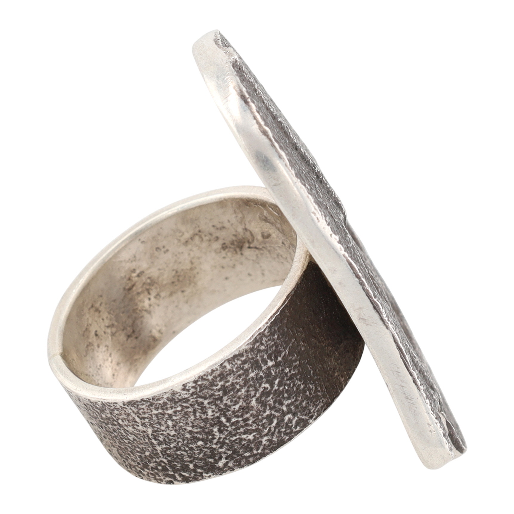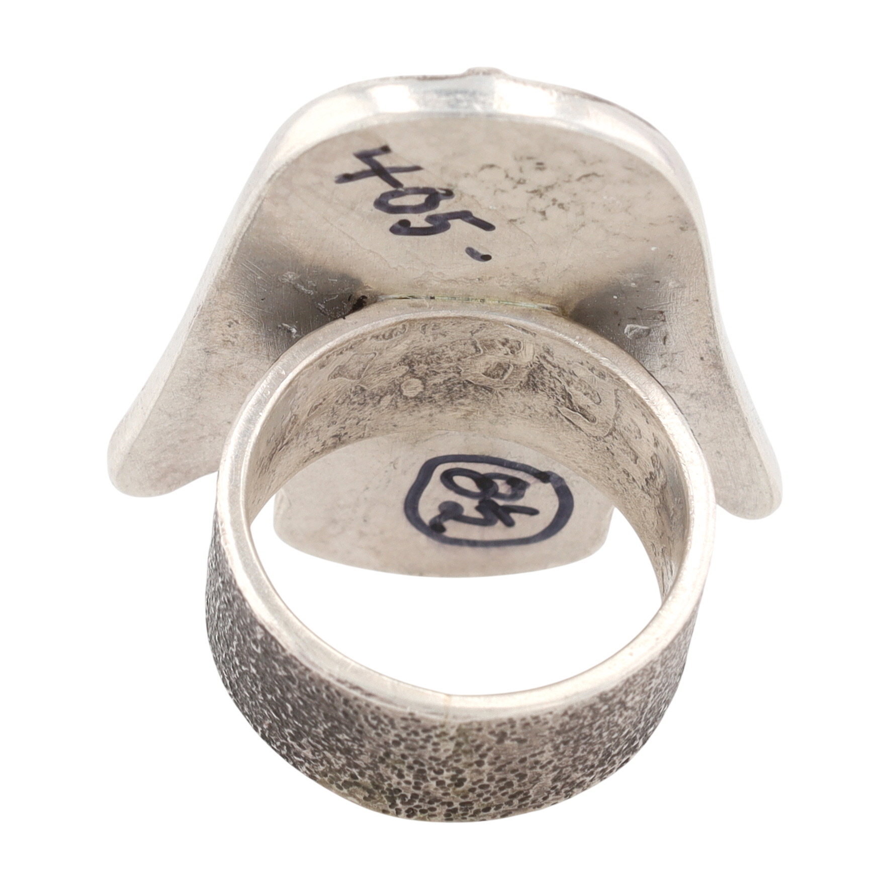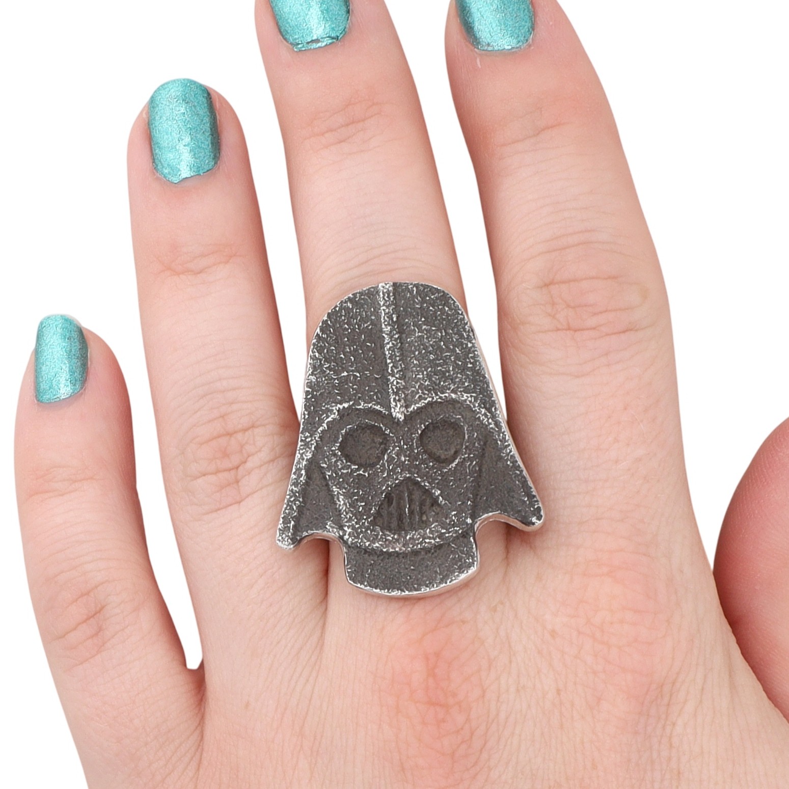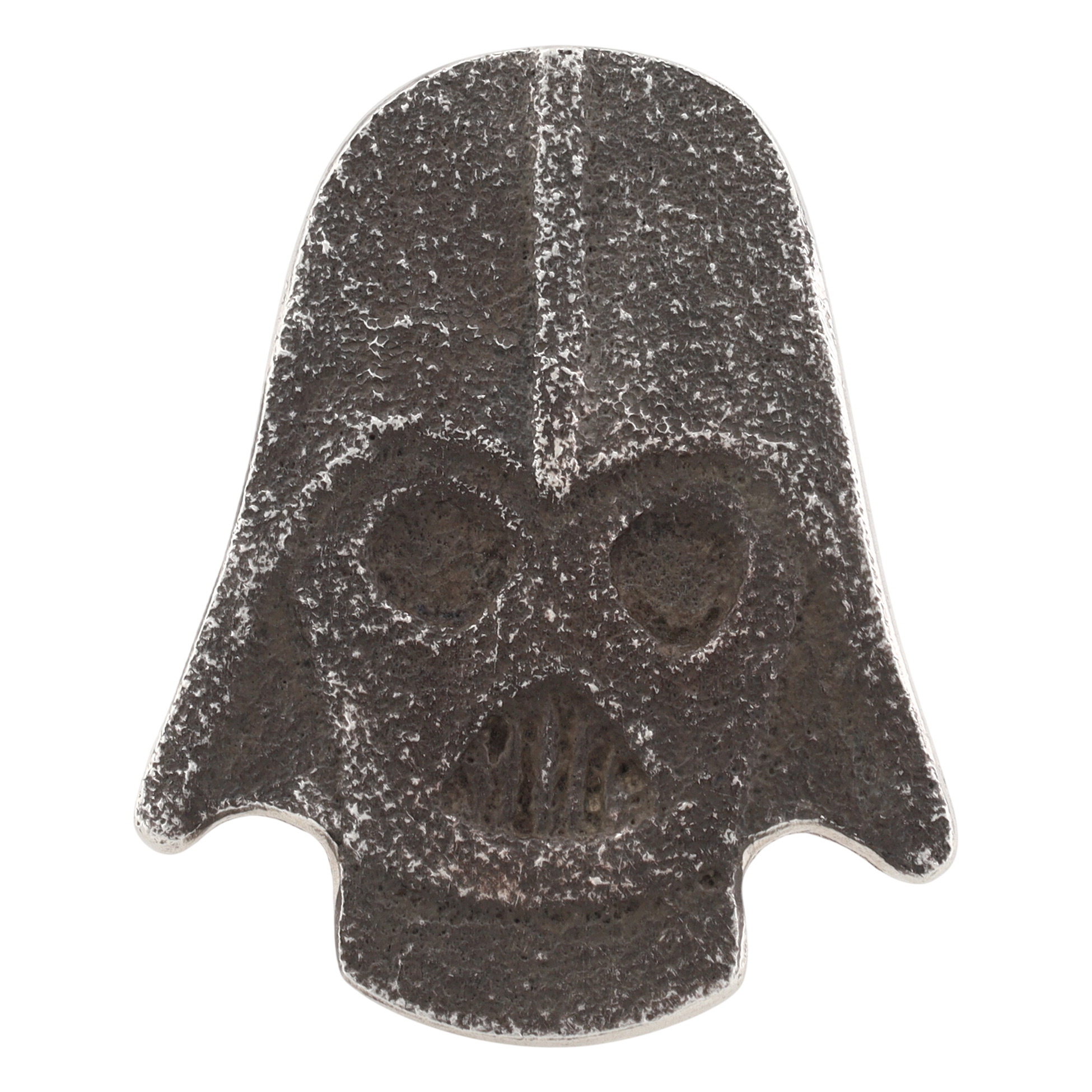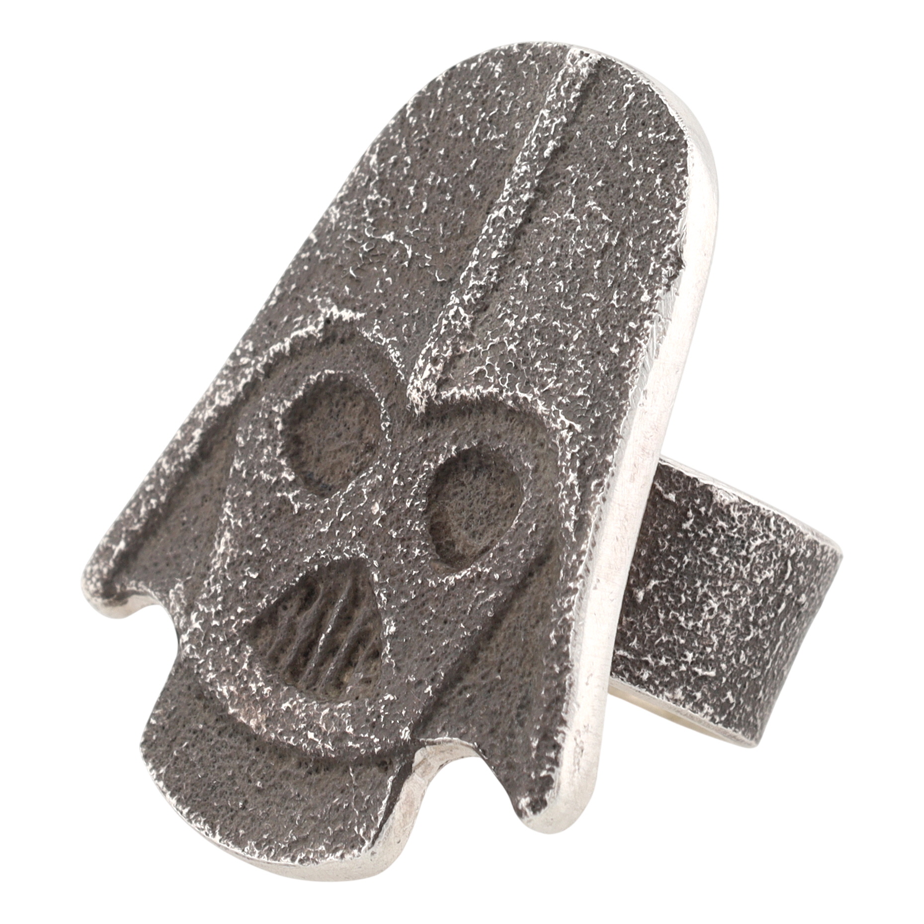 A modern Navajo finger ring by Lee Begay featuring a large, tufa cast sterling metal plaque depicting a stylized Darth Vader helmet. The texture is consistent with the Navajo style of oxidized tufa cast sterling. The reverse of the helmet is marked "$405." in black marker, while the interior of the band shows faint, hallmarks "LEE B. 19"