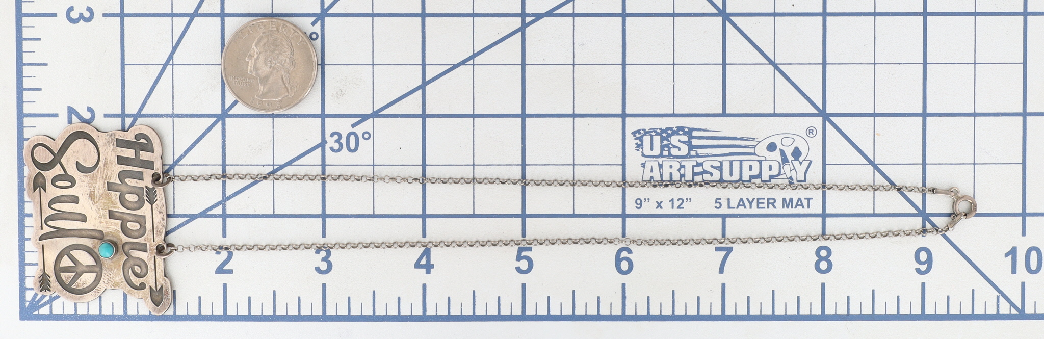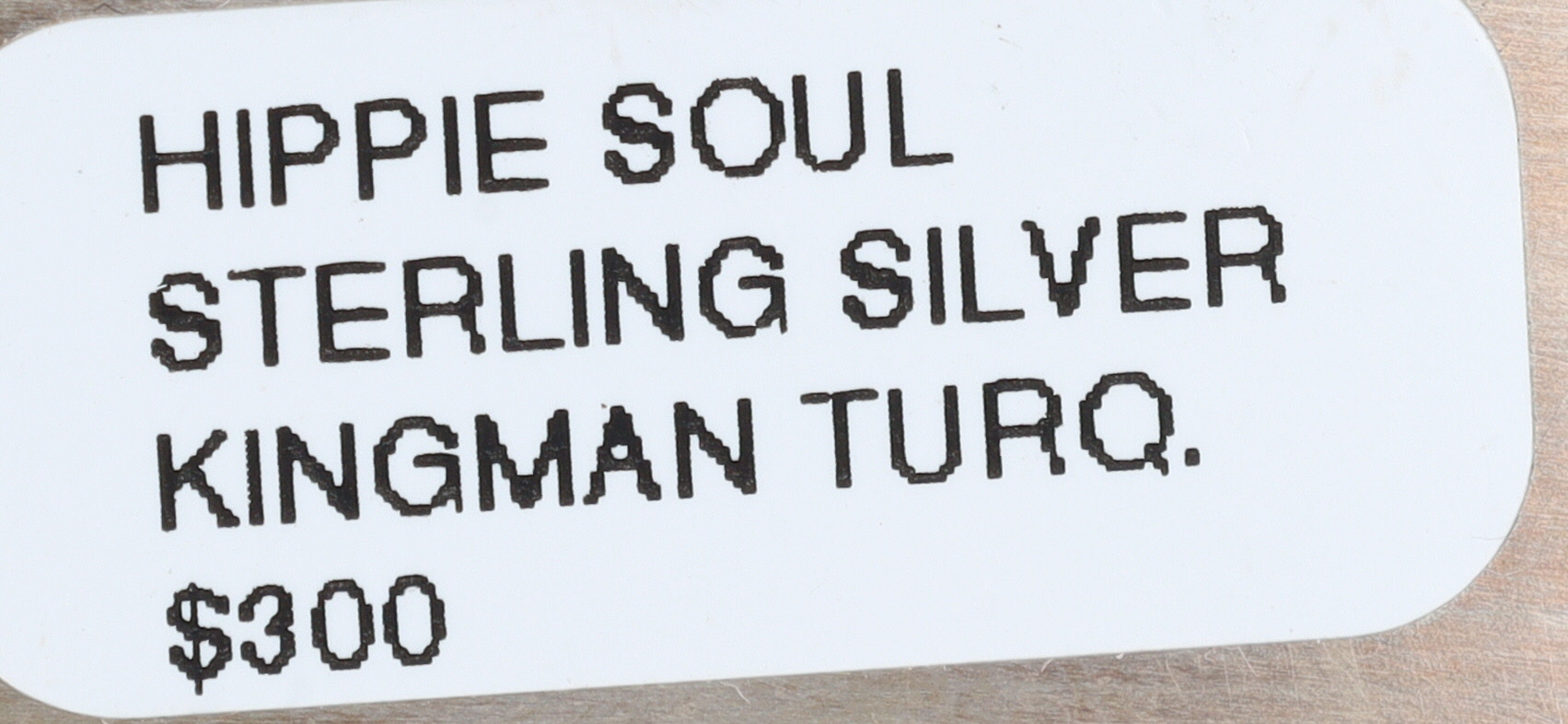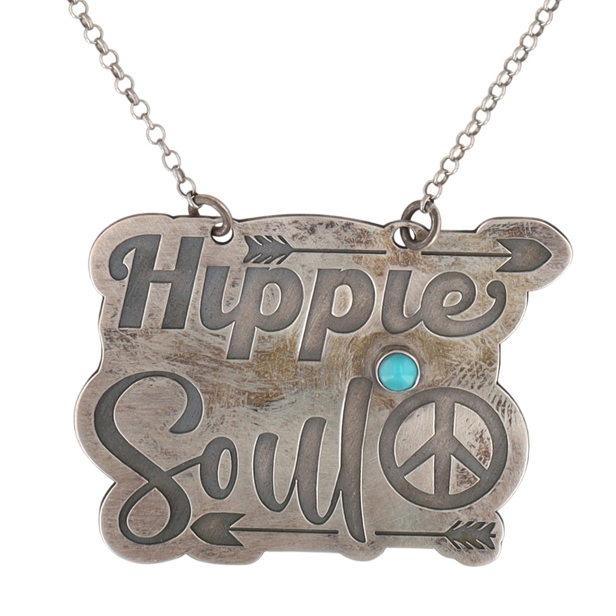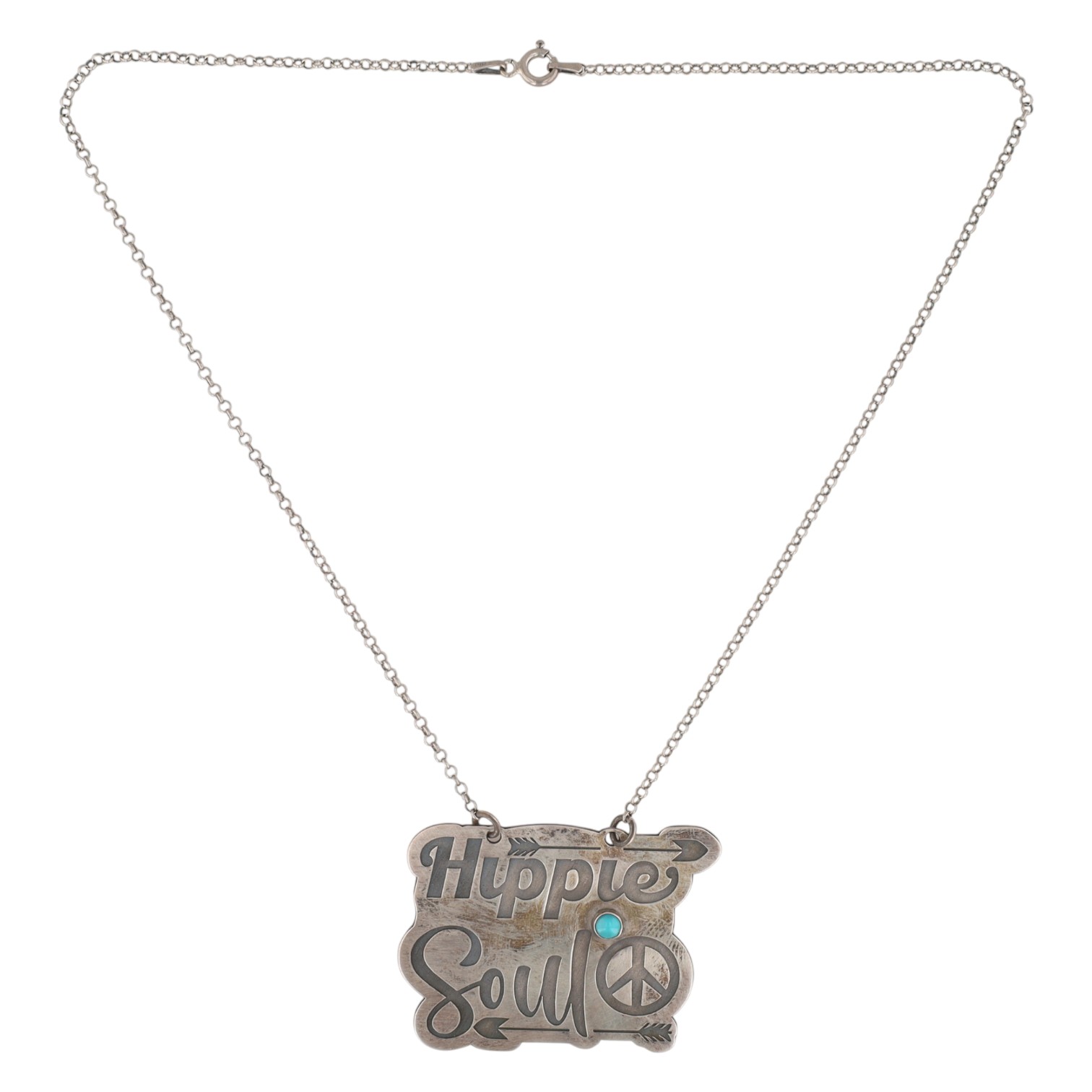 A sterling silver necklace featuring a shaped pendant engraved with "Hippie Soul" in stylized script, accented by arrows and a peace symbol containing a small round Kingman turquoise cabochon. The reverse of the pendant is marked "Sterling" and "Made in U.S.A.". The pendant is suspended from an oval link chain with a spring ring clasp stamped "925". An attached label further identifies the piece as "HIPPIE SOUL", "STERLING SILVER", "KINGMAN TURQ.", and indicates a price of "$300".