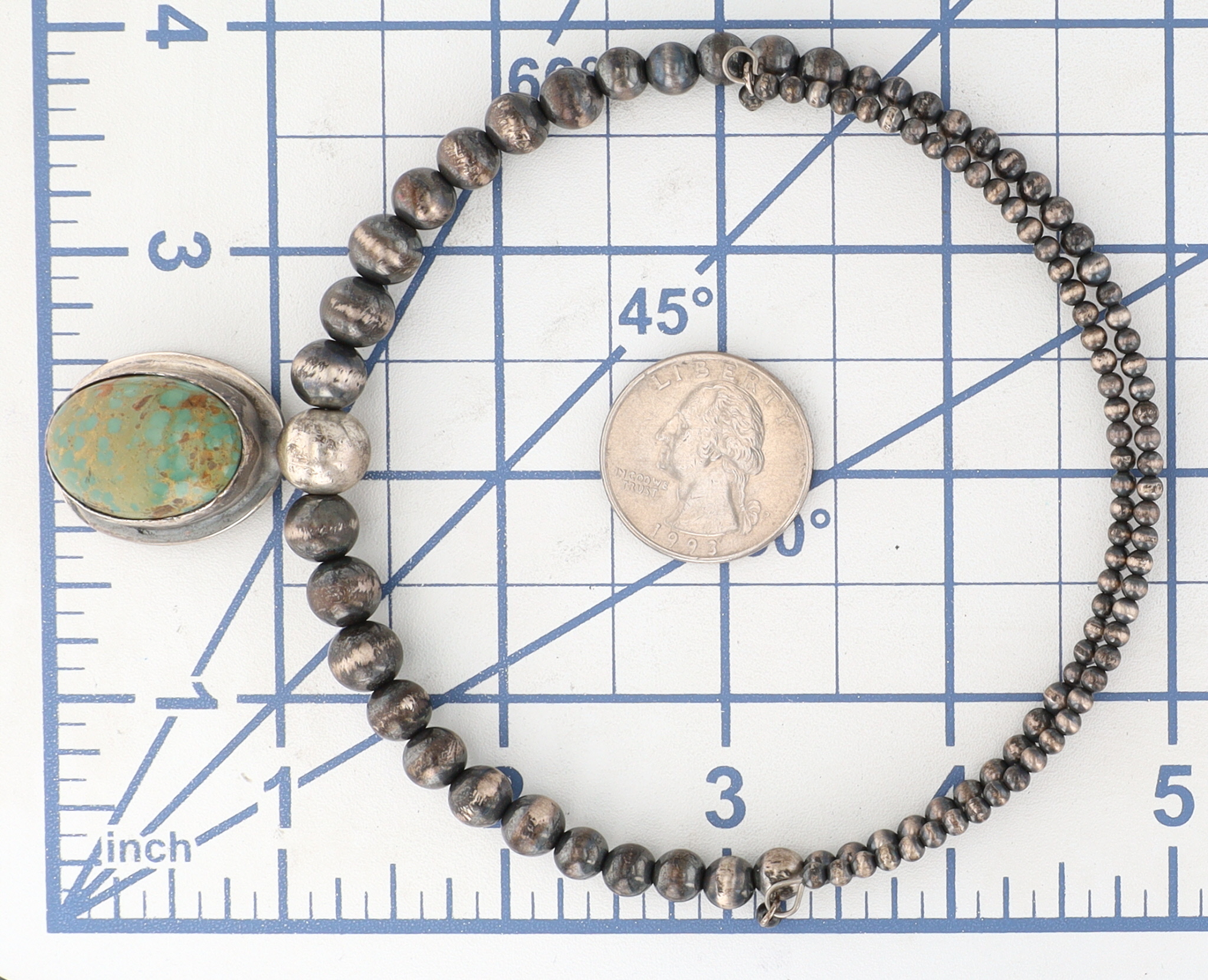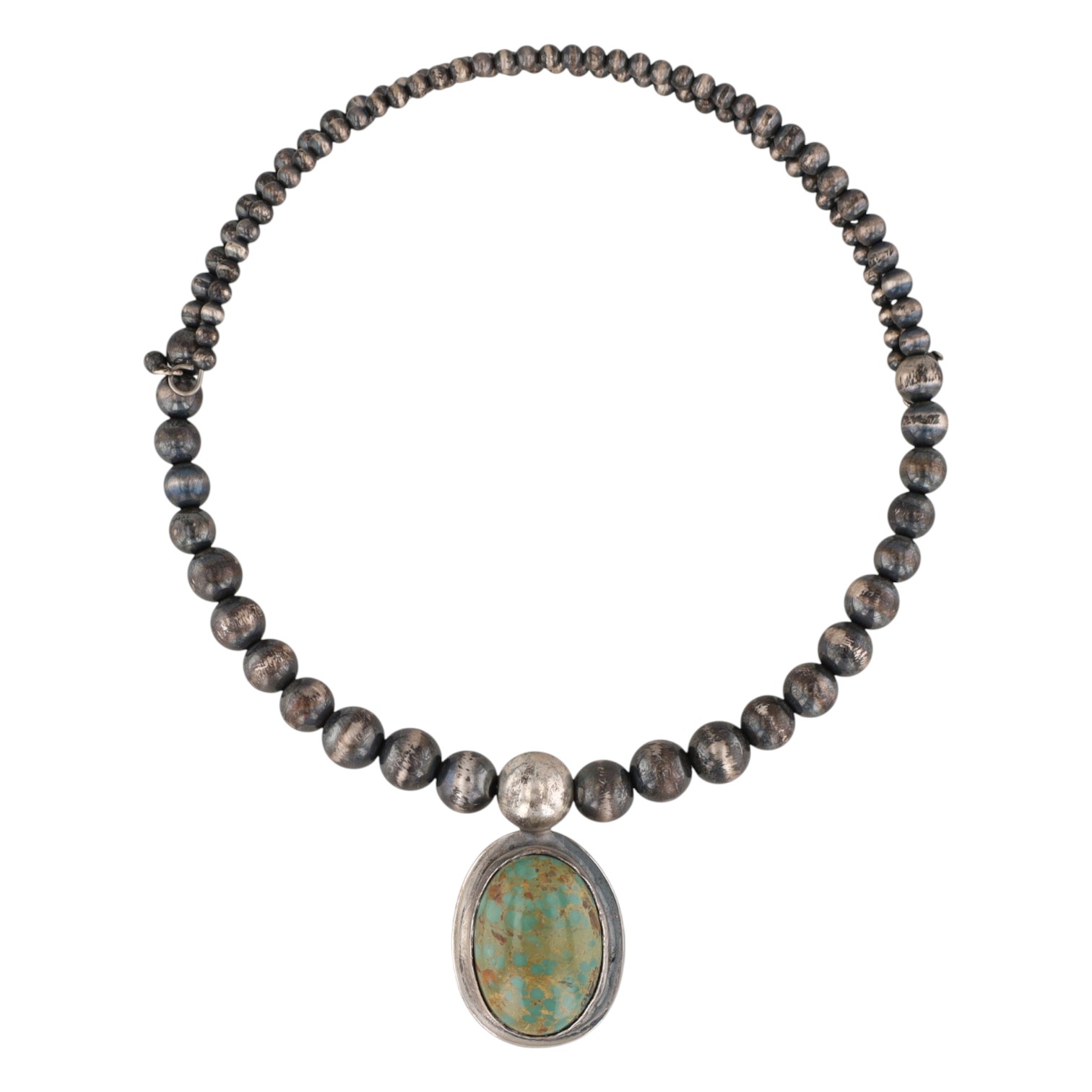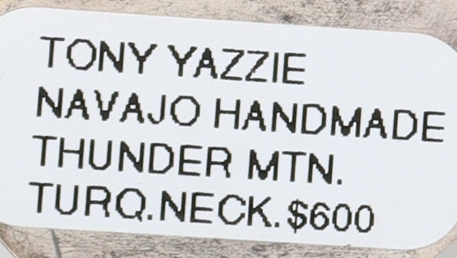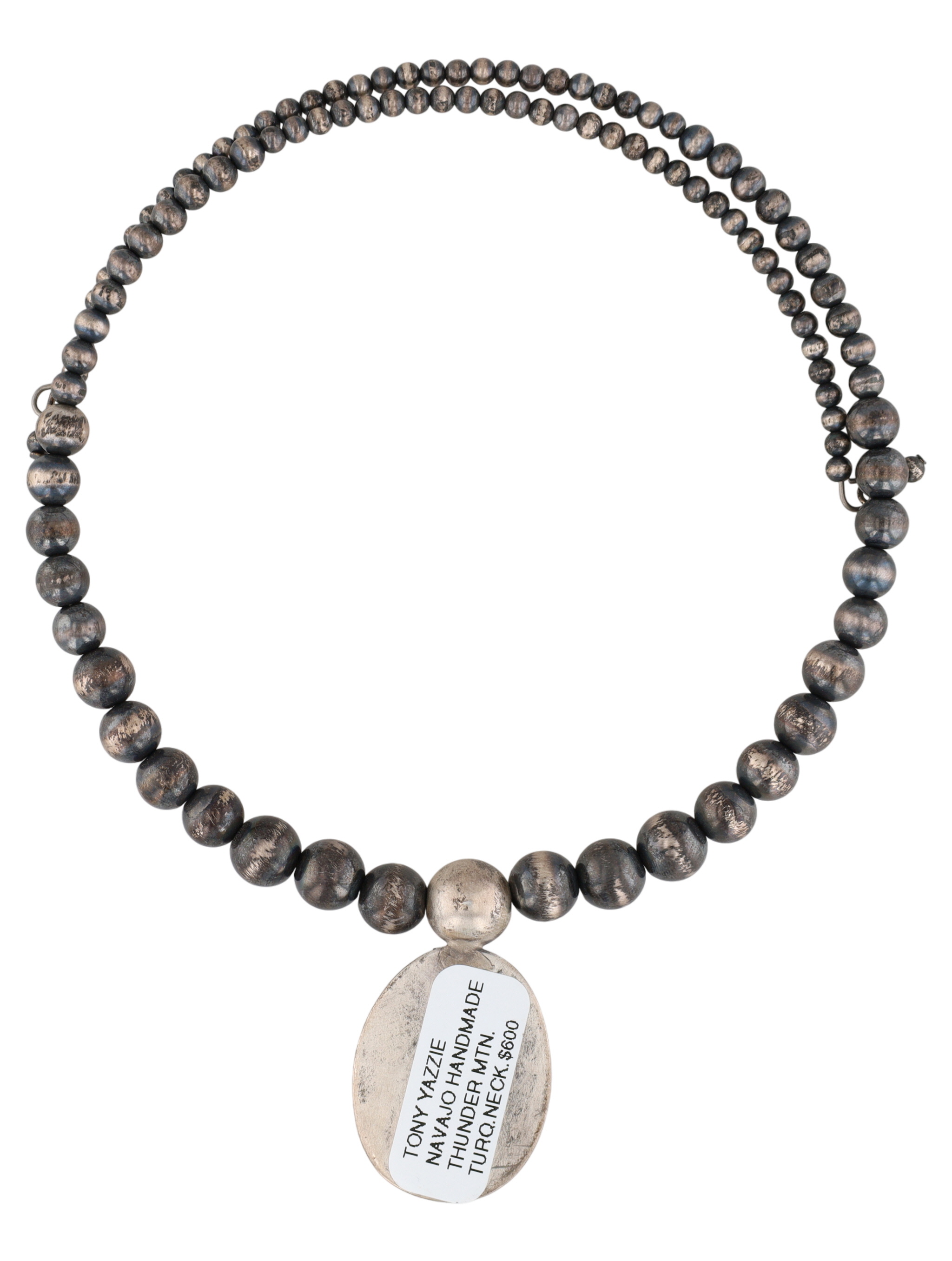 A Navajo sterling silver and Royston turquoise beaded necklace by Tony Yazzie. This "stretchy" graduated spherical beads leading to a central oval pendant. The reverse of the pendant is stamped with a stylized "Zia" symbol above "STERLING". An affixed label on the reverse reads "TONY YAZZIE NAVAJO HANDMADE THUNDER MTN. TURQ.NECK. $600."