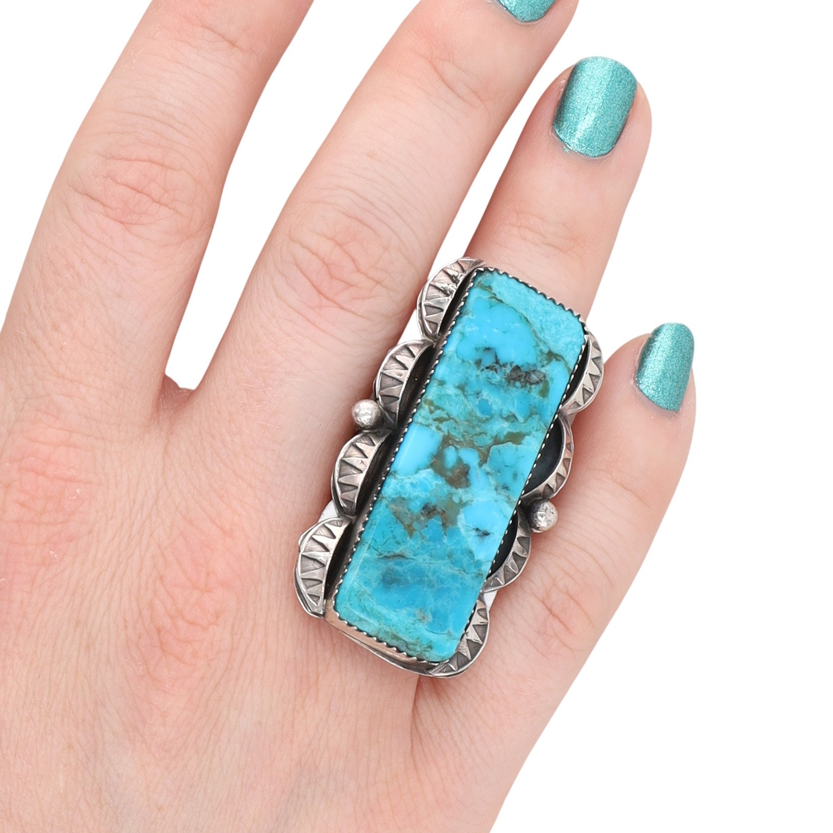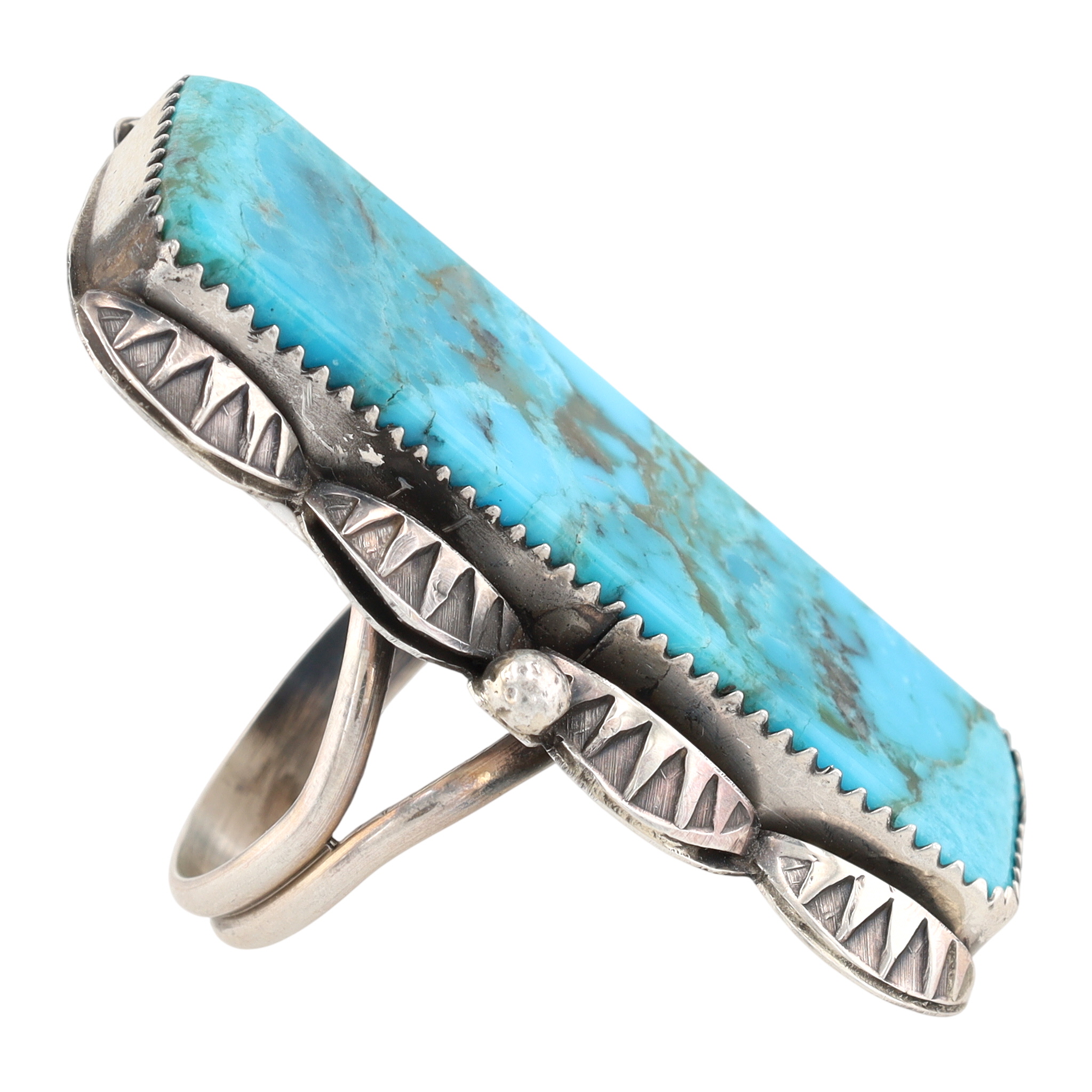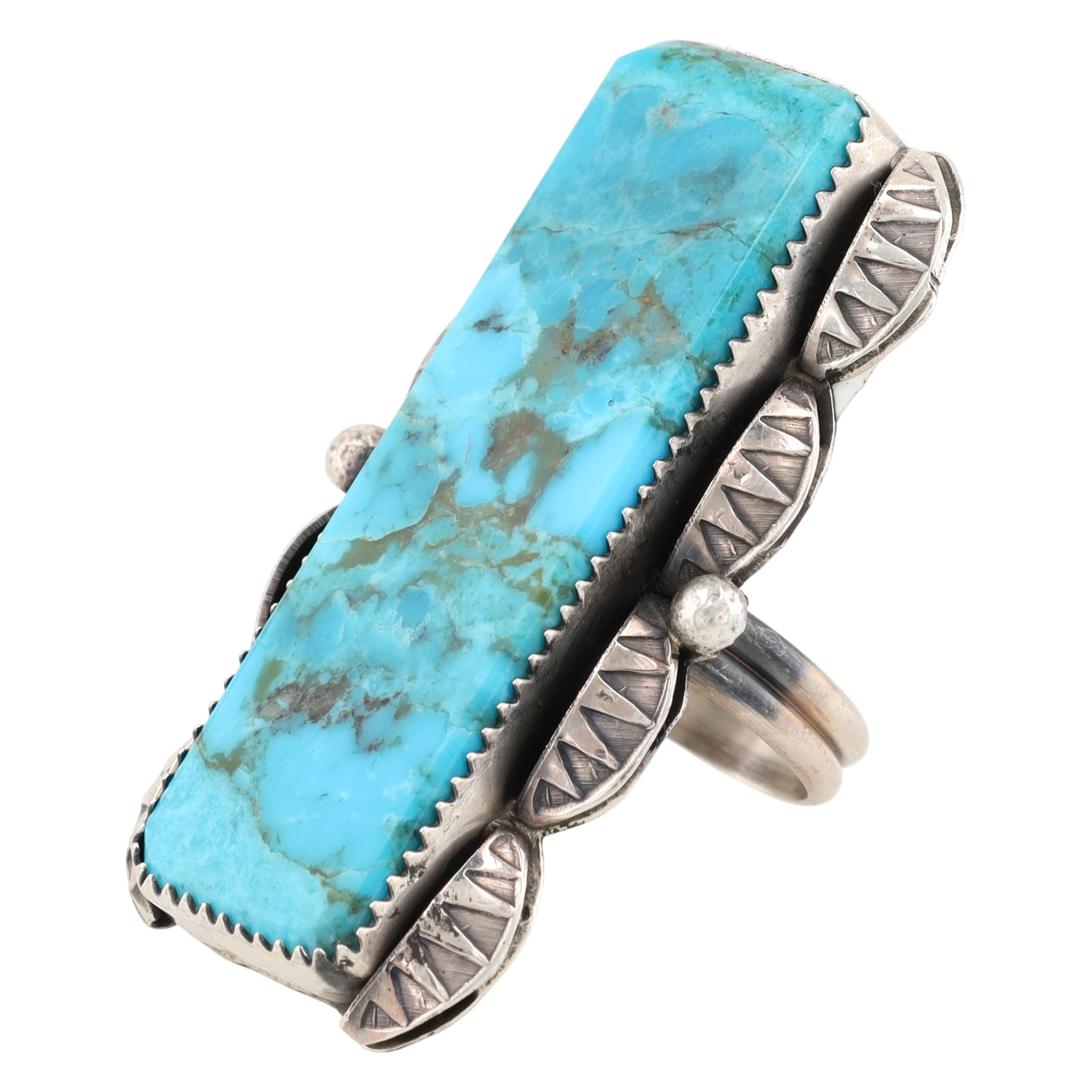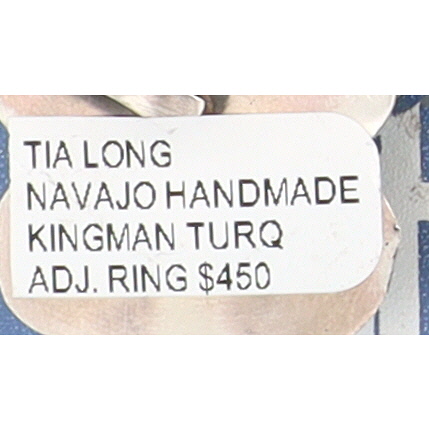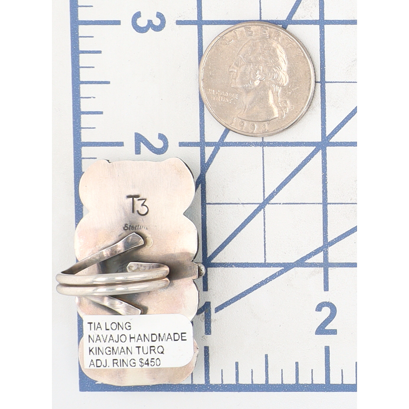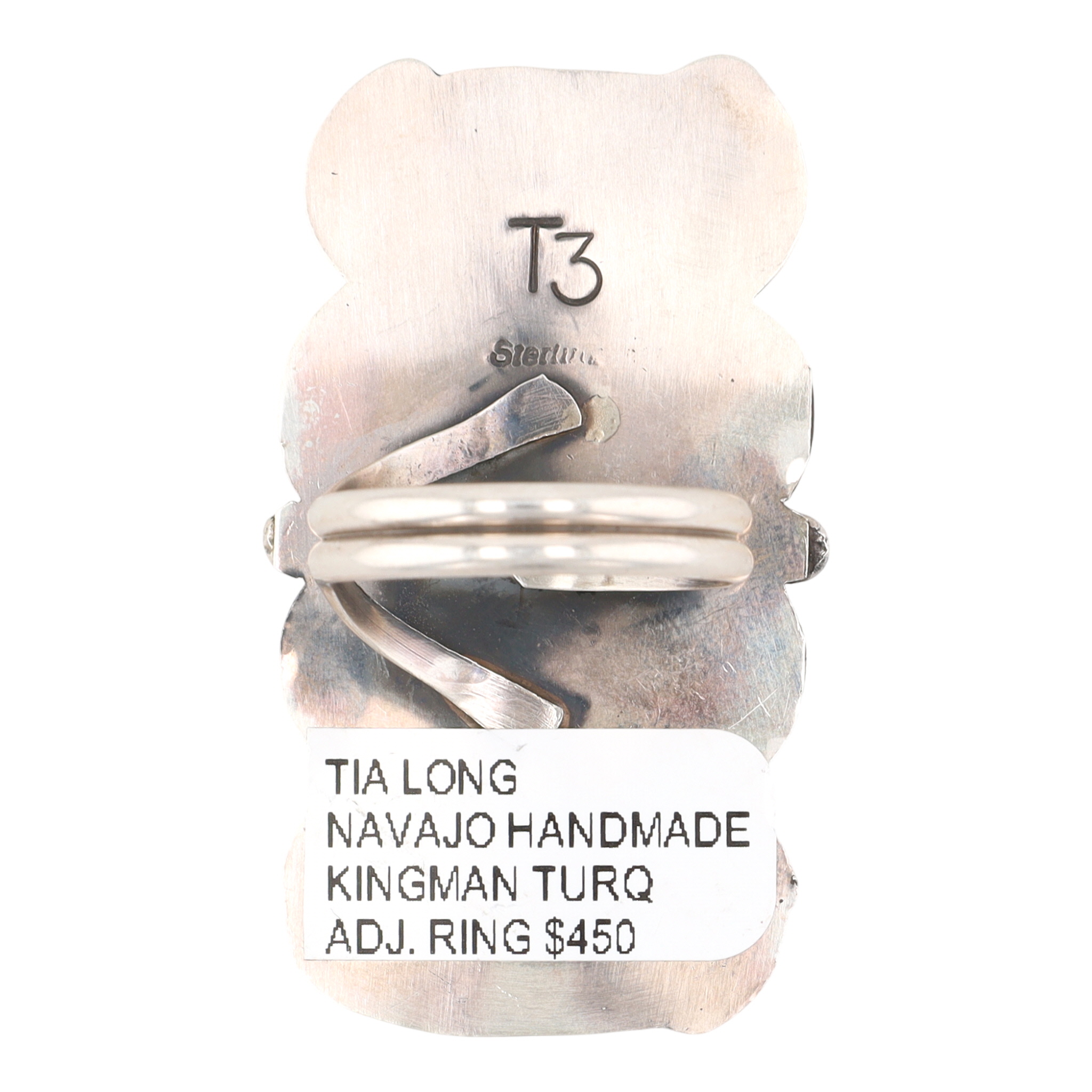 A Tia Long Navajo ring, crafted from sterling silver. The ring features a prominent rectangular cabochon of Kingman turquoise with visible brown matrix, set within a serrated bezel. The stone is flanked by decorative silver elements with stamped patterns and applied silver beads. The ring is mounted on a split-shank band and is adjustable. The reverse of the setting is visibly stamped with the marks "T3" and "Sterling". An affixed white label on the reverse reads "TIA LONG", "NAVAJO HANDMADE", "KINGMAN TURQ", and "ADJ. RING $450".