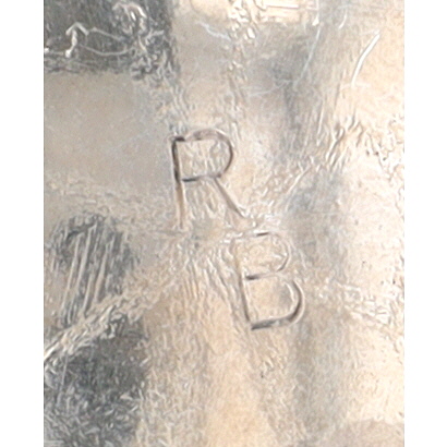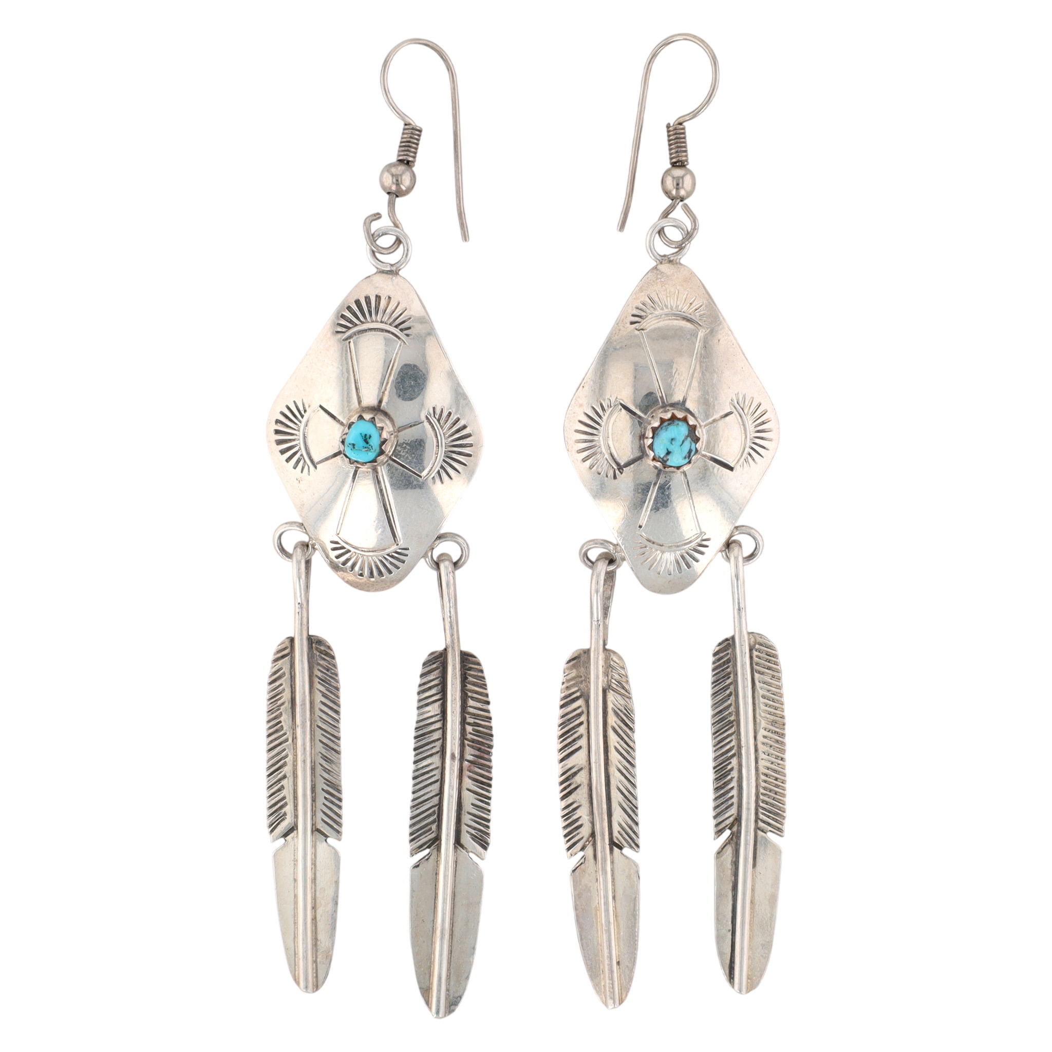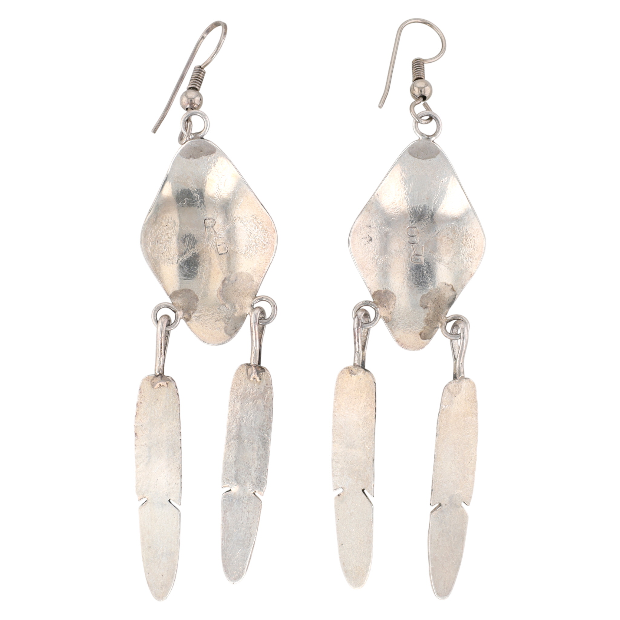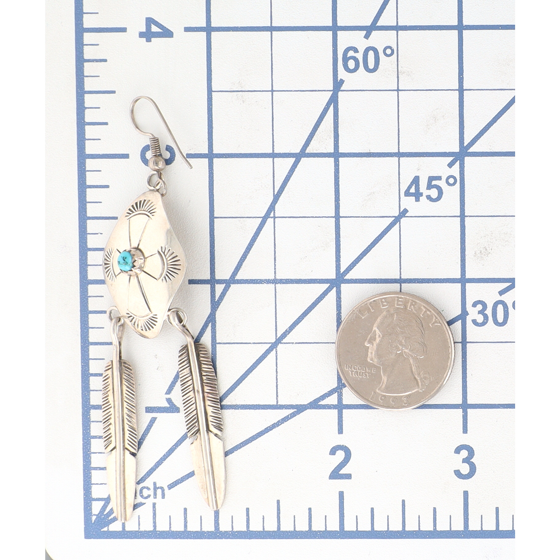 A pair of Navajo-style sterling silver dangle earrings. Each earring features a rhomboid-shaped top element with stamped radiating designs surrounding a central, bezel-set, polished round turquoise-colored cabochon. Four articulated feather-shaped drops dangle from each main element. The reverse of one earring is clearly stamped with the initials "RB, " while the other reverse displays a less distinct or partial marking.