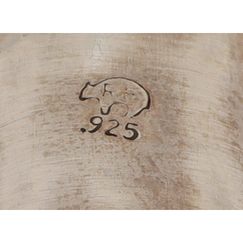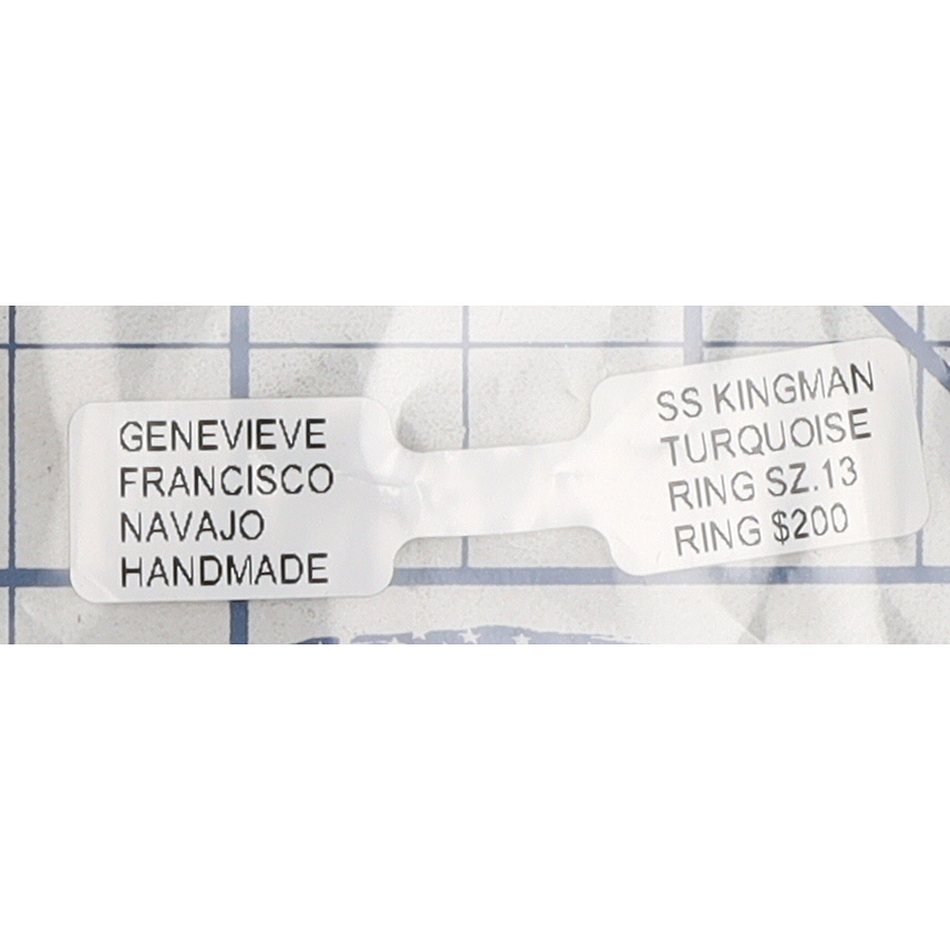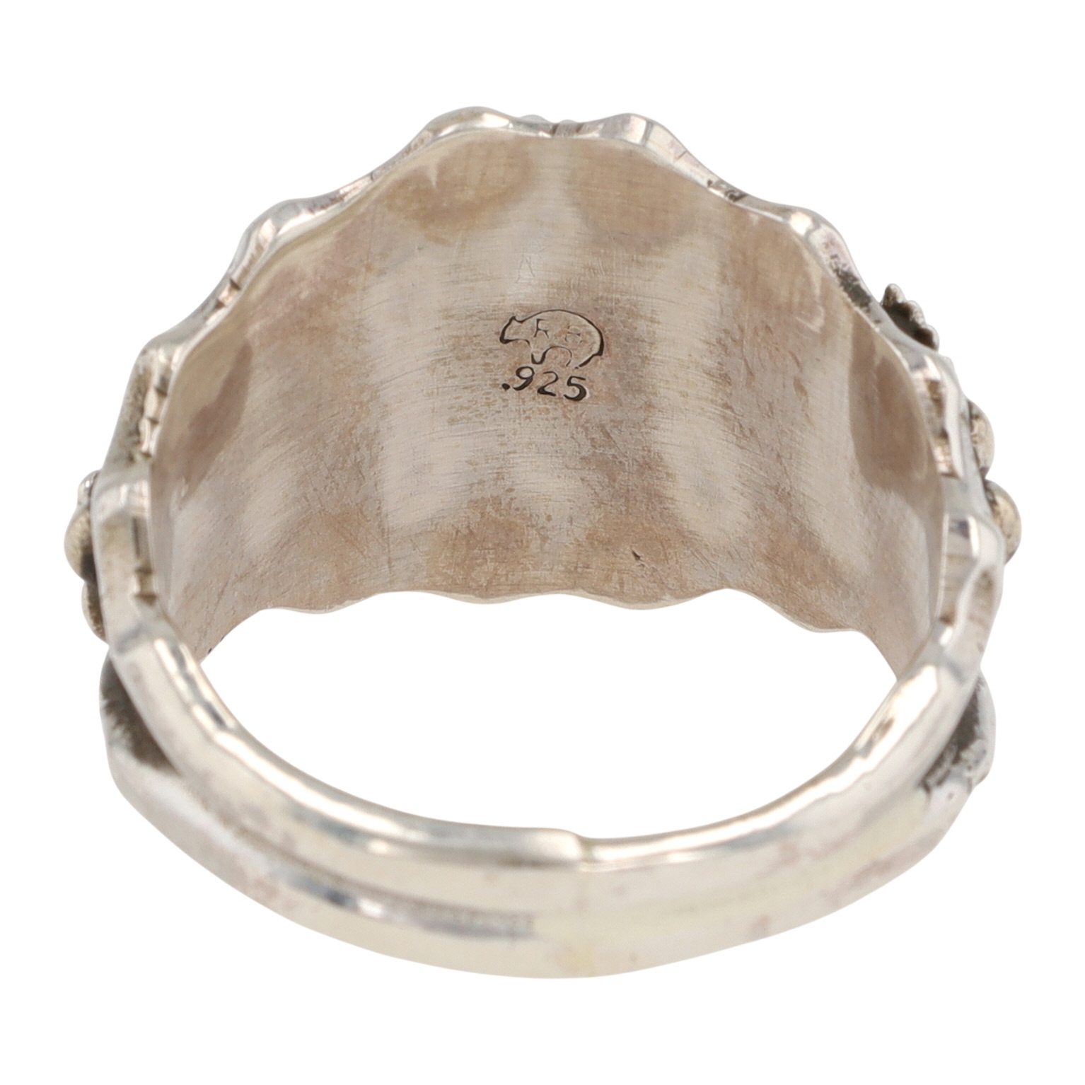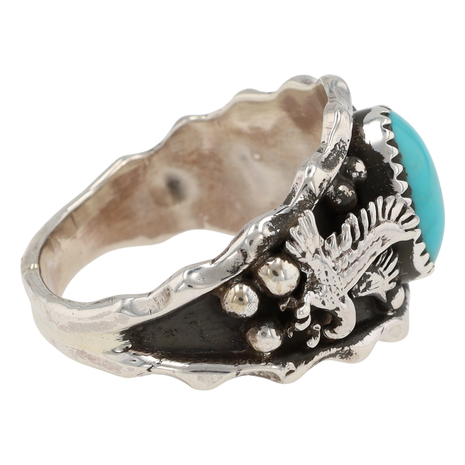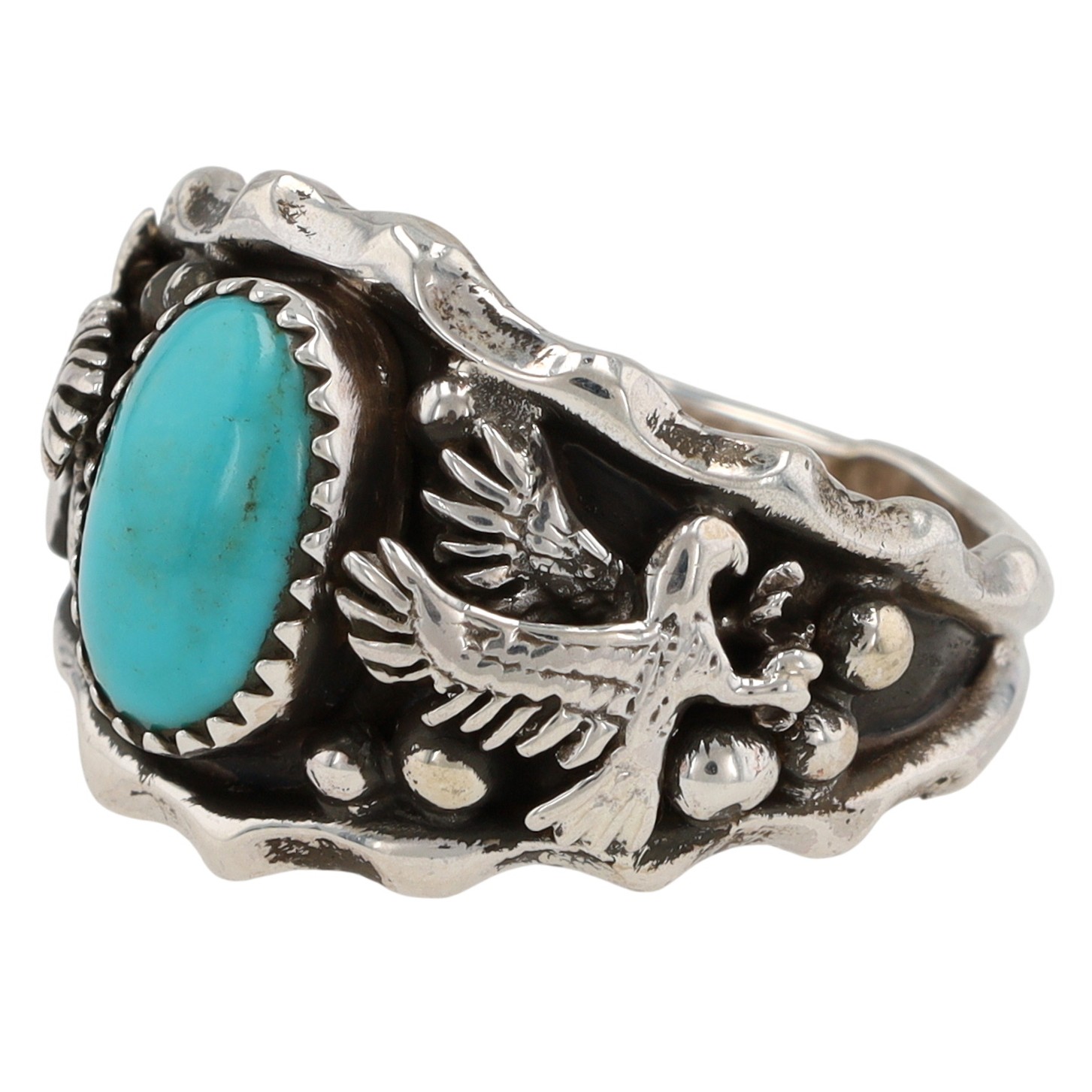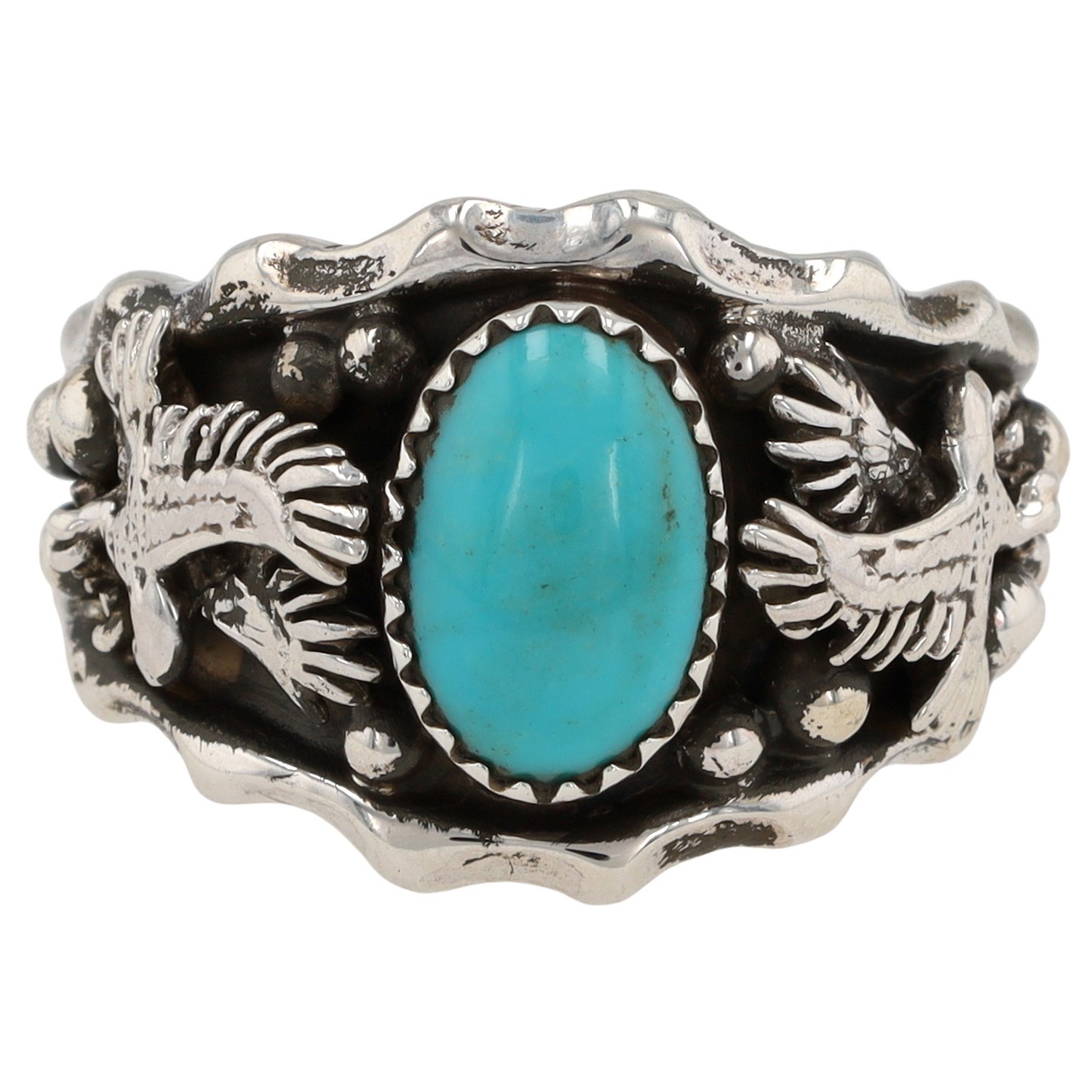 Genevieve Francisco Navajo sterling silver and Kingman turquoise ‘Double Eagle’ ring by Genevieve Francisco. The ring features a central oval turquoise cabochon set within a serrated bezel. The broad shoulders of the ring are adorned with relief carvings of stylized avian figures, identified as eagles, alongside spherical accents against an oxidized background, framed by a wavy-edged border. The interior of the band is stamped with ".925" and a stylized bear mark, consistent with Native American hallmarks.
