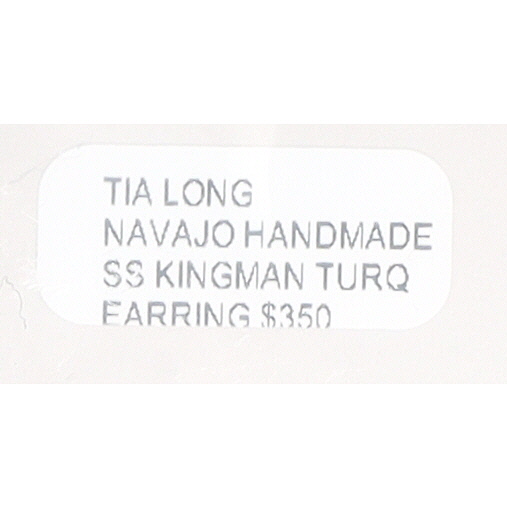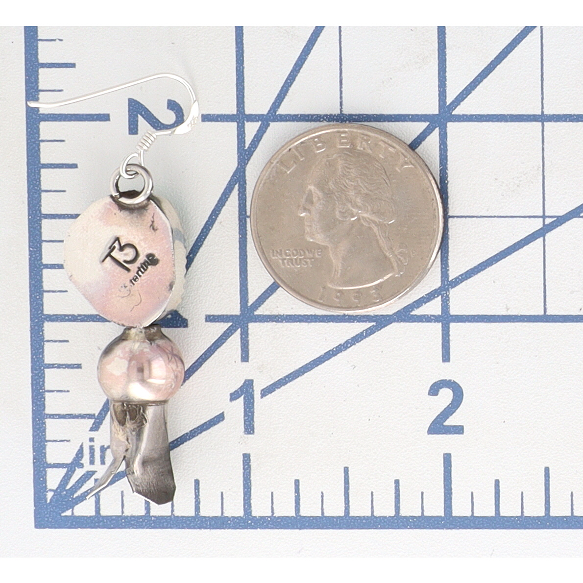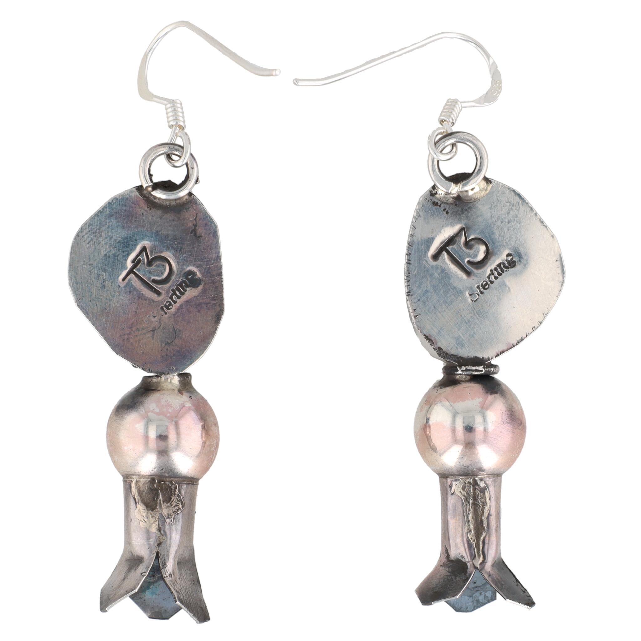 A pair of Navajo sterling silver turquoise squash blossom dangle earrings by Tia Long. Each earring features an oval, cabochon-cut turquoise stone with brown matrix, bezel-set in sterling silver. Suspended below the stone is a hollow, bell-shaped, fluted element, topped by a rounded bead, characteristic of the squash blossom design. The reverse of the top element on each earring is visibly marked "Sterling" and includes a stylized "T3" initial. The ear wire hooks are stamped "925".