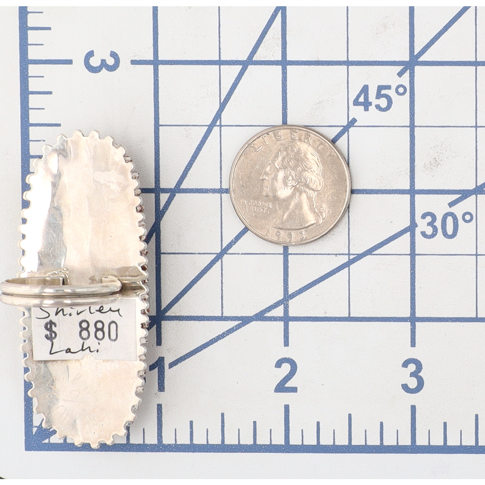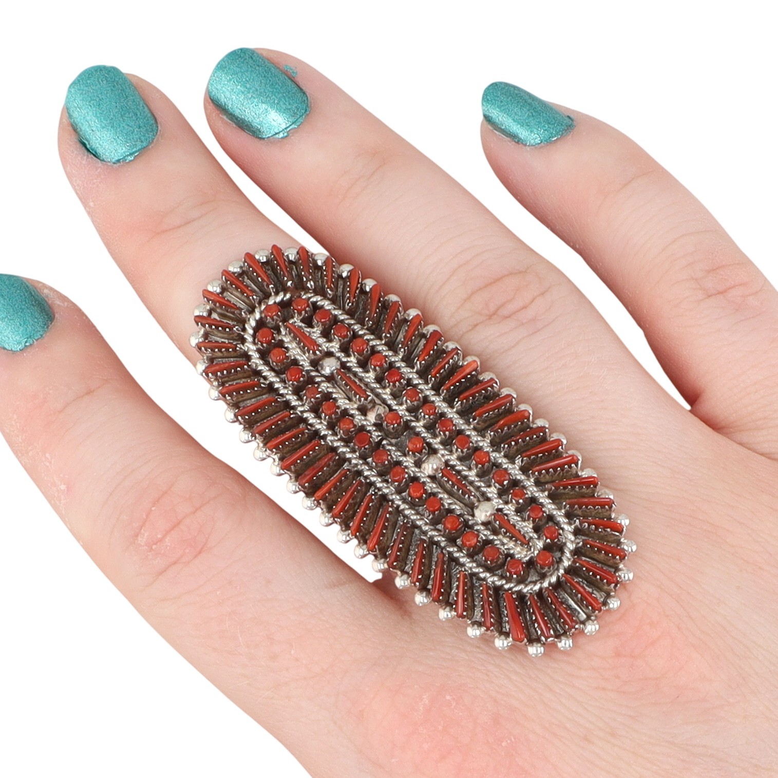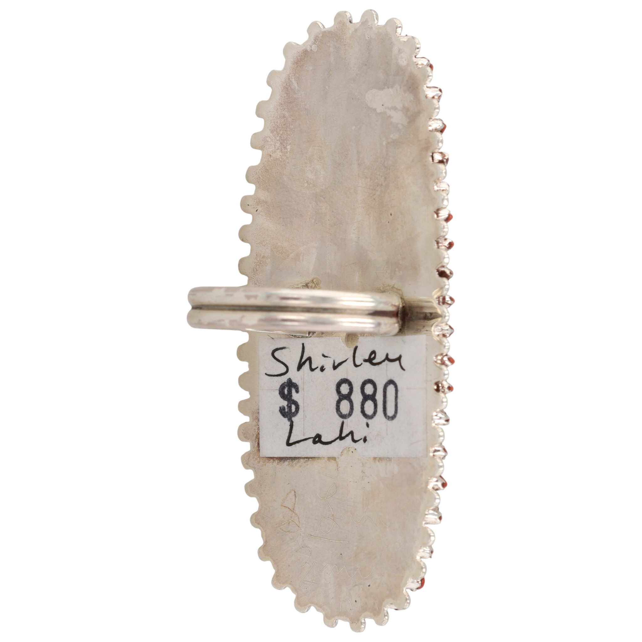 A Zuni coral and sterling silver cluster ring by Shirley Lahi. This large, elongated oval cocktail ring is executed in a needlepoint design, set with numerous small, cut pieces of reddish-orange material, consistent with coral, meticulously arranged in concentric and radiating patterns within a silver-tone metal setting. The ring features a double-band shank and incorporates fine granulation details along the bezel. The reverse side bears a handwritten retail sticker indicating "Shirley $ 880 Lahi" and an etched signature that appears to read "S. Lahi" or "Shirley Lahi" followed by "Zuni."
