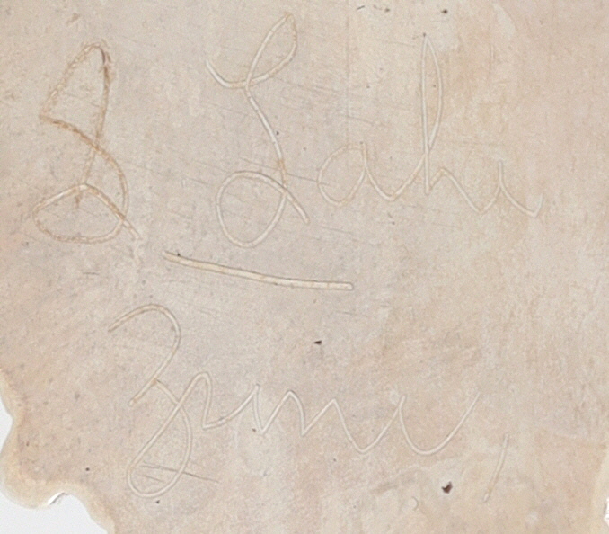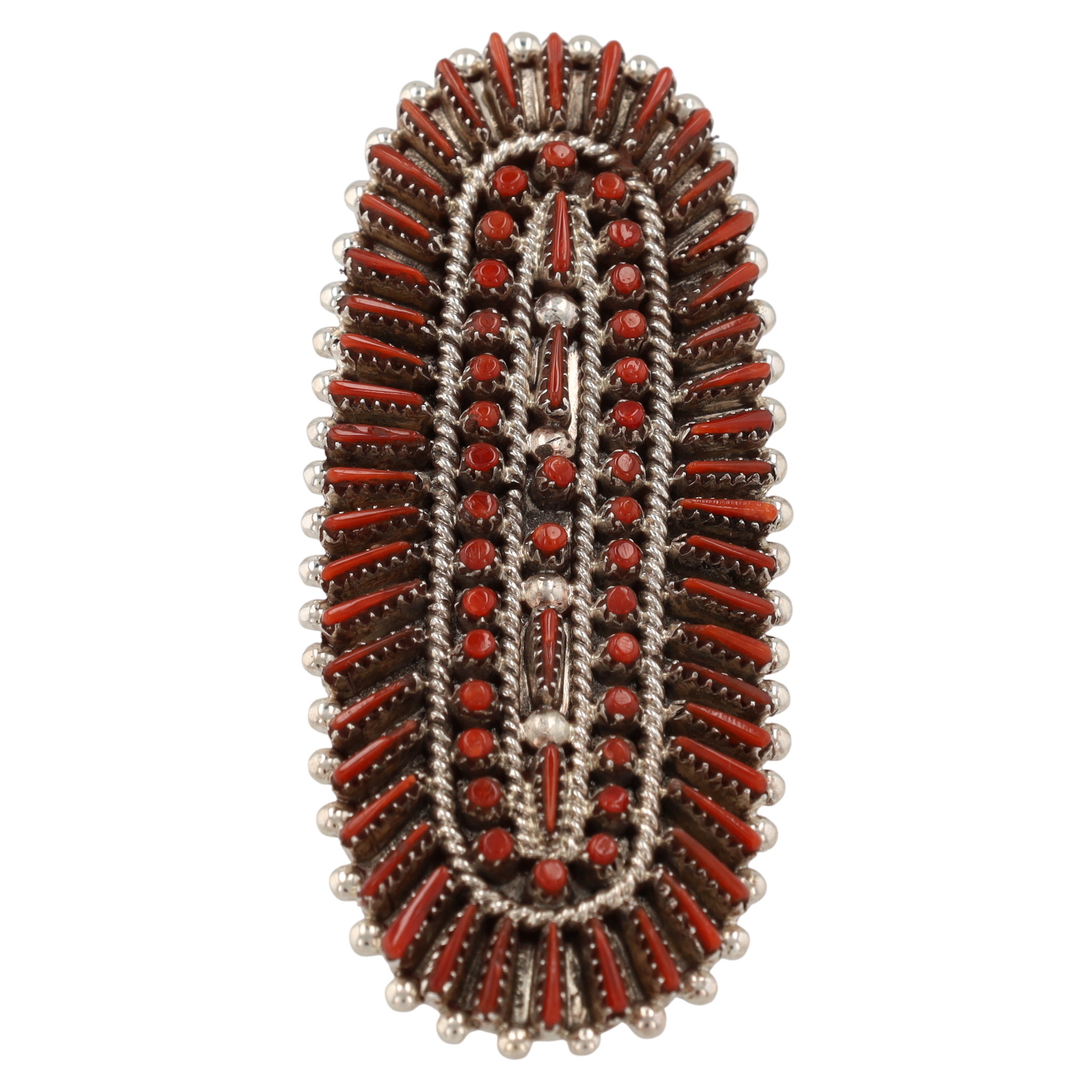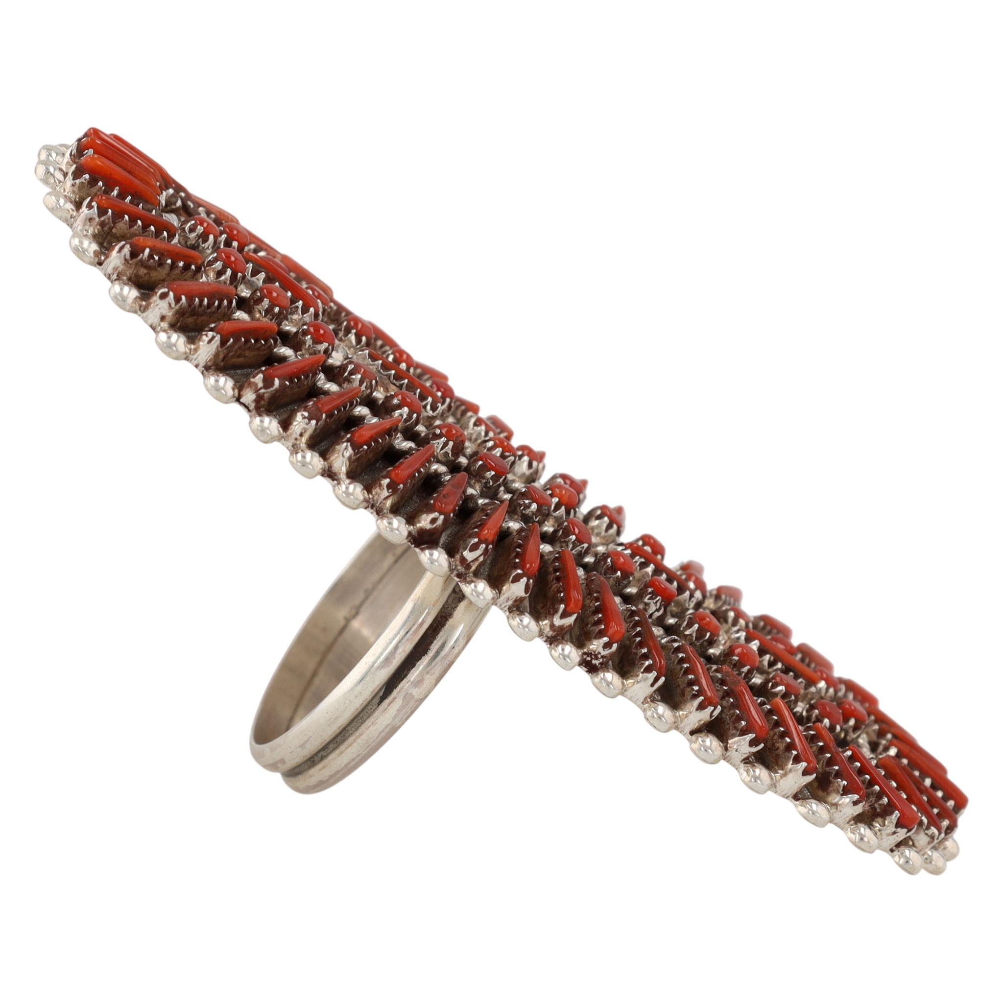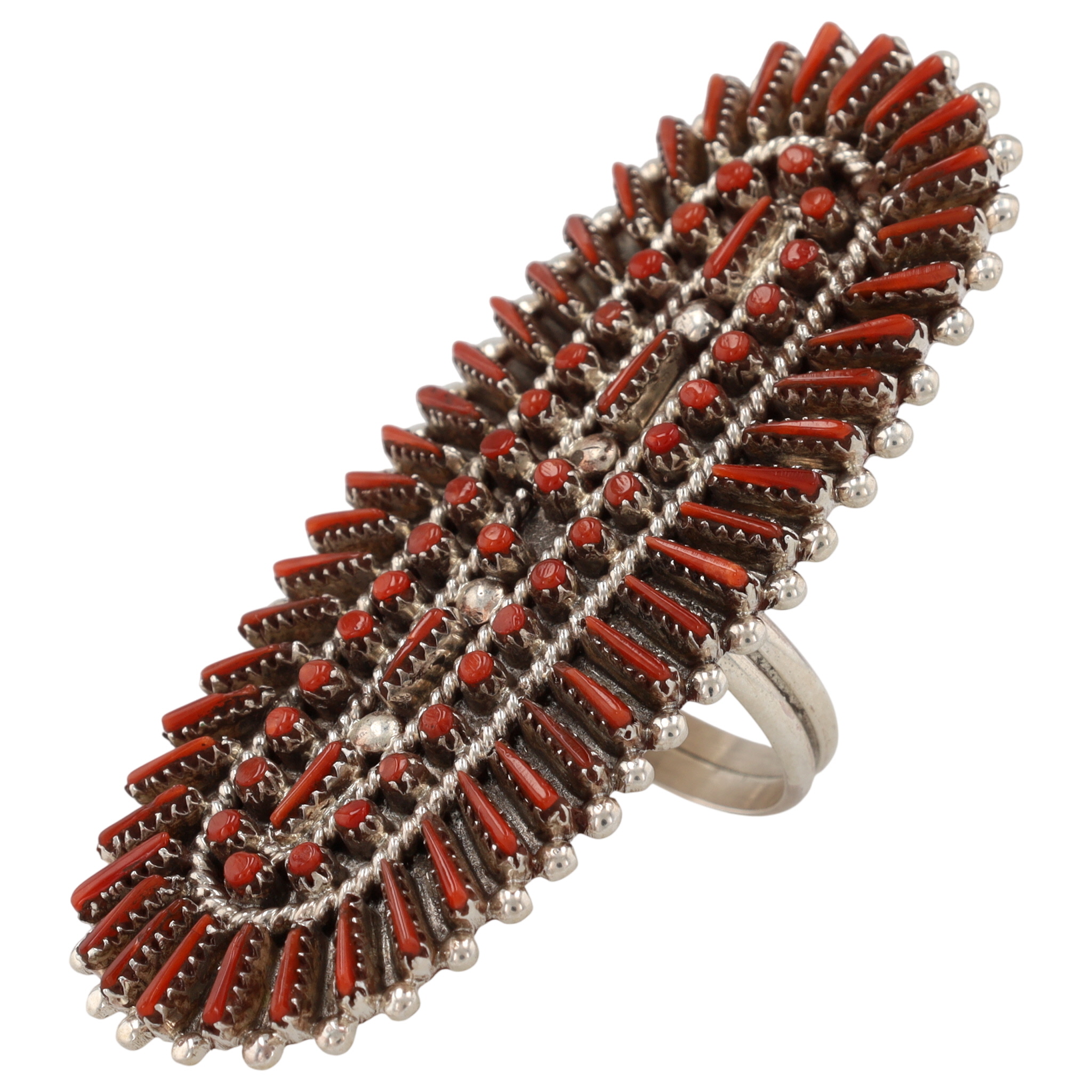 A Zuni coral and sterling silver cluster ring by Shirley Lahi. This large, elongated oval cocktail ring is executed in a needlepoint design, set with numerous small, cut pieces of reddish-orange material, consistent with coral, meticulously arranged in concentric and radiating patterns within a silver-tone metal setting. The ring features a double-band shank and incorporates fine granulation details along the bezel. The reverse side bears a handwritten retail sticker indicating "Shirley $ 880 Lahi" and an etched signature that appears to read "S. Lahi" or "Shirley Lahi" followed by "Zuni."