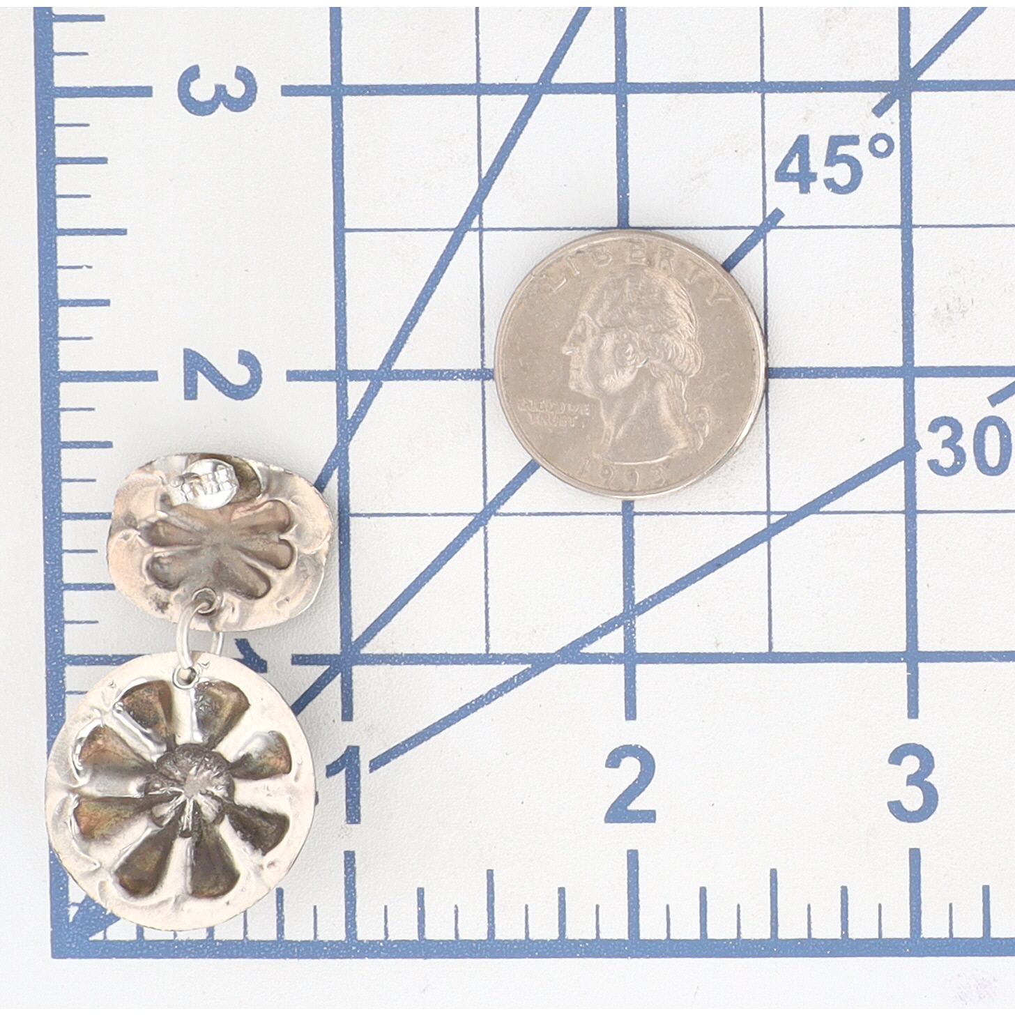 A pair of Navajo Kingman turquoise concho dangle earrings by Joan Begay. Each earring is crafted from silver-toned metal and features a two-part articulated design, with an oval upper element and a circular lower element. Both elements exhibit a repoussé or stamped floral motif with textured borders. The lower section of each earring is centrally set with a small, round, bezel-set Kingman turquoise cabochon. The reverse of each earring is fitted with post and butterfly backings. An accompanying label identifies the artist as ‘JOAN BEGAY’ and confirms the ‘NAVAJO HANDMADE’ origin and ‘KINGMAN TURQ’ material.