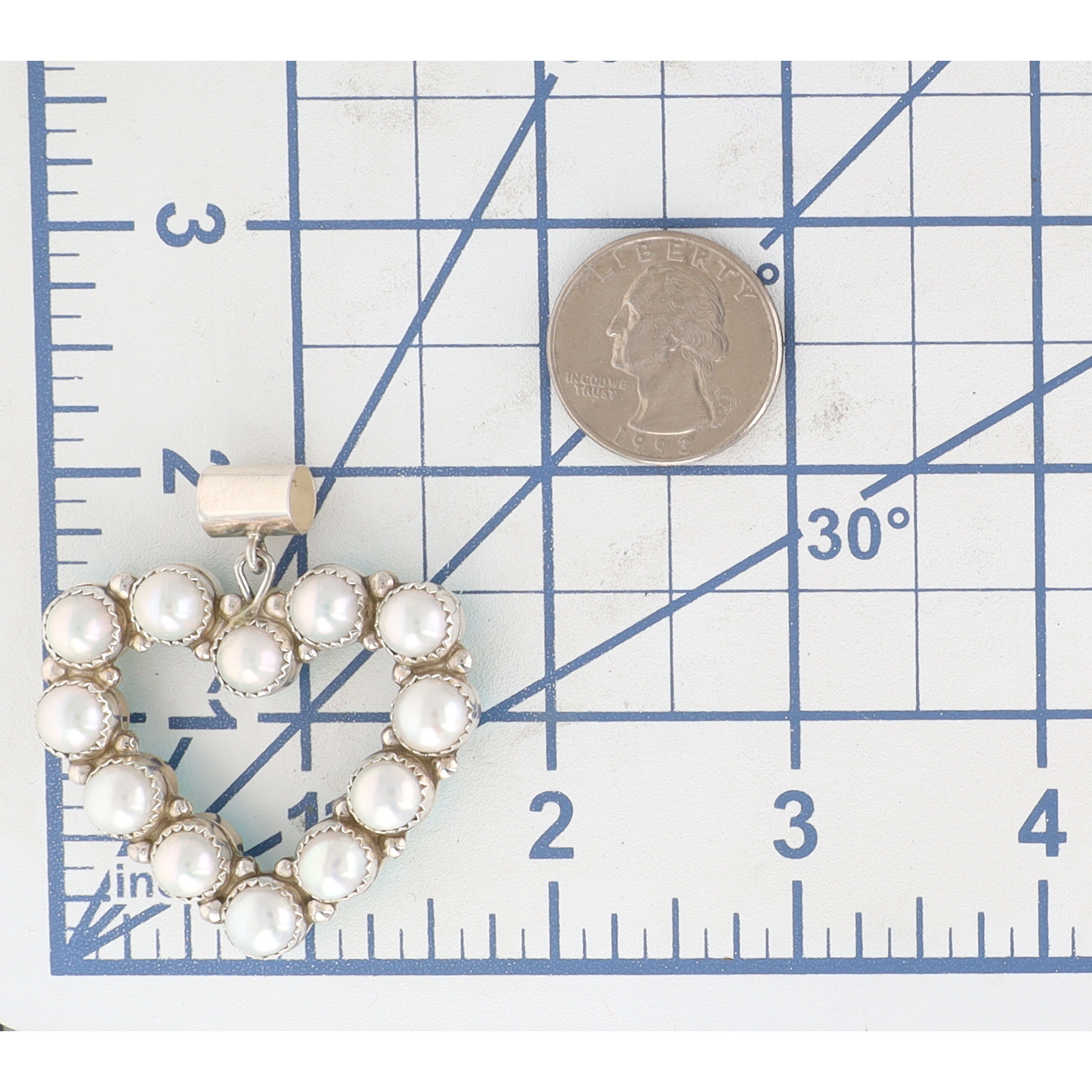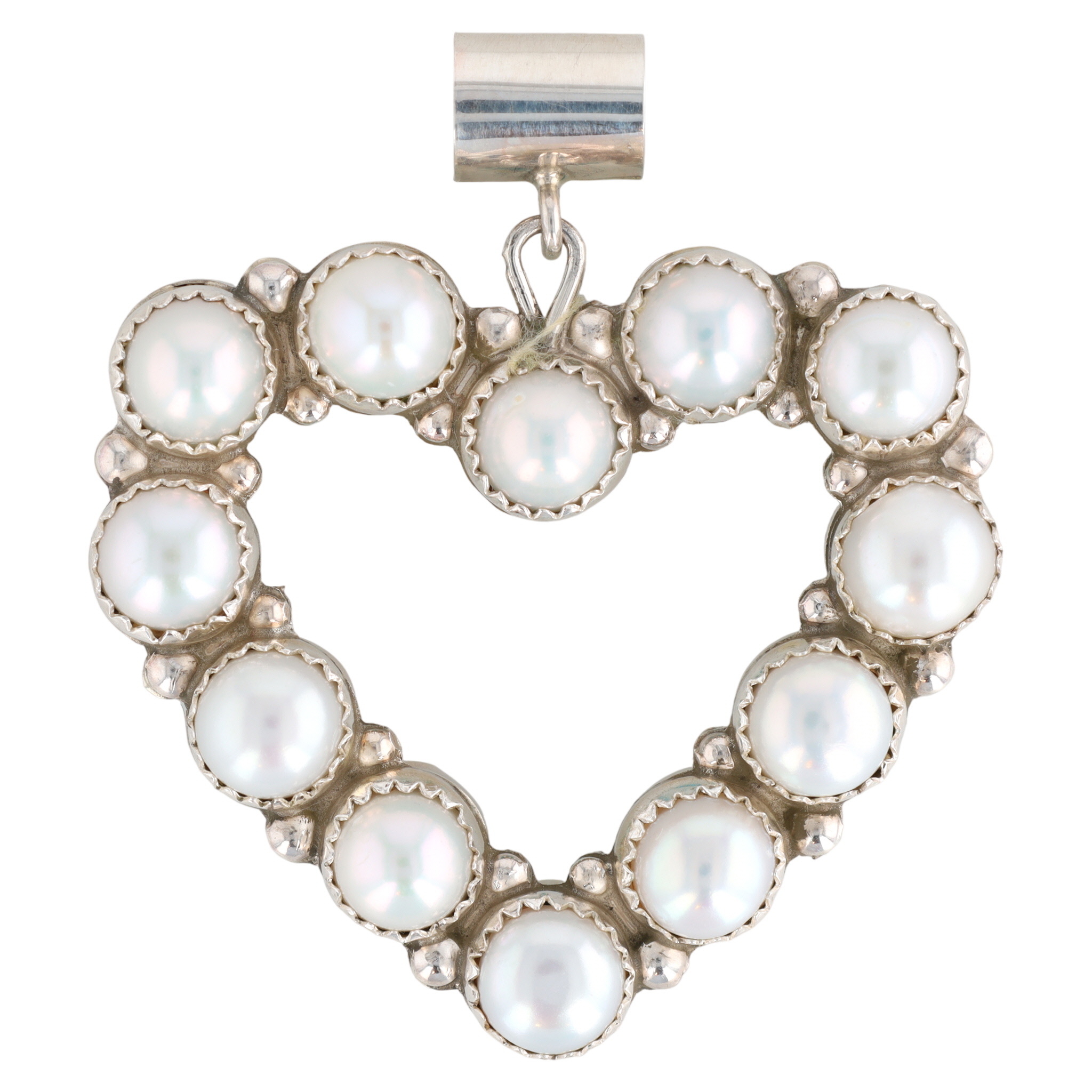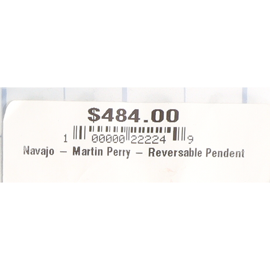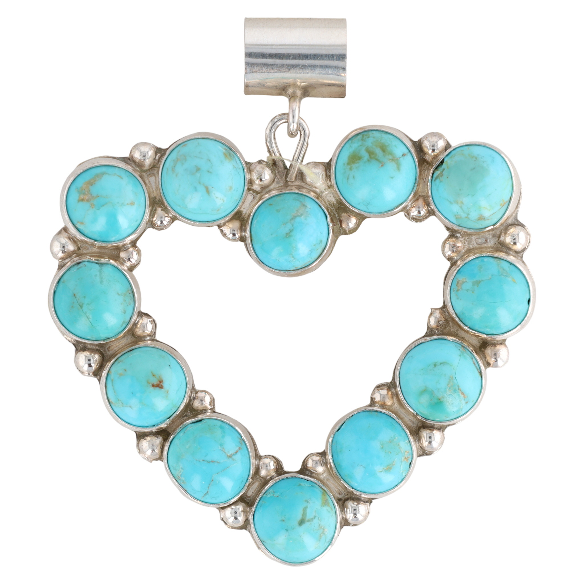 A Navajo Martin Perry sterling silver reversible heart-shaped pendant. One side features fourteen bezel-set, round, white, lustrous cabochons, consistent in appearance with pearls. The reverse displays fourteen bezel-set, round, polished blue-green stones with visible matrix, resembling turquoise. Small spherical elements adorn the metalwork between each stone setting, forming the heart’s perimeter. The pendant is suspended by a plain, rectangular bail. No visible maker’s marks or material fineness stamps are apparent on the item itself.