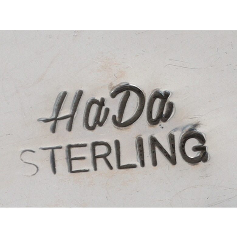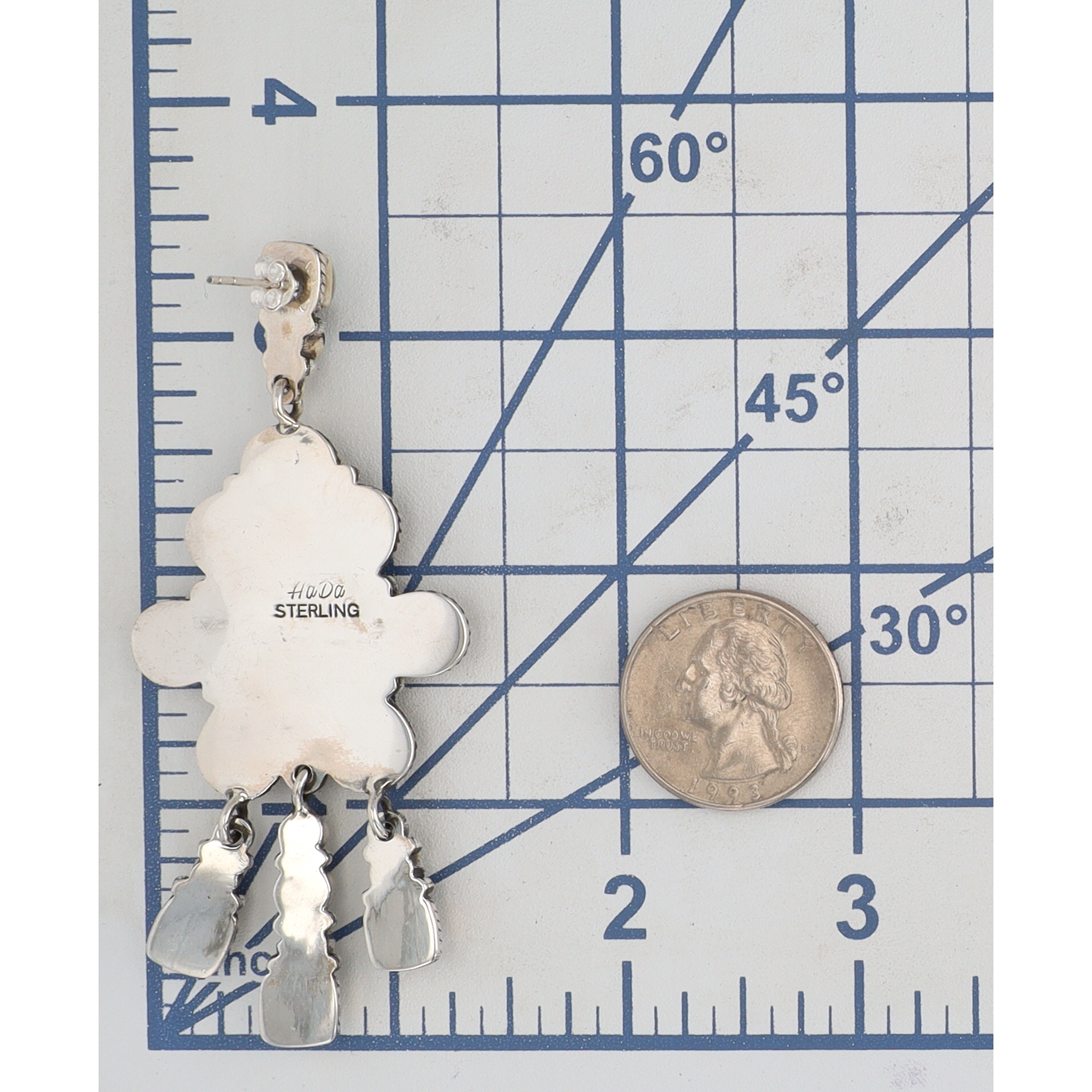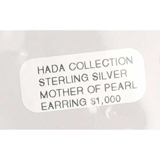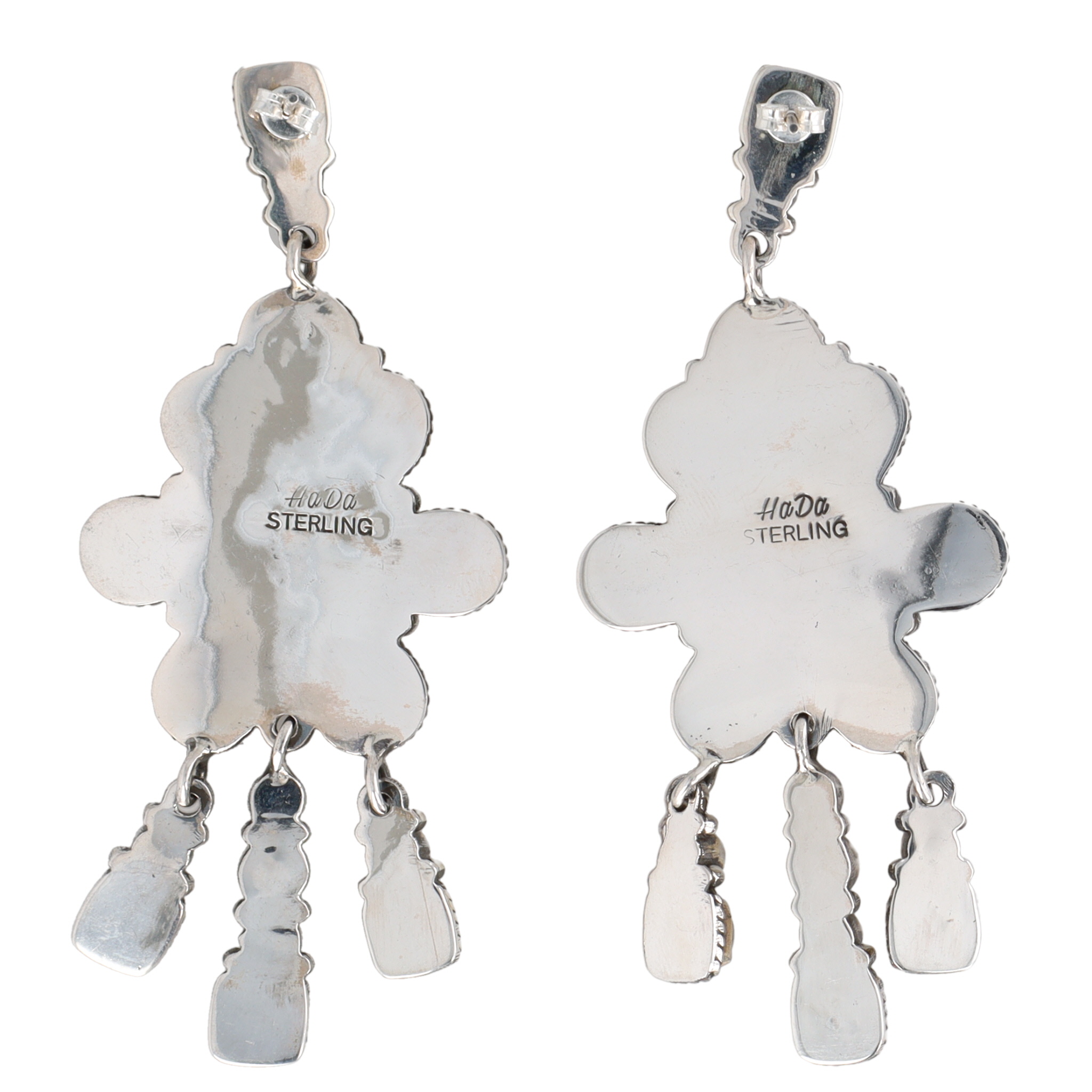 A pair of HaDa Collection sterling silver and mother-of-pearl dangle earrings. Each earring features a multi-lobed, stylized floral or organic form adorned with numerous bezel-set mother-of-pearl cabochons and rope-twist detailing. Three graduated drops, also set with mother-of-pearl, suspend from the main body. The reverse of each earring is stamped "HADA" in a script font above "STERLING" in block letters. An accompanying label identifies them as from the "HADA COLLECTION, " made of "STERLING SILVER, " and featuring "MOTHER OF PEARL."