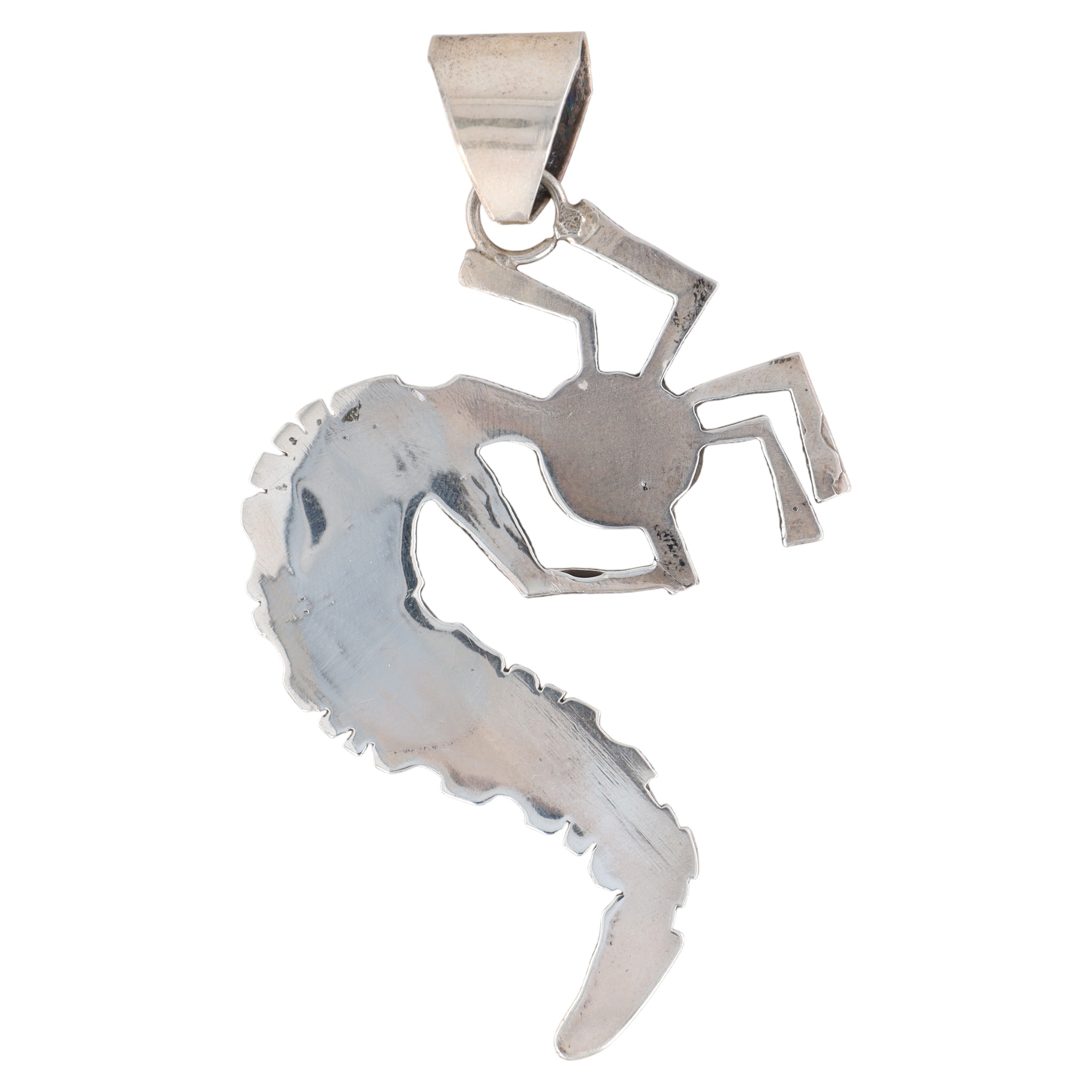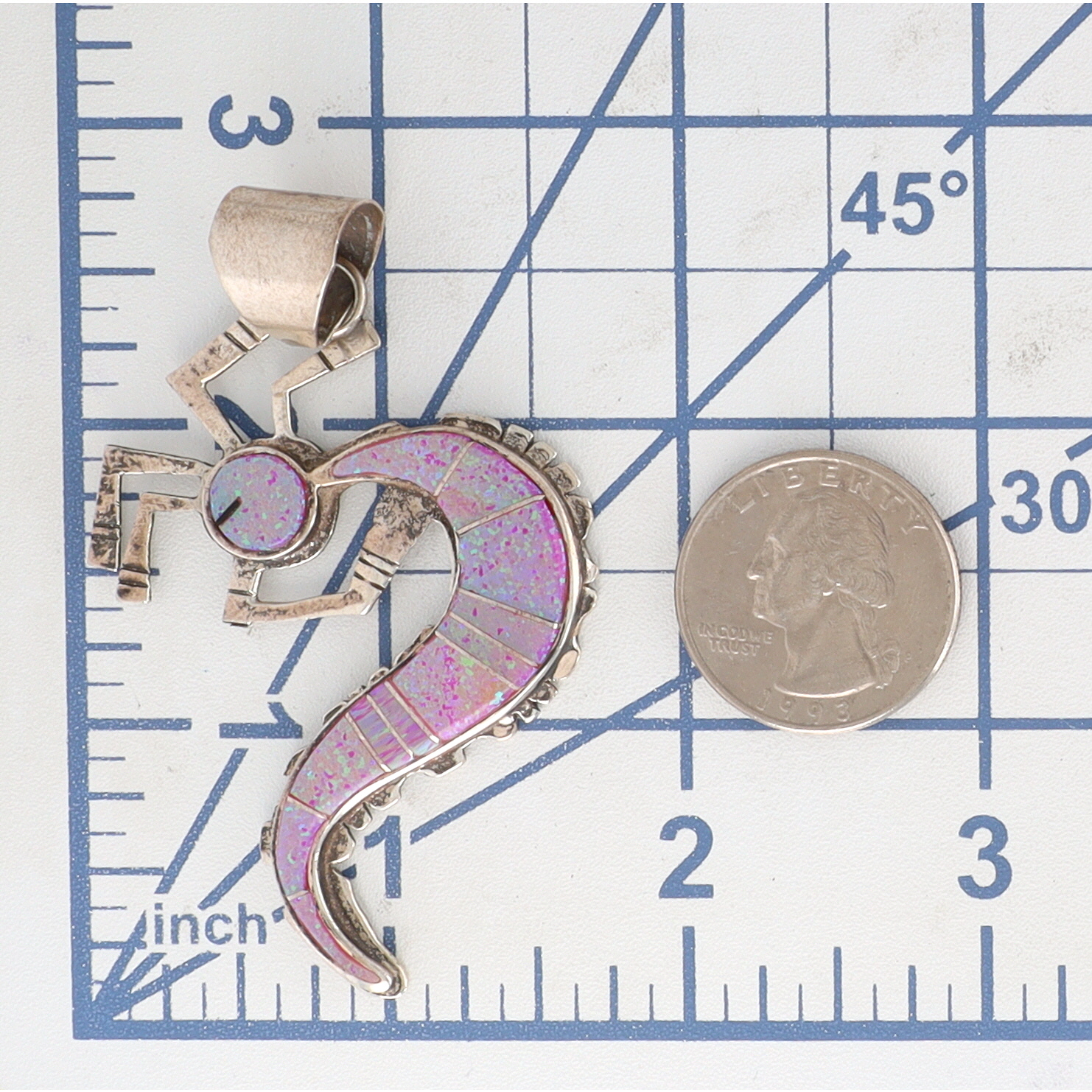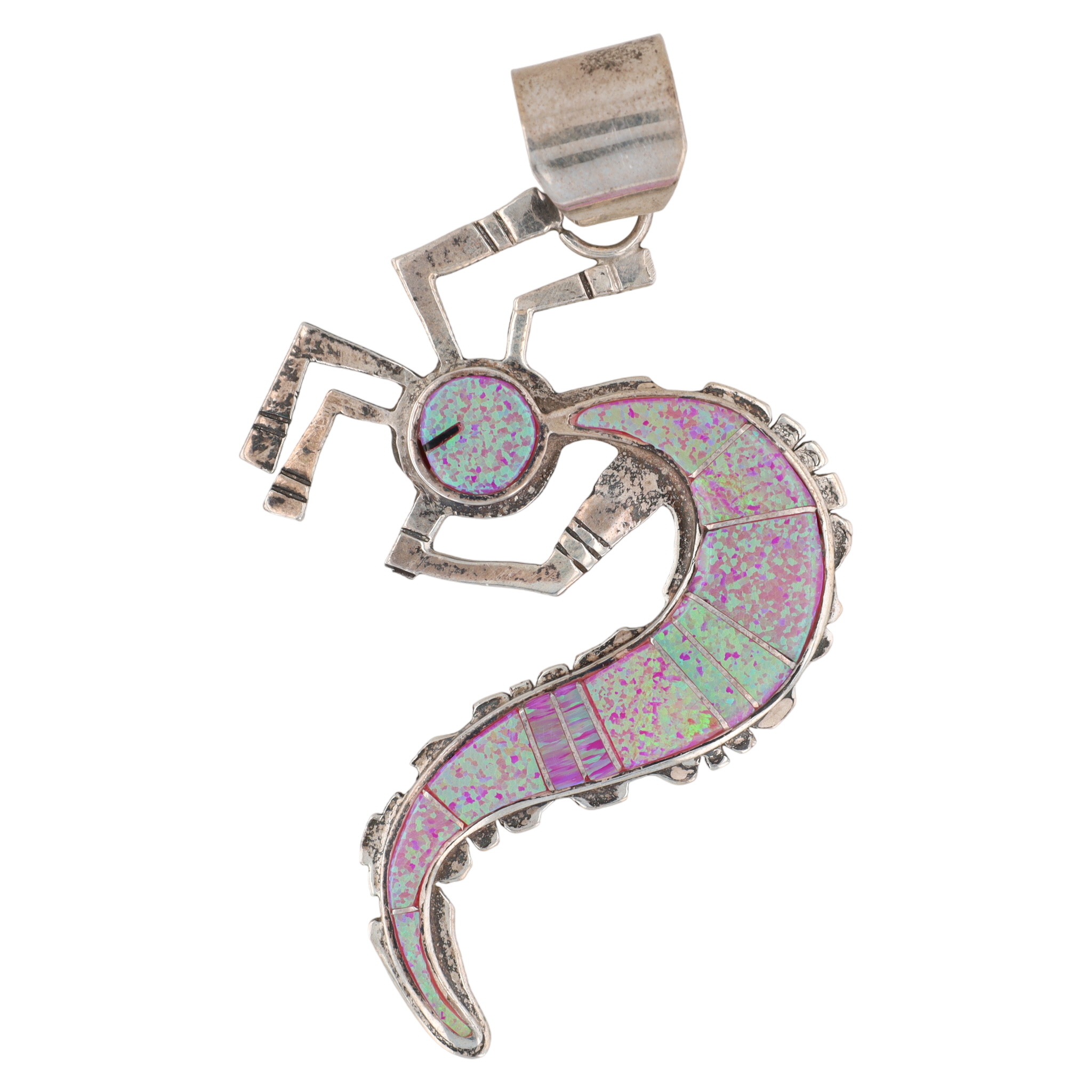 A Navajo sterling silver pendant depicting a stylized Kokopelli figure with a segmented, curvilinear lower body. The front features mosaic or channel inlay of a highly iridescent material, primarily displaying vibrant pink, purple, and green flashes, consistent with fire opal. The reverse is polished metal.