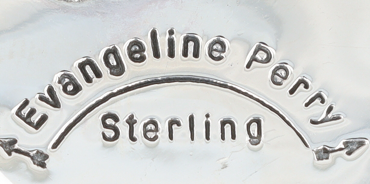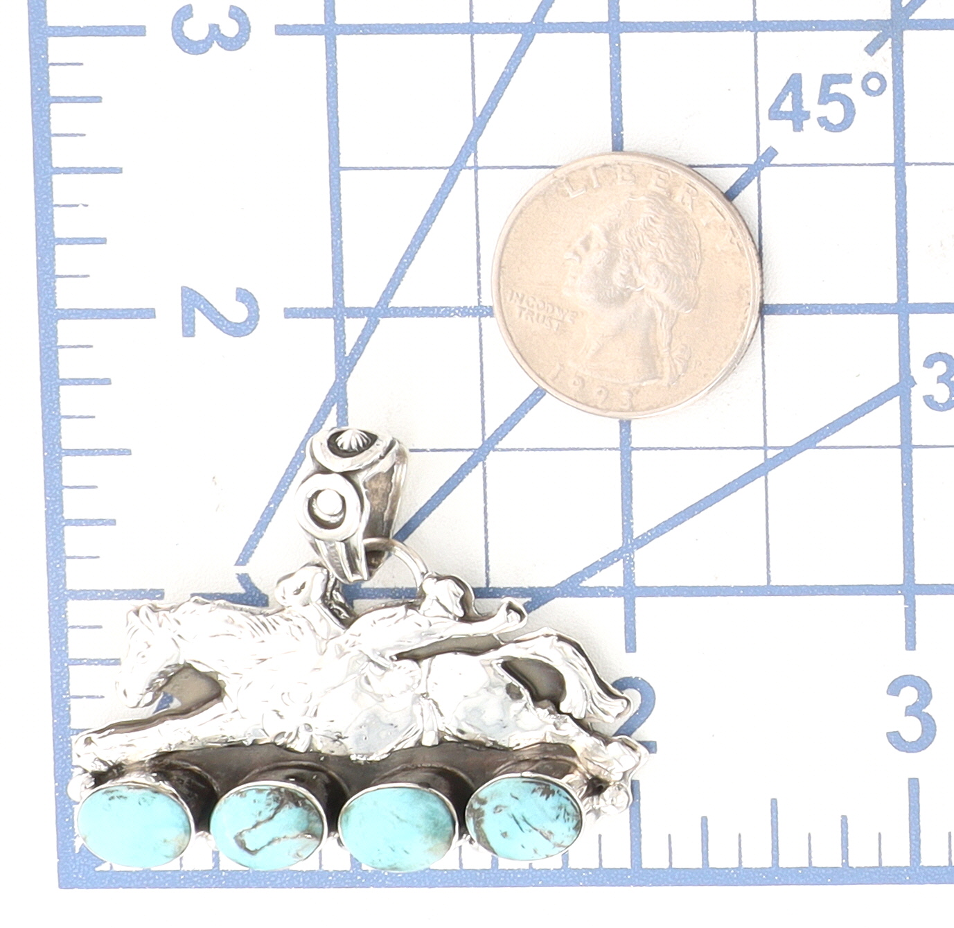 A sterling silver pendant by Navajo artist Evangeline Perry. The pendant features a detailed relief of two riders on horseback positioned above a horizontal row of four bezel-set, oval Kingman turquoise cabochons. The reverse of the pendant is clearly stamped with the maker’s mark "Evangeline Perry" and "Sterling". An attached retail sticker further identifies the piece as "NAVAJO HANDMADE" and confirms the use of "KINGMAN TURQ" and "S/S" (Sterling Silver).
