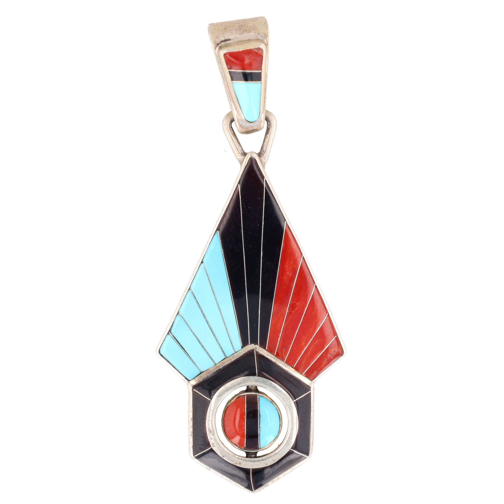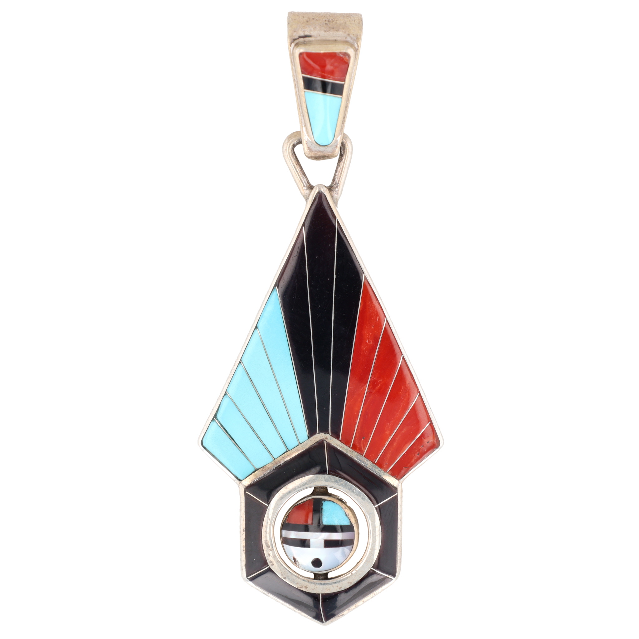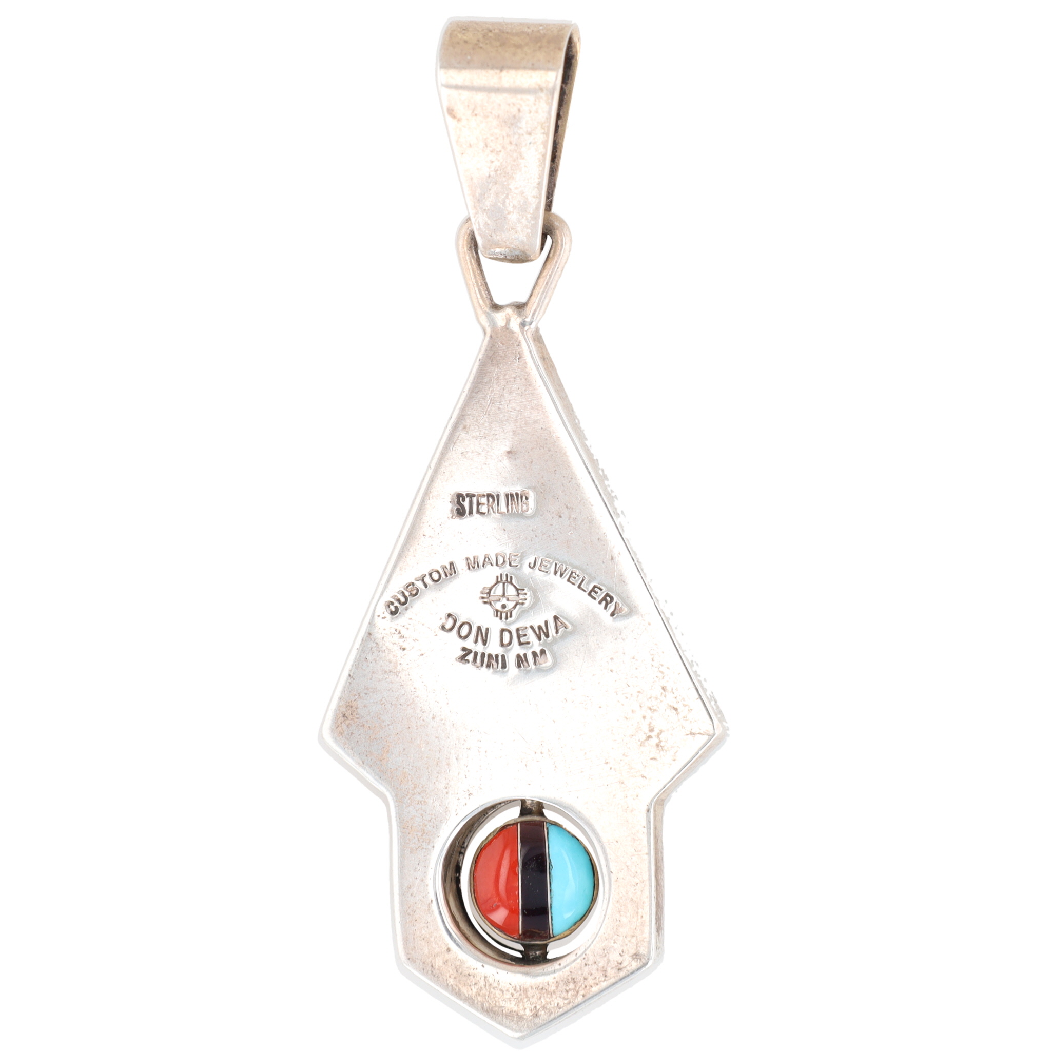 A Zuni sterling silver multi-stone sunface spinner pendant by Don Dewa. Executed in a Southwestern Native American style, the front displays radiating sections of turquoise, onyx, and coral inlay. It culminates in a hexagonal base containing a central, circular spinning element inlaid with similar materials, including white shell. The reverse is stamped "STERLING, " "CUSTOM MADE JEWELERY" (sic), bears a distinctive hallmark, and is further marked "DON DEWA ZUNI NM."