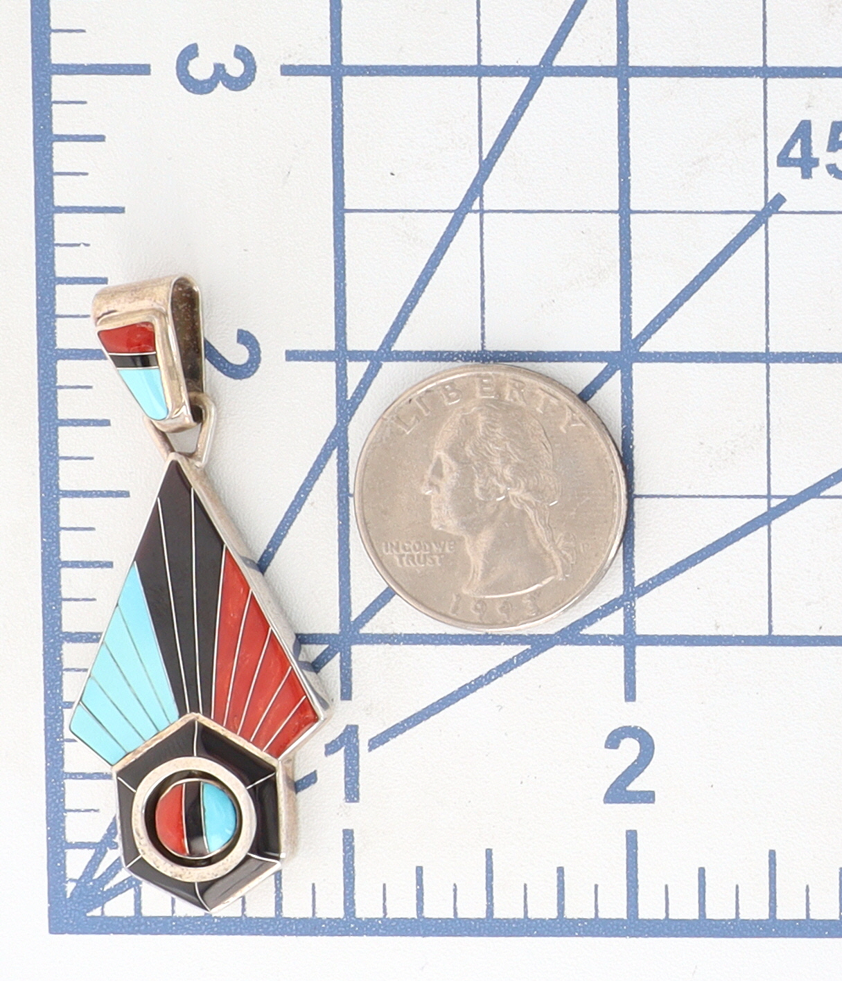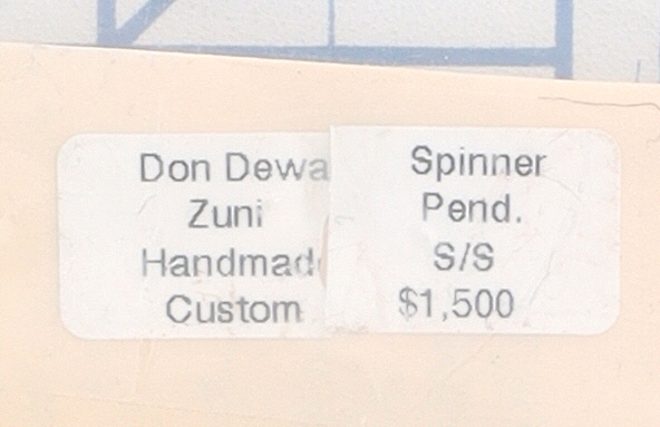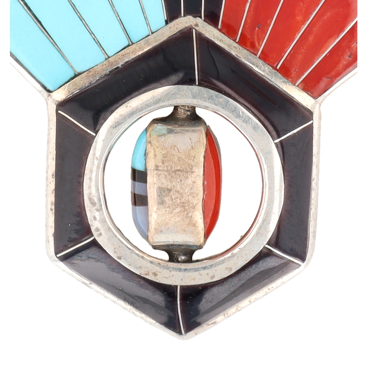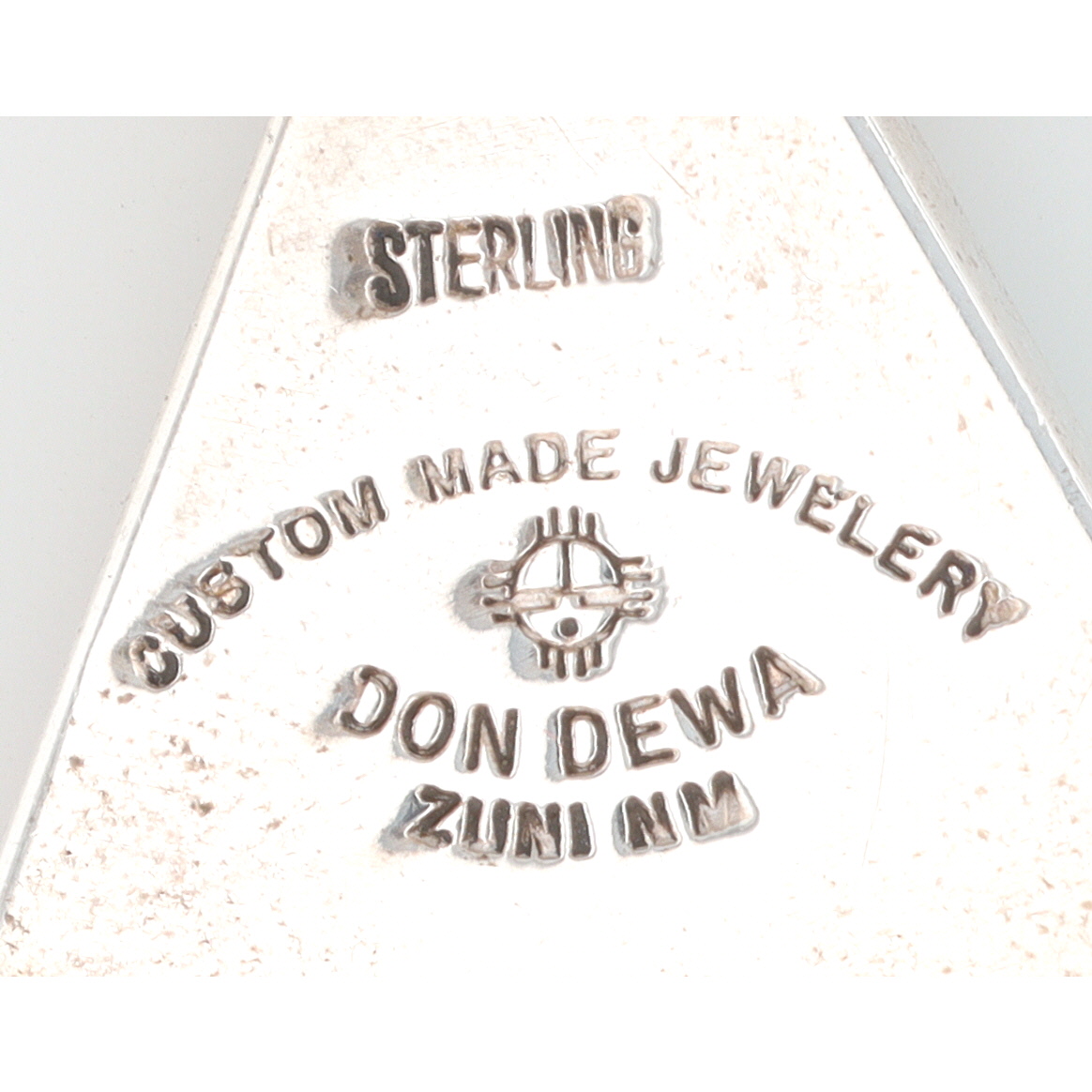 A Zuni sterling silver multi-stone sunface spinner pendant by Don Dewa. Executed in a Southwestern Native American style, the front displays radiating sections of turquoise, onyx, and coral inlay. It culminates in a hexagonal base containing a central, circular spinning element inlaid with similar materials, including white shell. The reverse is stamped "STERLING, " "CUSTOM MADE JEWELERY" (sic), bears a distinctive hallmark, and is further marked "DON DEWA ZUNI NM."