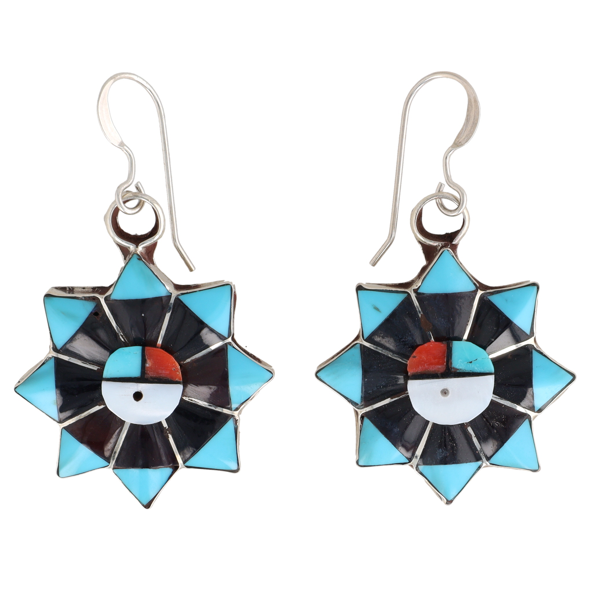 Zuni Multi Stone Sunface Sterling Silver Dangle Earrings by Clayton Vacit