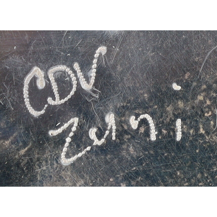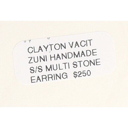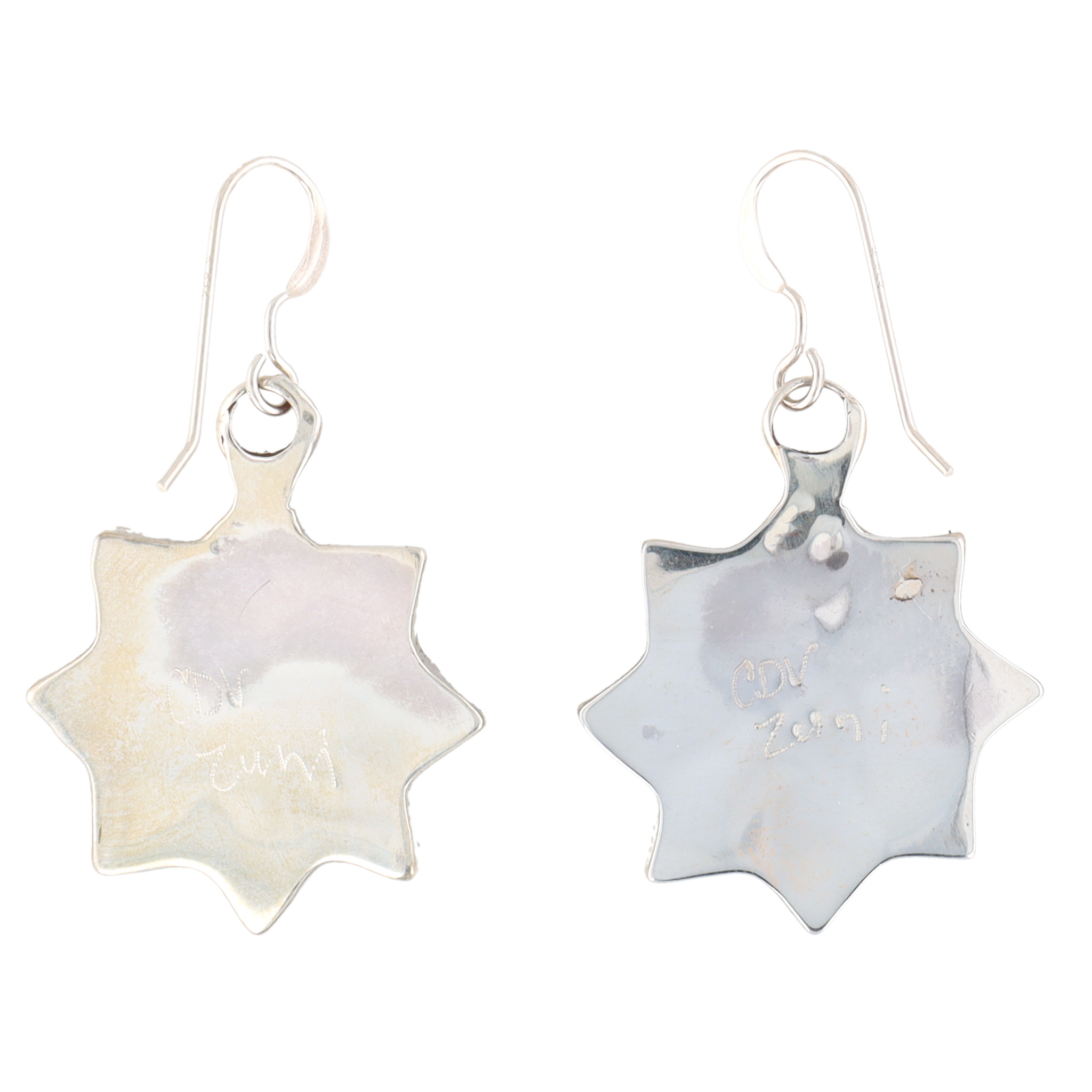 A pair of Zuni Multi Stone Sunface Sterling Silver Dangle Earrings. Each contemporary-style, star-shaped earring is suspended from a silver-tone fish hook finding. The face of each earring is intricately inlaid with multiple polished stones, including turquoise, onyx, coral, mother of pearl, arranged in a radiating pattern around a central motif resembling a stylized sun face. The reverse of both earrings is engraved with "CDV Zuni". An accompanying label identifies the maker as "Clayton Vacit" and the material as "S/S Multi Stone", indicating sterling silver and various stones, further specifying "Zuni Handmade".