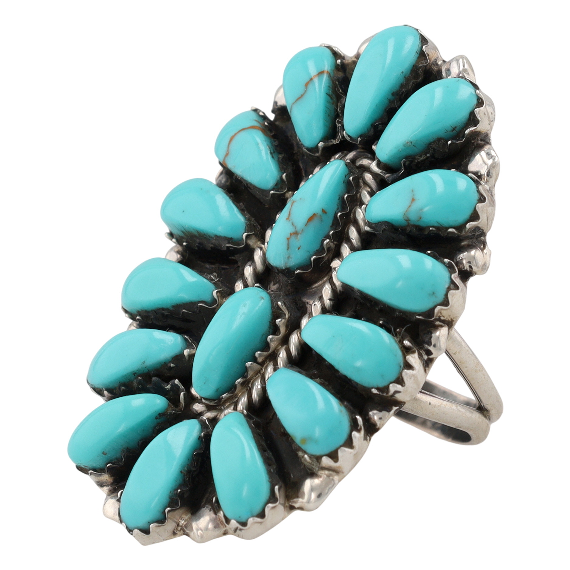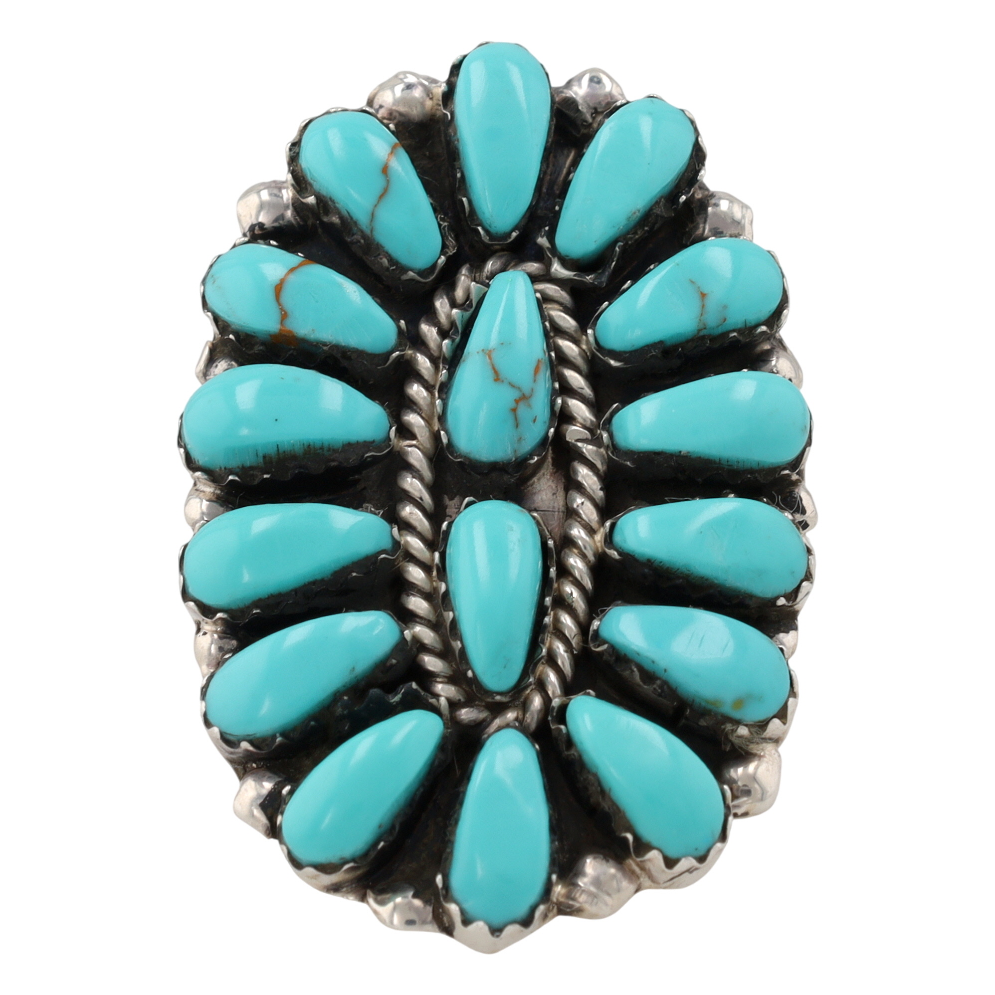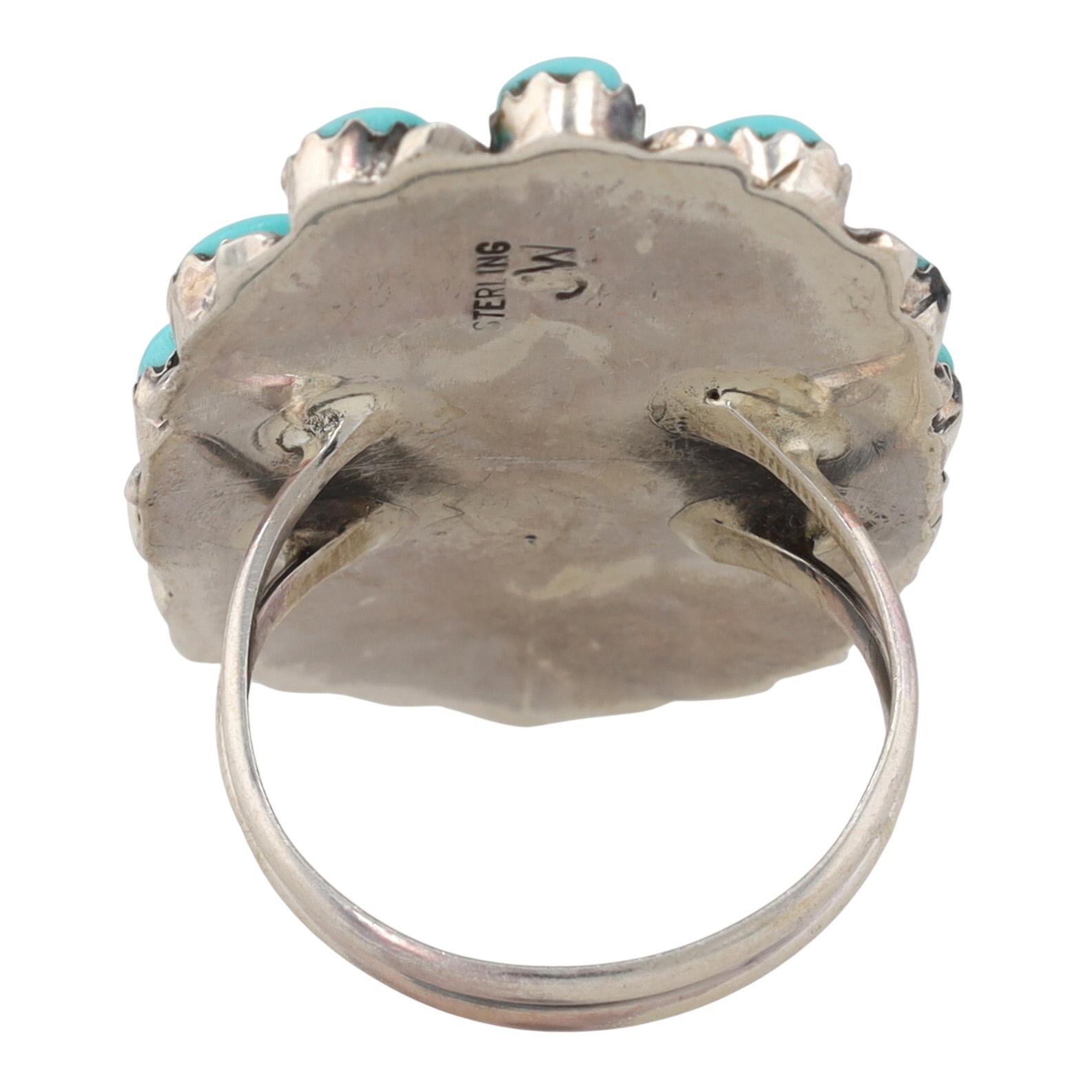 A Juliana William Navajo sterling silver cluster ring, featuring an oval-shaped design set with nineteen tear-drop shaped turquoise cabochons. The design comprises a central turquoise stone surrounded by a twisted wire detail and two concentric rows of additional stones. The reverse of the setting is stamped "STERLING" and bears the maker’s mark "JW". Accompanying tags identify the item as "JULIANA WILLIAM NAVAJO HANDMADE" and "SS TURQUOISE RING SZ.8.5".