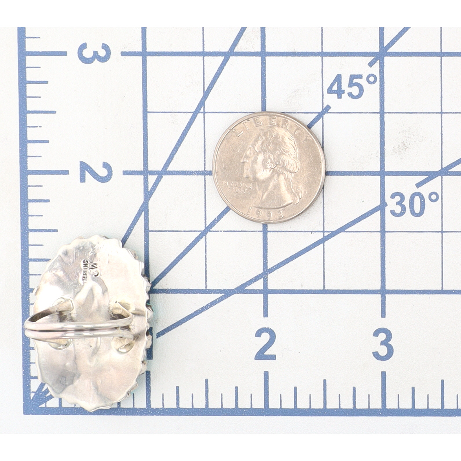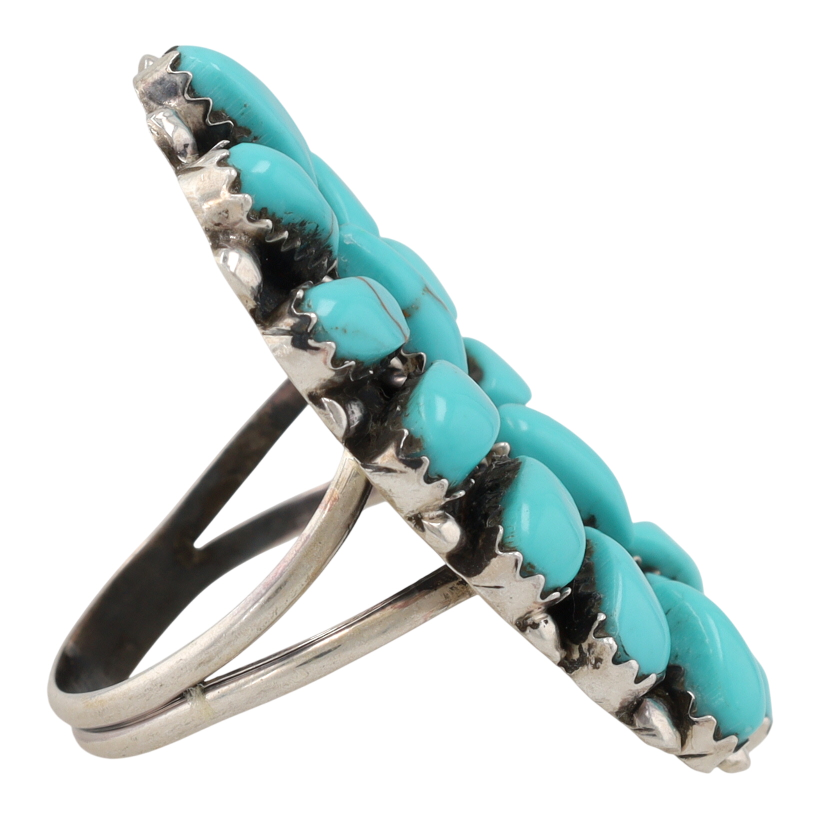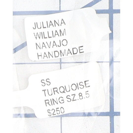 A Juliana William Navajo sterling silver cluster ring, featuring an oval-shaped design set with nineteen tear-drop shaped turquoise cabochons. The design comprises a central turquoise stone surrounded by a twisted wire detail and two concentric rows of additional stones. The reverse of the setting is stamped "STERLING" and bears the maker’s mark "JW". Accompanying tags identify the item as "JULIANA WILLIAM NAVAJO HANDMADE" and "SS TURQUOISE RING SZ.8.5".