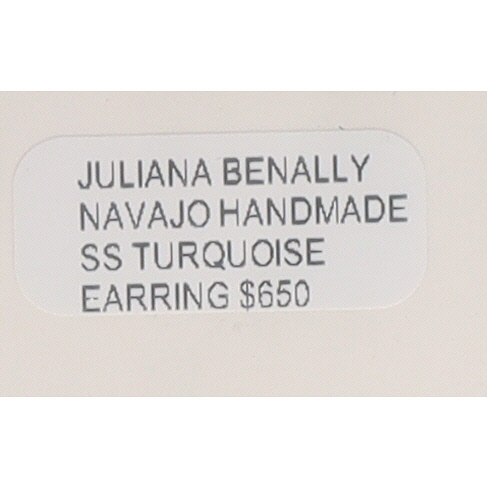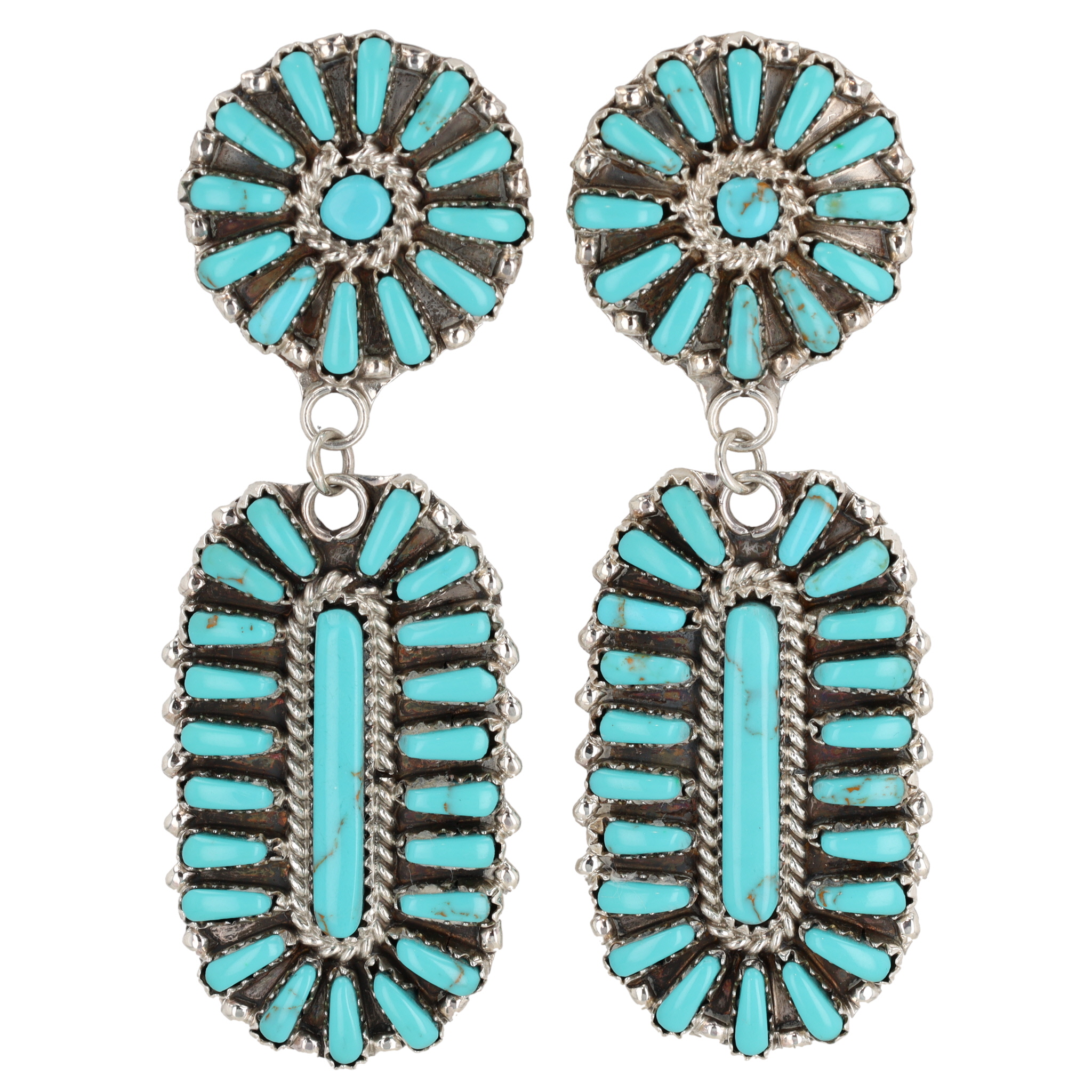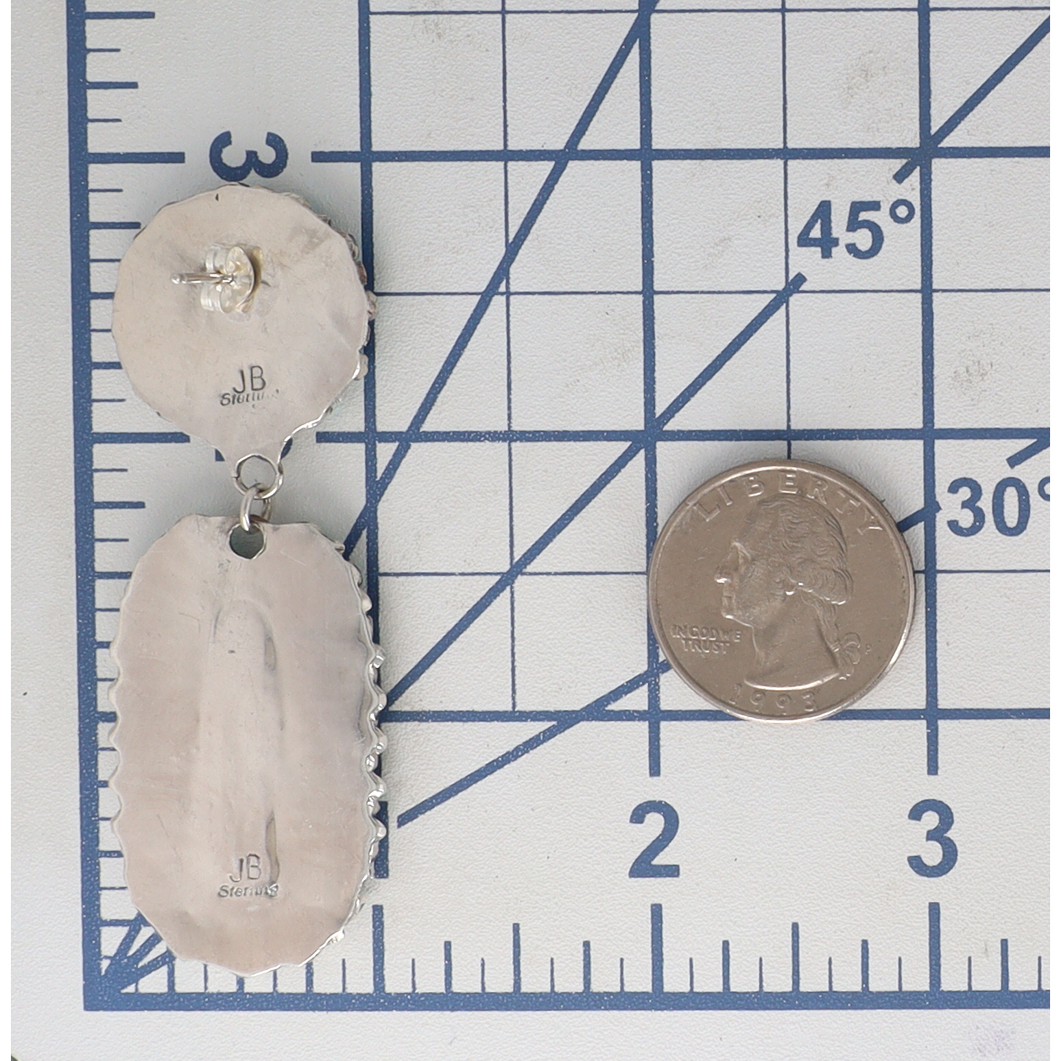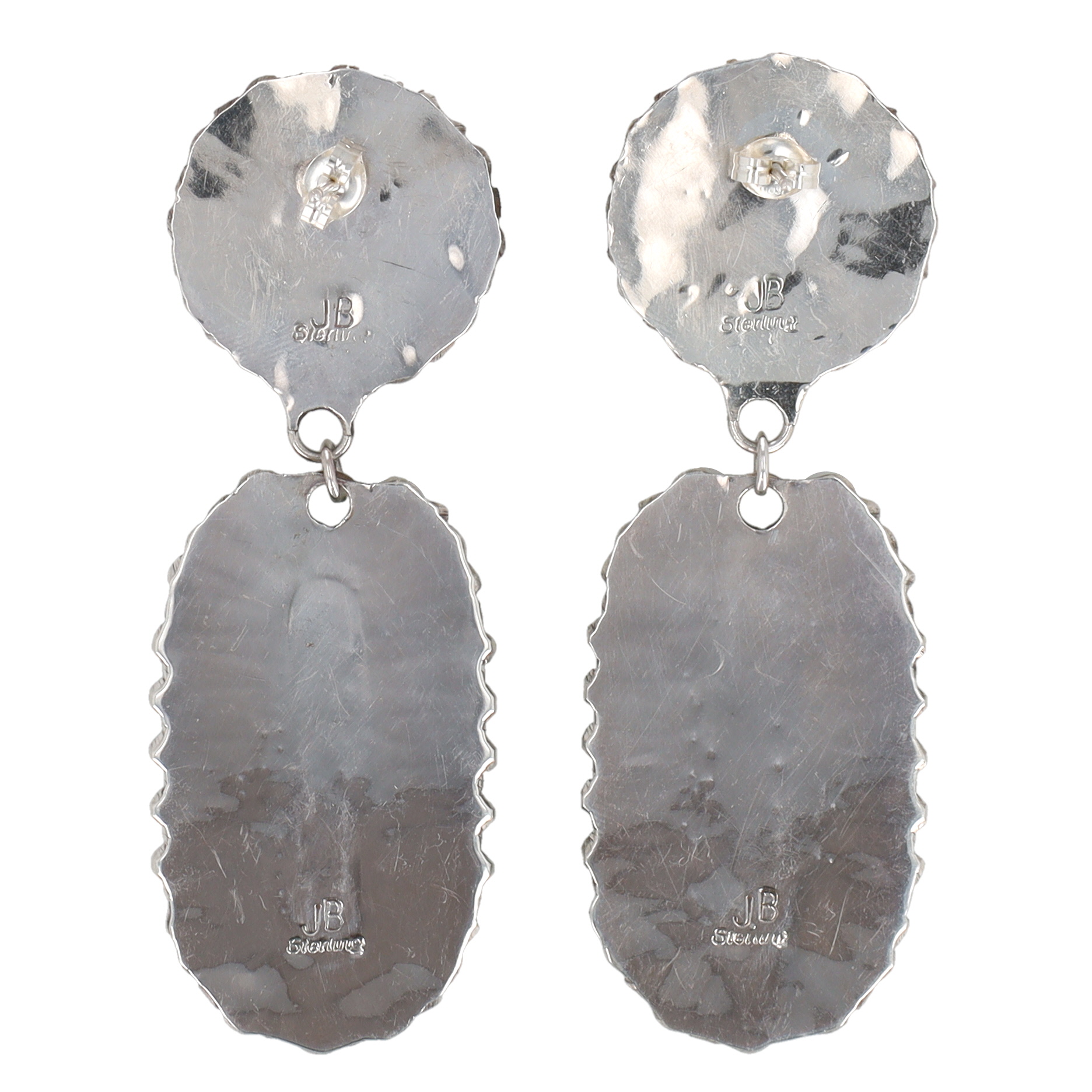 A pair of Navajo turquoise cluster sterling silver dangle earrings by Juliana Benally. Each earring comprises a circular stud top connected to an oval drop. Both sections are crafted from a silver-toned metal and profusely set with numerous small, bezel-set turquoise cabochons, some exhibiting natural matrix. The design features a central stone surrounded by radiating stones on the circular top, and an elongated central stone flanked by rows of smaller stones on the oval drop, characteristic of Southwestern Native American cluster or needlepoint styles, with visible rope-like detailing around the stone settings. The reverse of both the upper and lower sections of each earring is clearly stamped "JB Sterling."