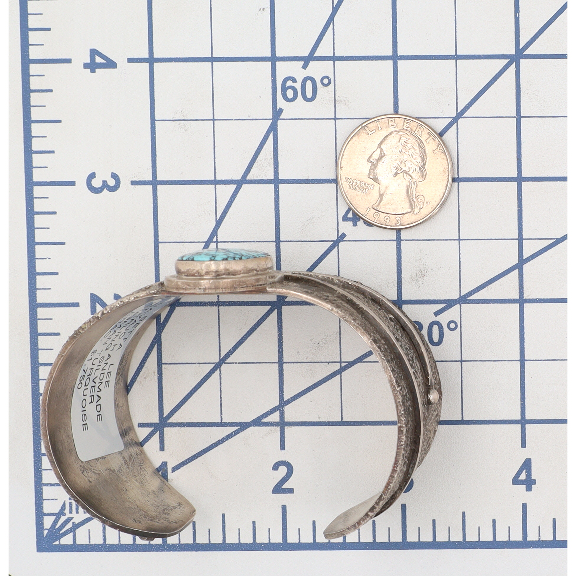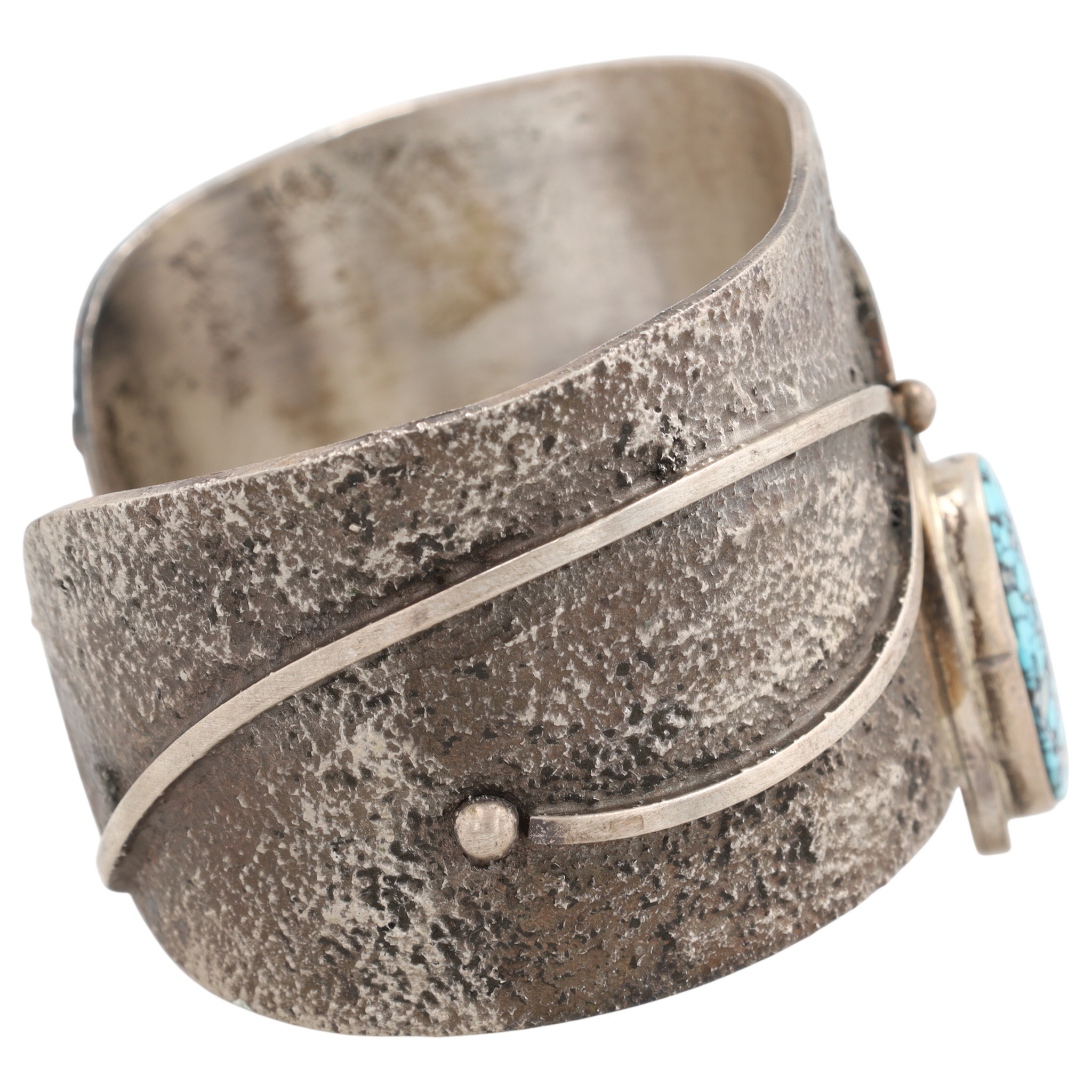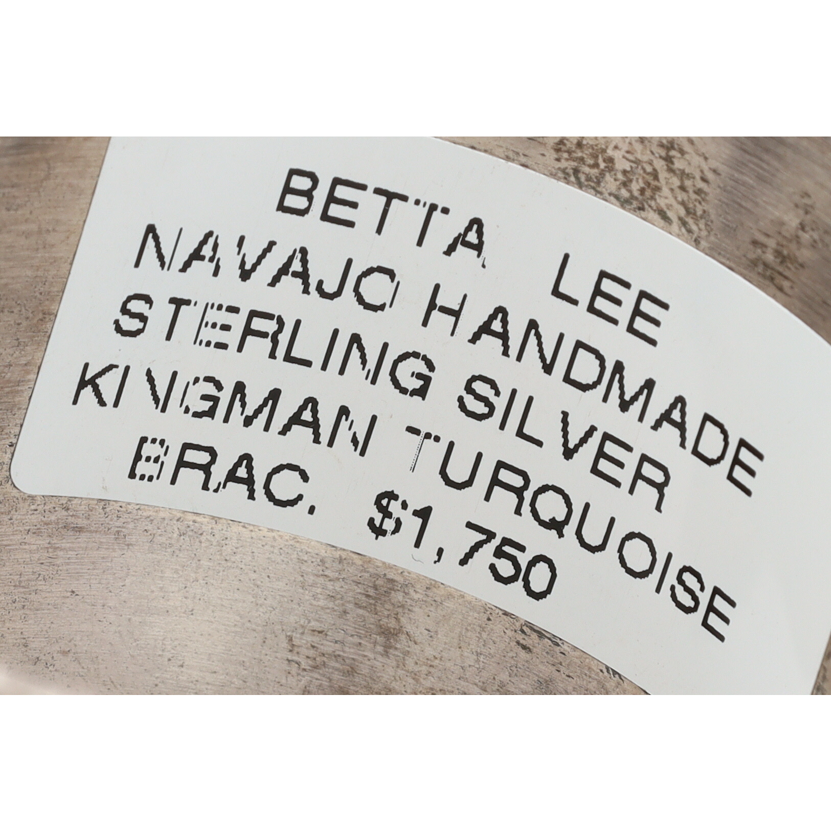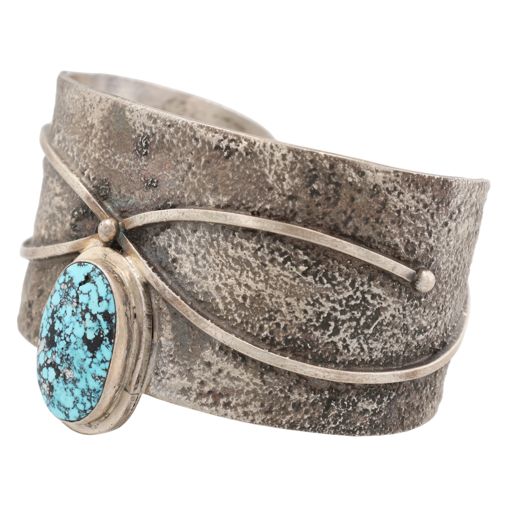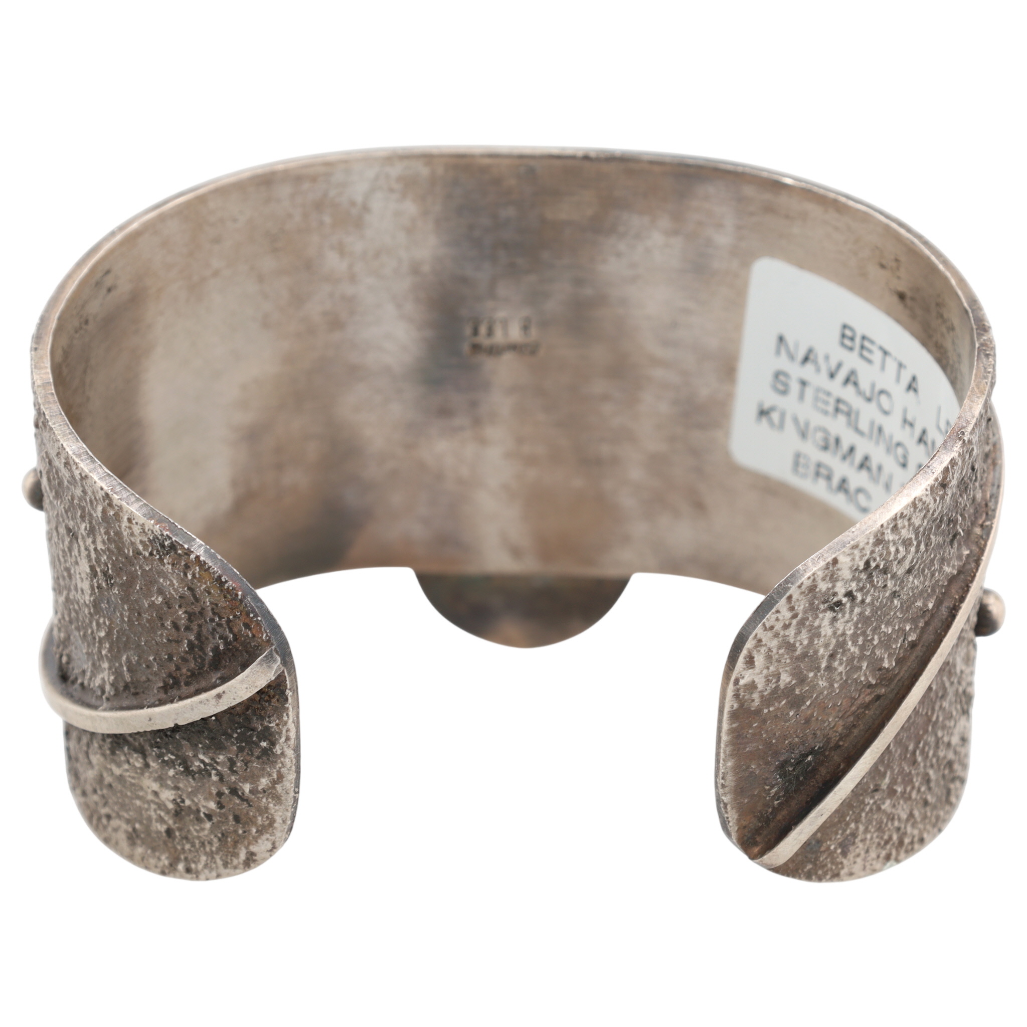 A Navajo tufa cast sterling silver and turquoise cuff bracelet by Betta Lee. This wide, open-cuff bracelet is crafted from silver, featuring a heavily textured or hammered surface. Two applied curved silver wires intersect at the center, securing an oval-shaped bezel-set turquoise cabochon with a black matrix. The interior of the bracelet is impressed with marks "Sterling" and "B LEE".