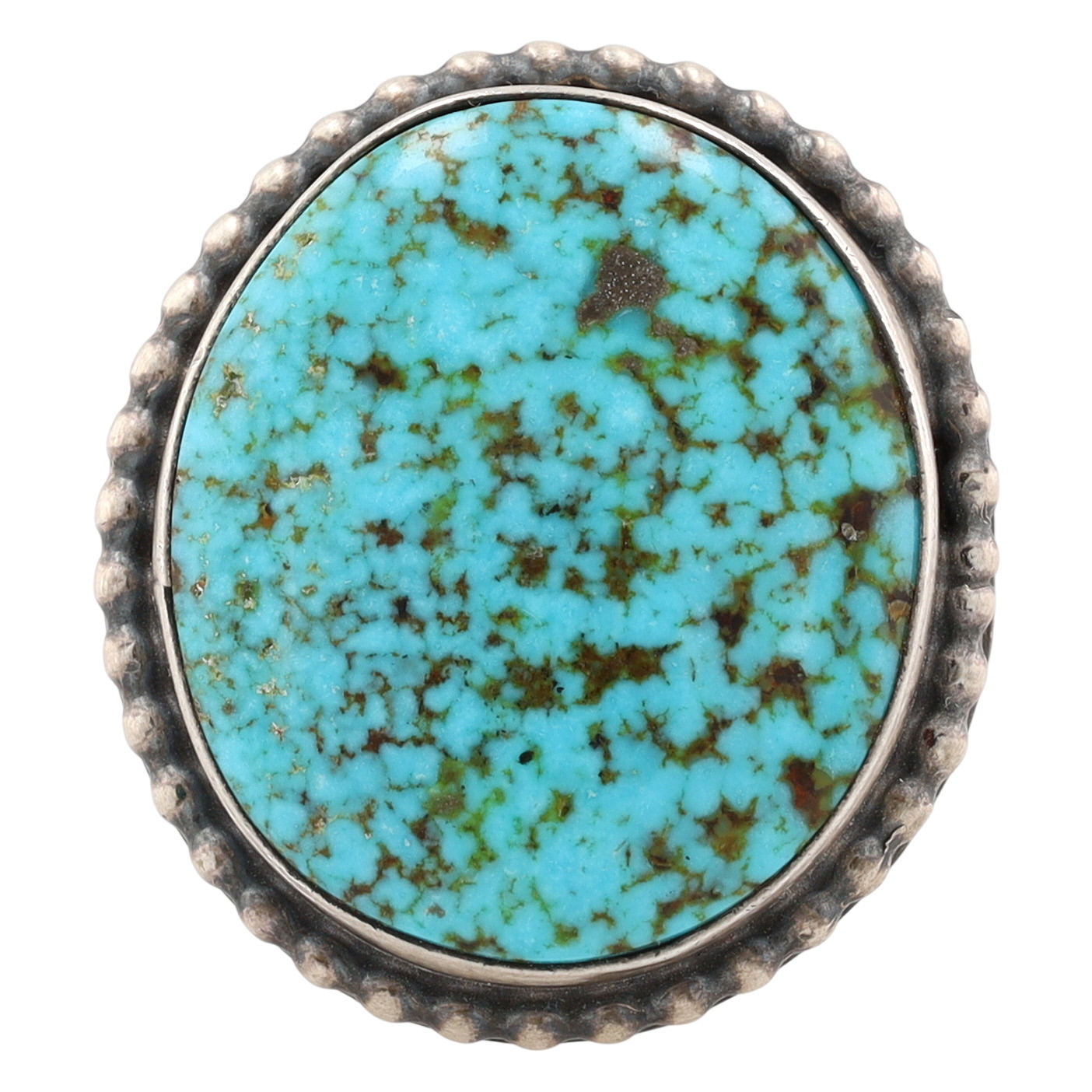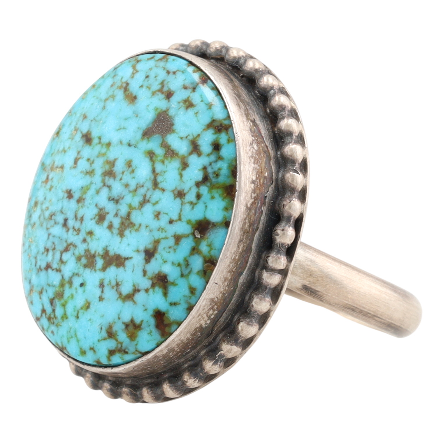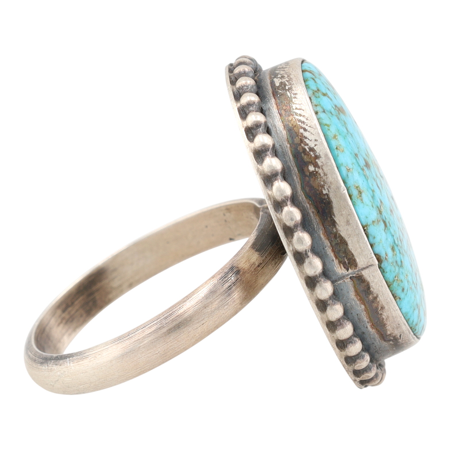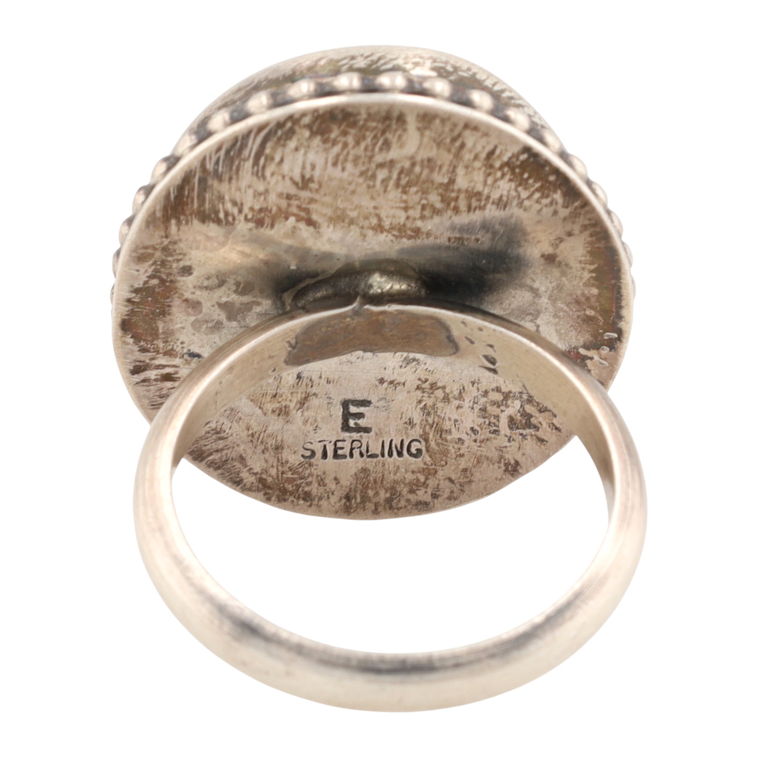 A Navajo sterling silver ring featuring a Kingman birdseye turquoise stone by Eli Skeets. The large, oval cabochon turquoise stone displays visible brown and dark matrix throughout, consistent with a birdseye pattern. It is set in a smooth bezel, which is surrounded by a raised beaded or "roped" border. The plain silver band is attached to the base of the stone setting. The interior of the band is visibly stamped with the word "STERLING" and the letter "E" directly above it.