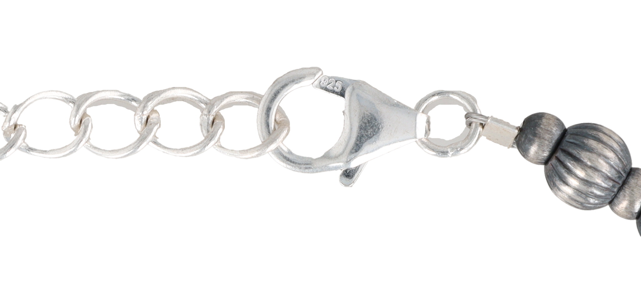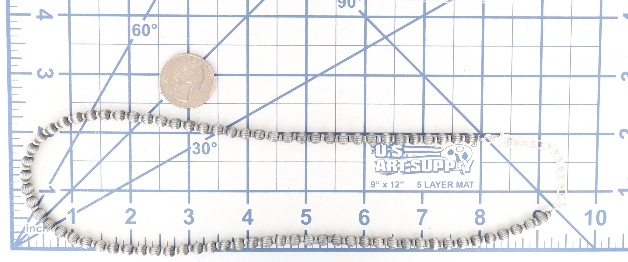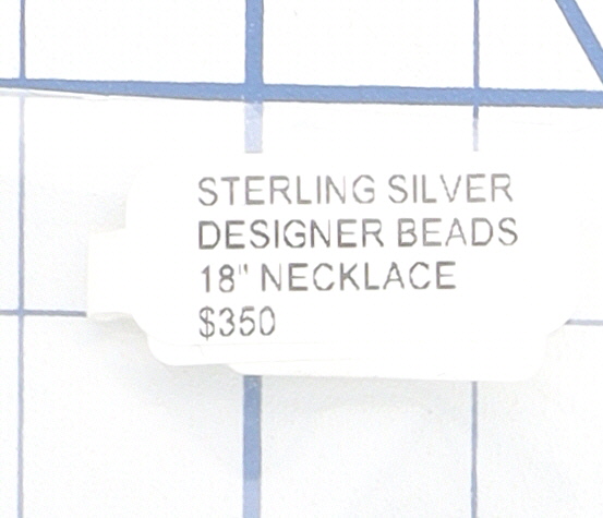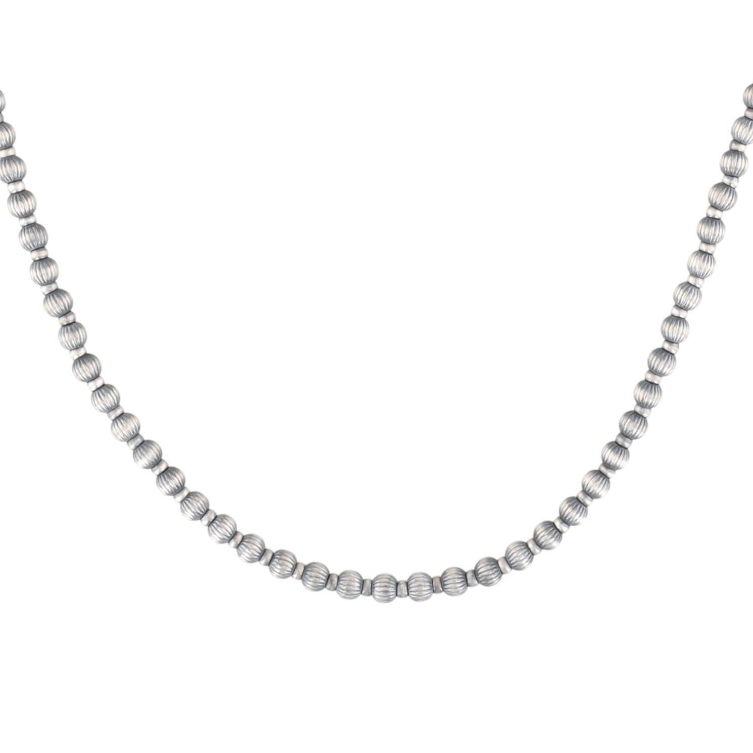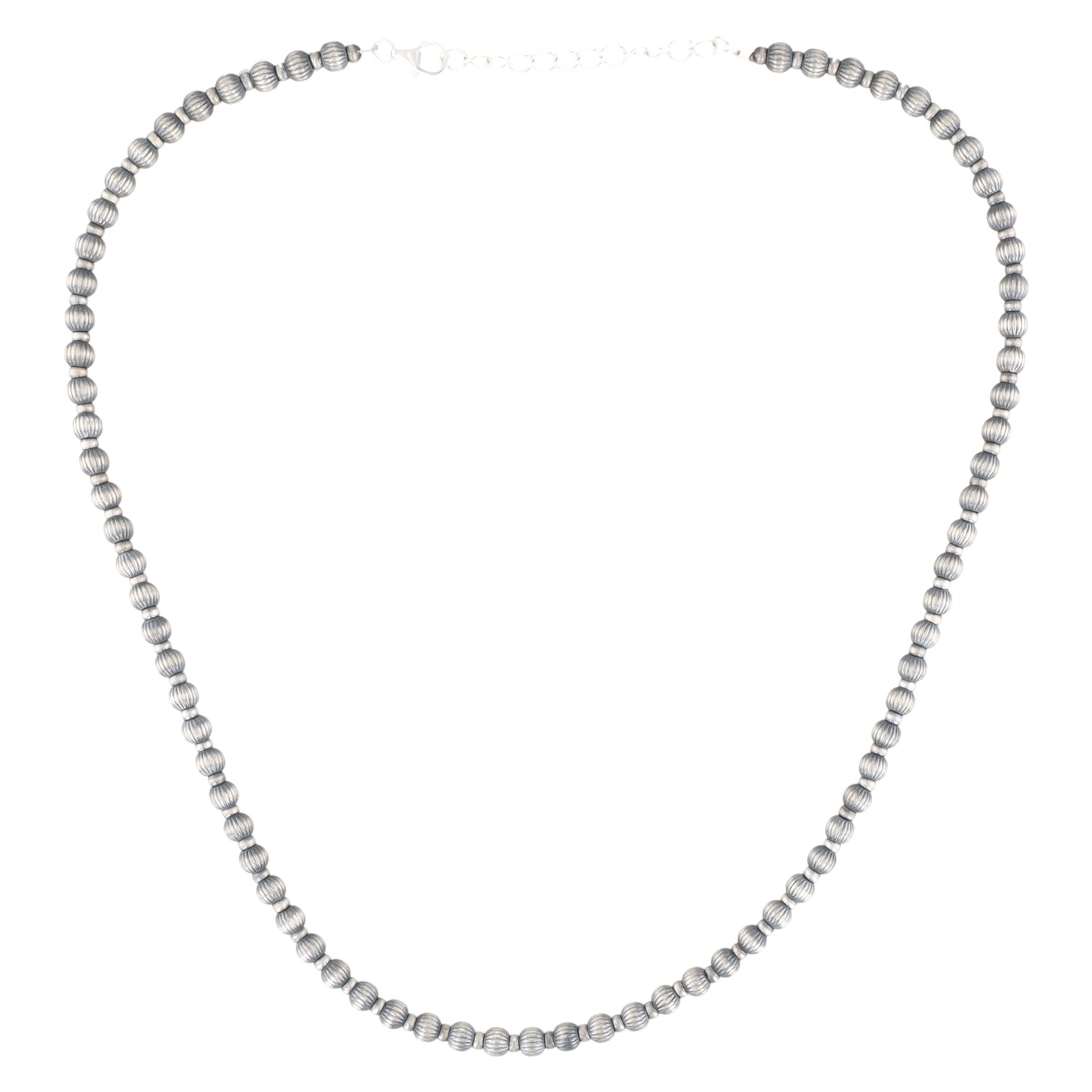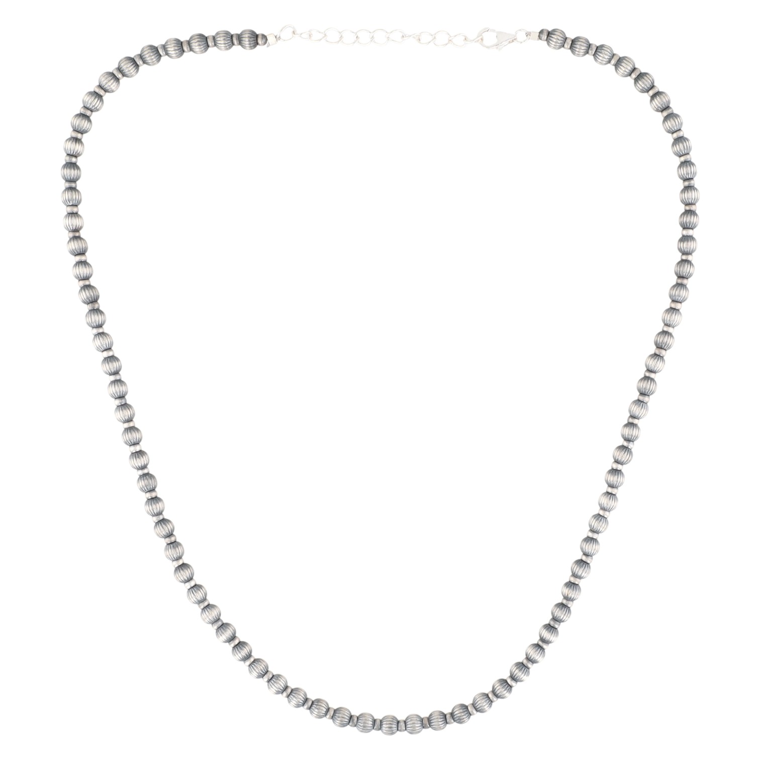 A Navajo Made Sterling Designer Beaded Necklace spherical beads featuring a distinctive diamond-cut (ribbed/fluted) surface texture. The necklace is secured by a lobster clasp stamped "925" and includes an extender chain. An accompanying tag identifies the item as "STERLING SILVER DESIGNER BEADS."
