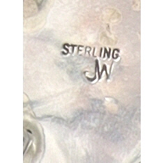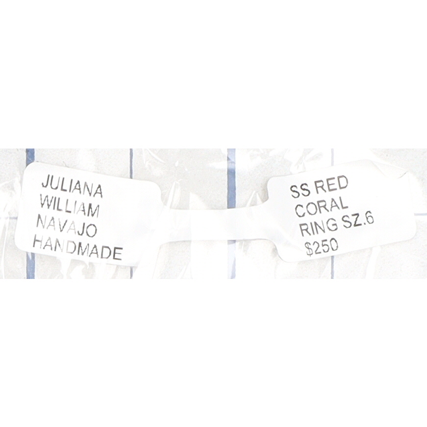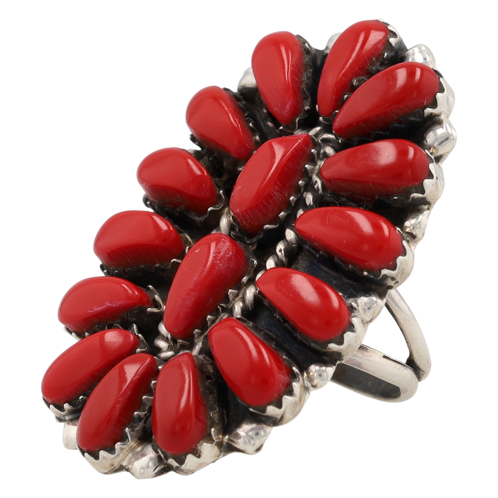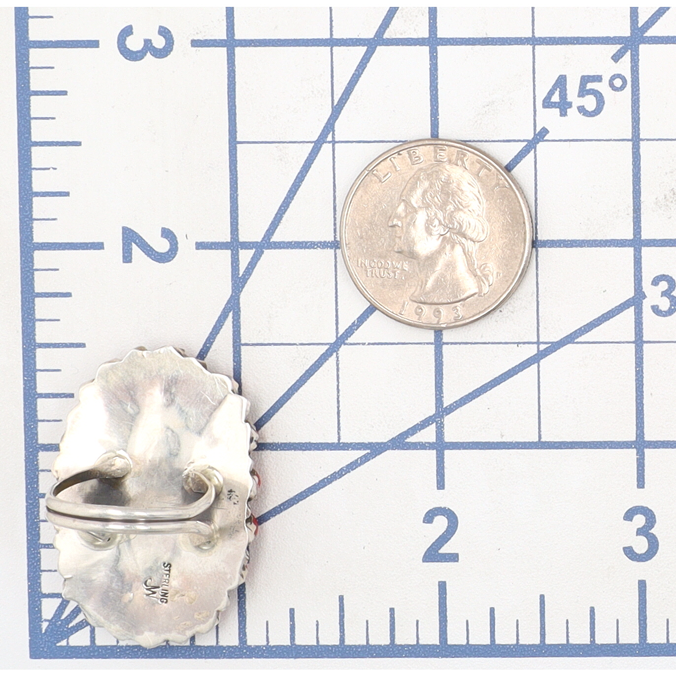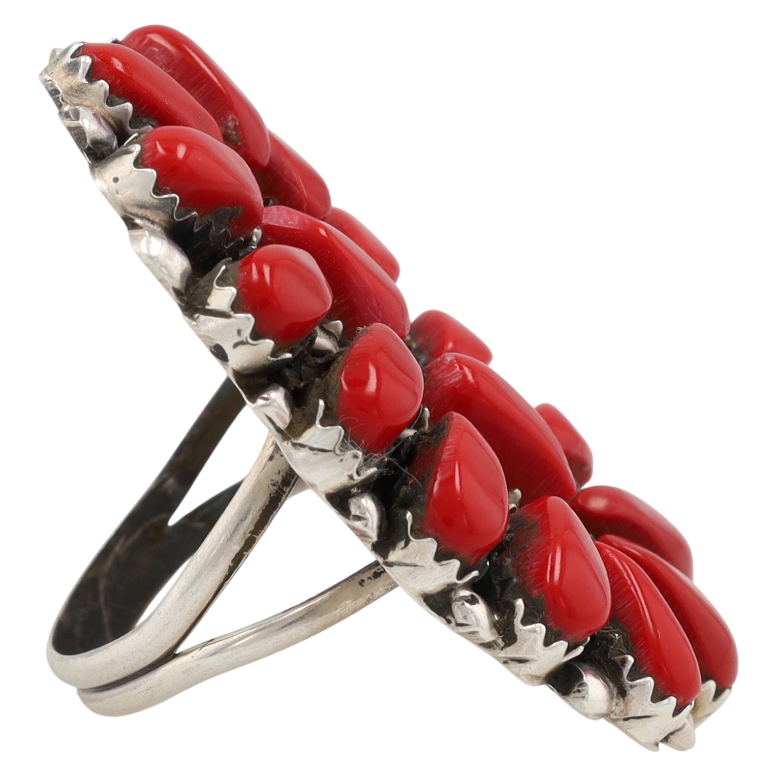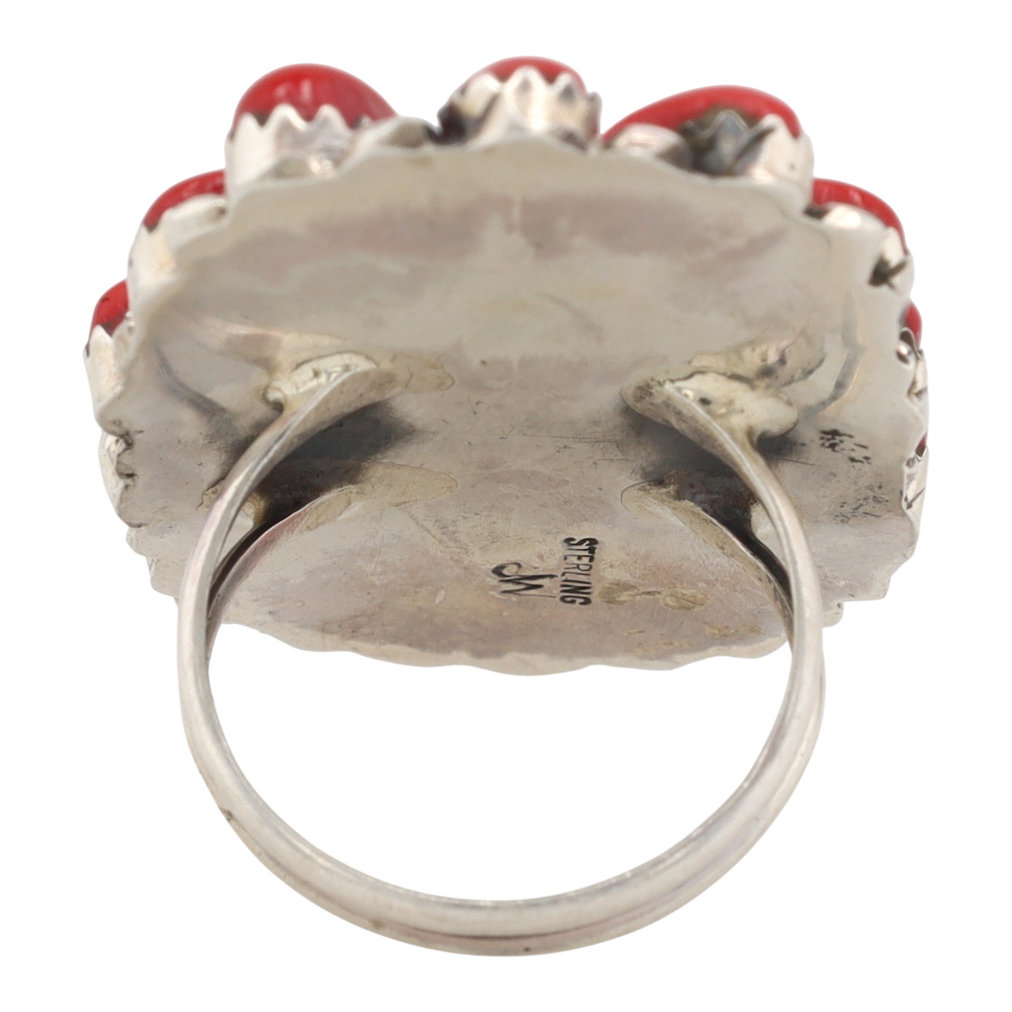 A Zuni Juliana Williams red coral petit point sterling silver ring. This large, oval-shaped cluster ring is crafted from sterling silver and features a multitude of polished, teardrop-shaped opaque red stones, consistent with coral. The stones are arranged in a cluster design around a central element, set within twisted wire and serrated bezels. The reverse of the ring is clearly stamped "STERLING" along with an intertwined "JW" maker’s mark.