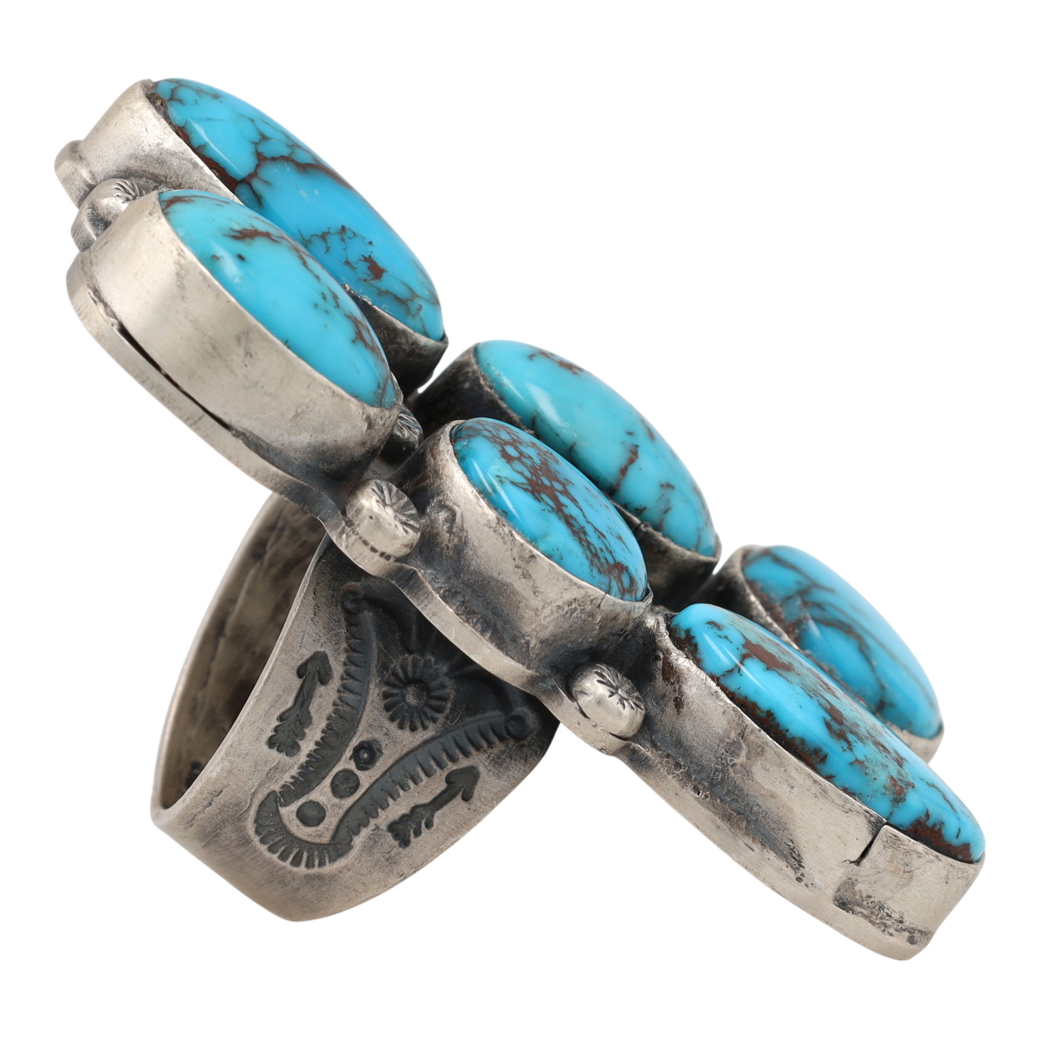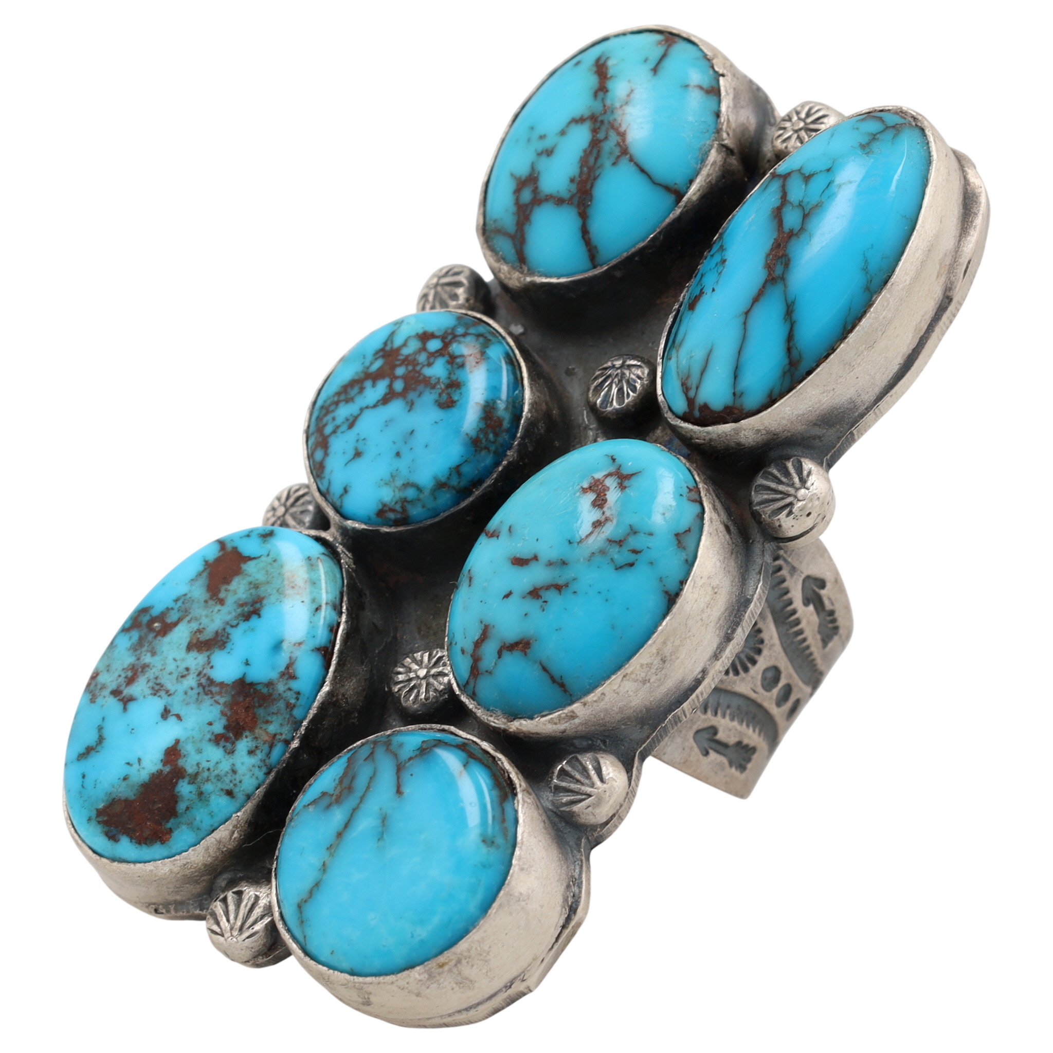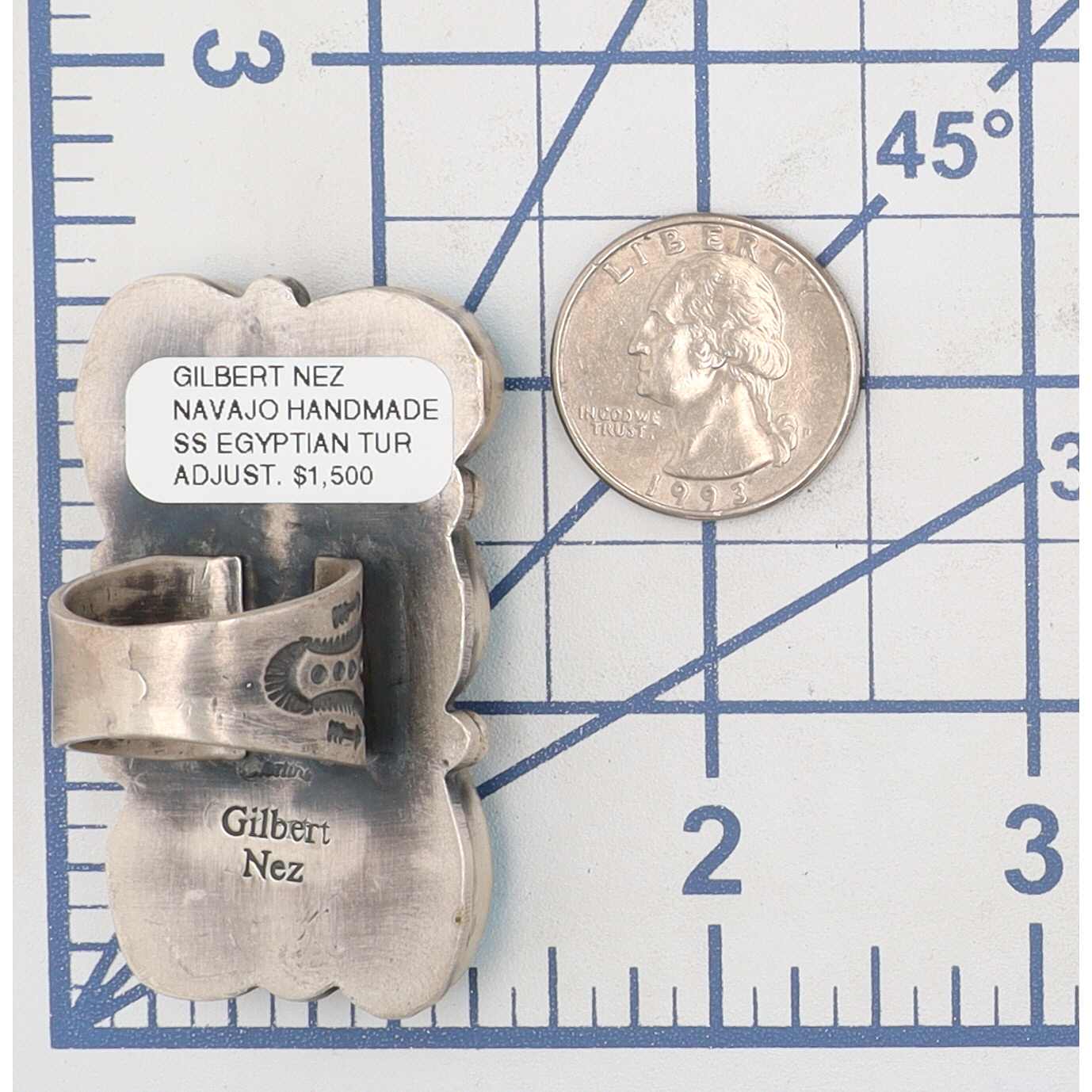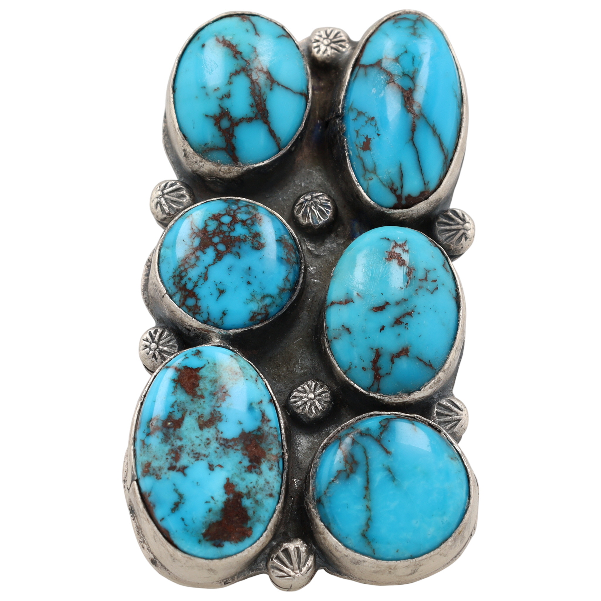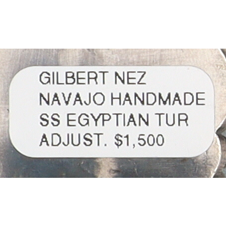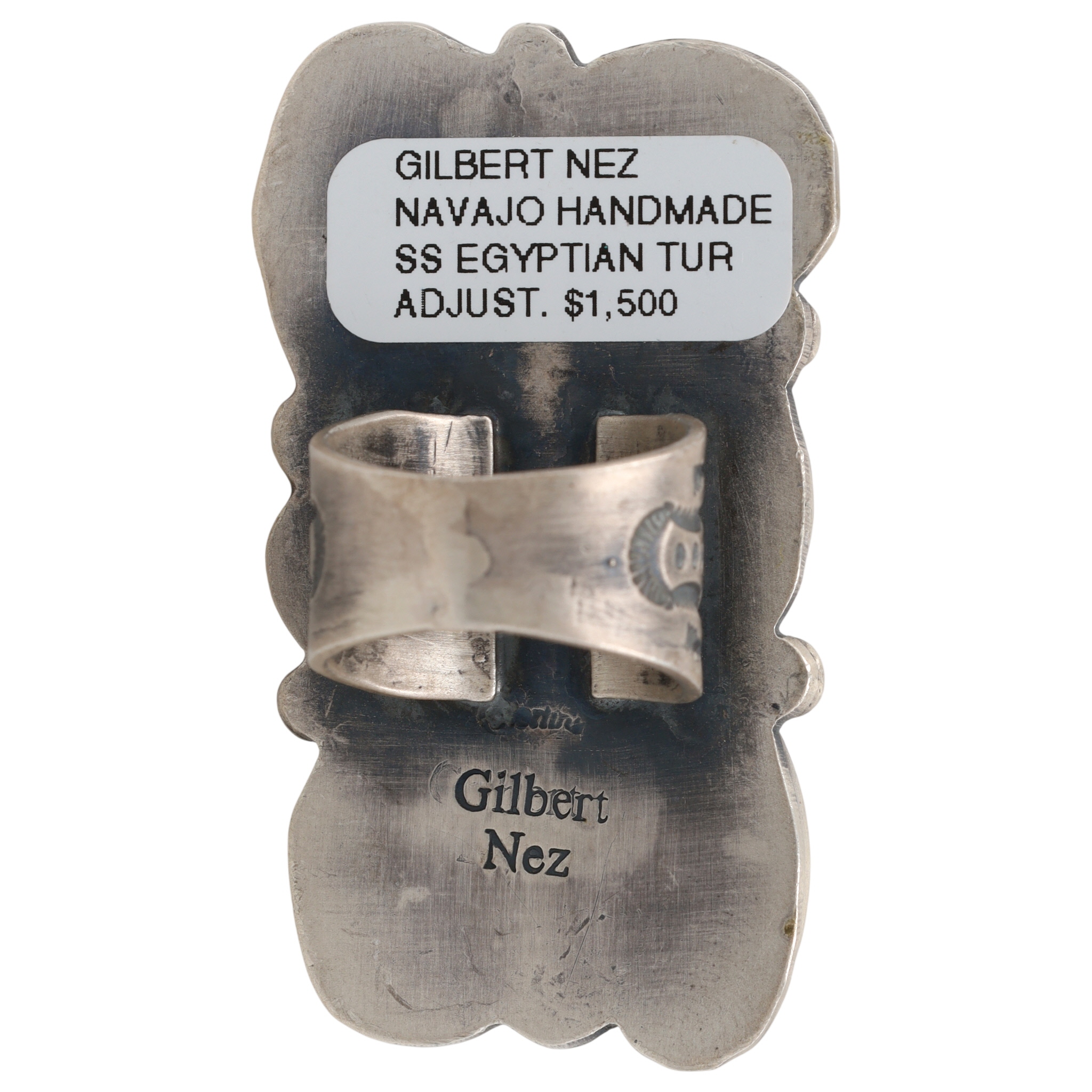A Navajo ring by Gilbert Nez, featuring a large-format rectangular face set with six oval cabochon-cut Egyptian turquoise stones, arranged in two columns of three. The turquoise exhibits varied shades of blue with prominent brown and black matrix. The setting and adjustable split shank are crafted from sterling silver, which shows an aged patina and is adorned with stamped decorative motifs. The reverse of the setting is stamped "Gilbert Nez" and also bears an adhesive label stating "GILBERT NEZ NAVAJO HANDMADE SS EGYPTIAN TUR ADJUST. $1,500".