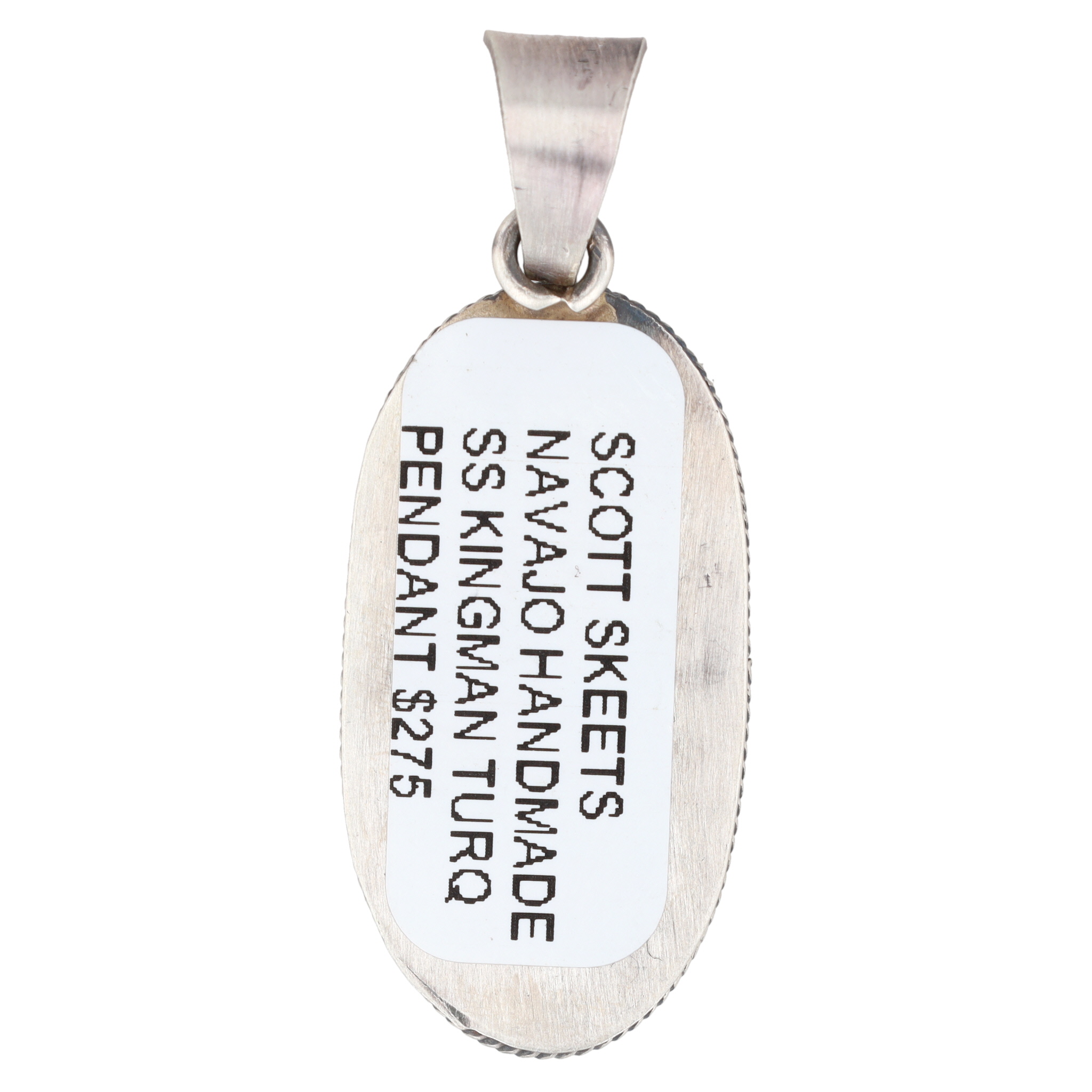 Scott Skeets Navajo pendant featuring an oval, high-domed cabochon Kingman turquoise stone with vibrant blue-green coloration and significant brown and tan matrix. The stone is set in a sterling silver bezel with a twisted rope border. The reverse side features a white adhesive label reading "SCOTT SKEETS", "NAVAJO HANDMADE", "SS KINGMAN TURQ", and "PENDANT $275". A hallmark is stamped into the bale, partially visible as "STERLING" above "SKEETS", indicating the maker as Scott Skeets.