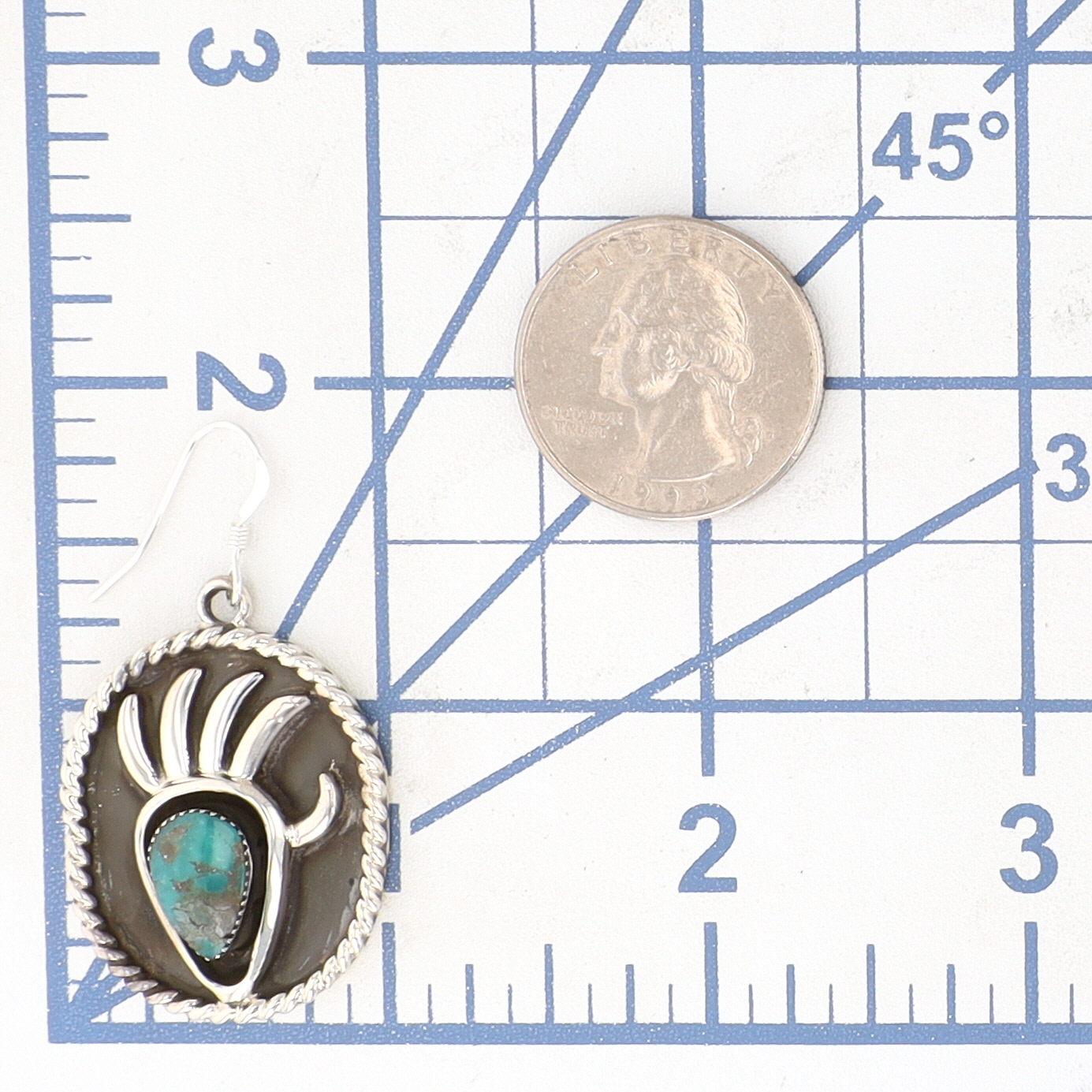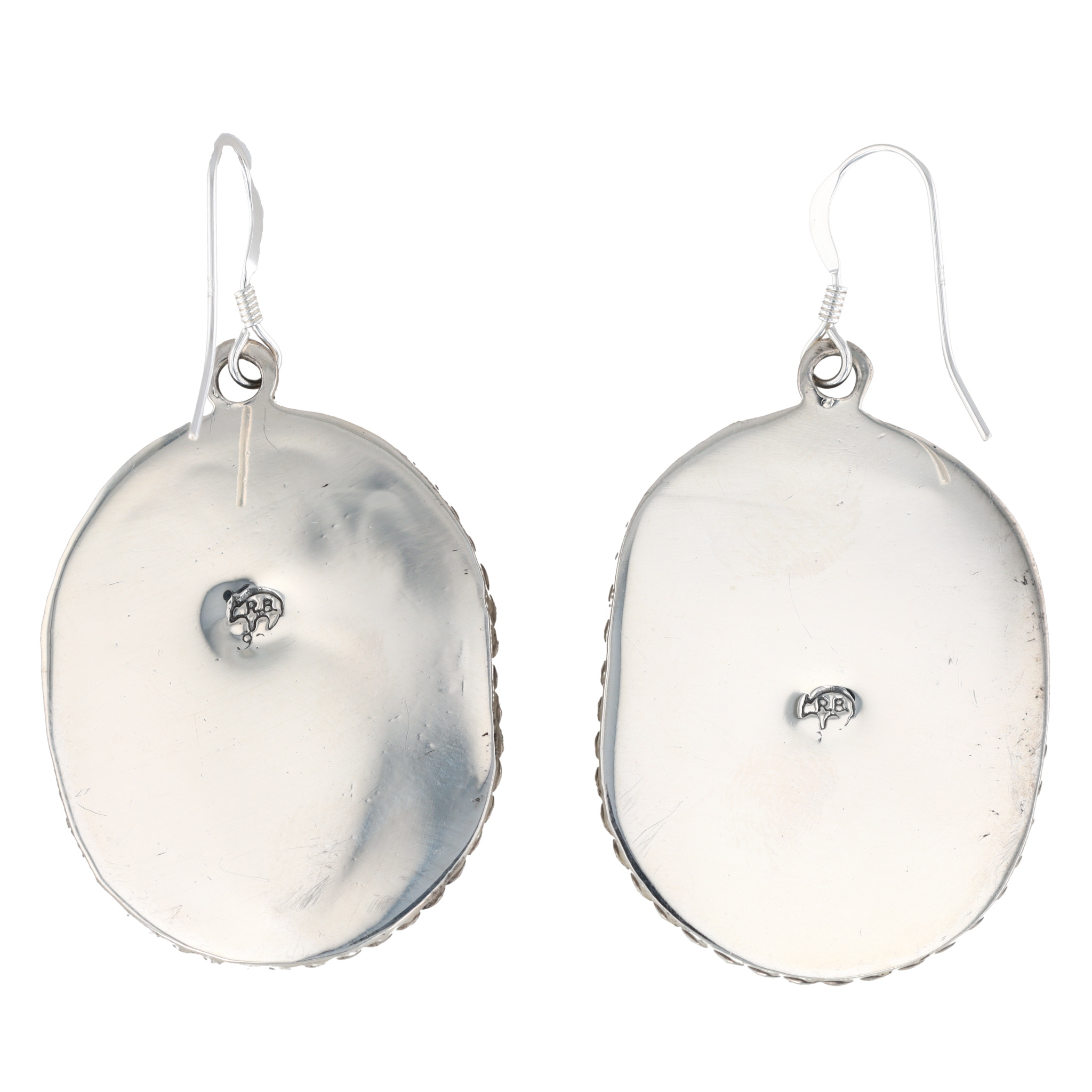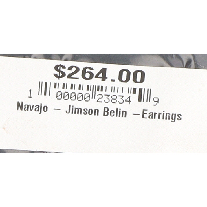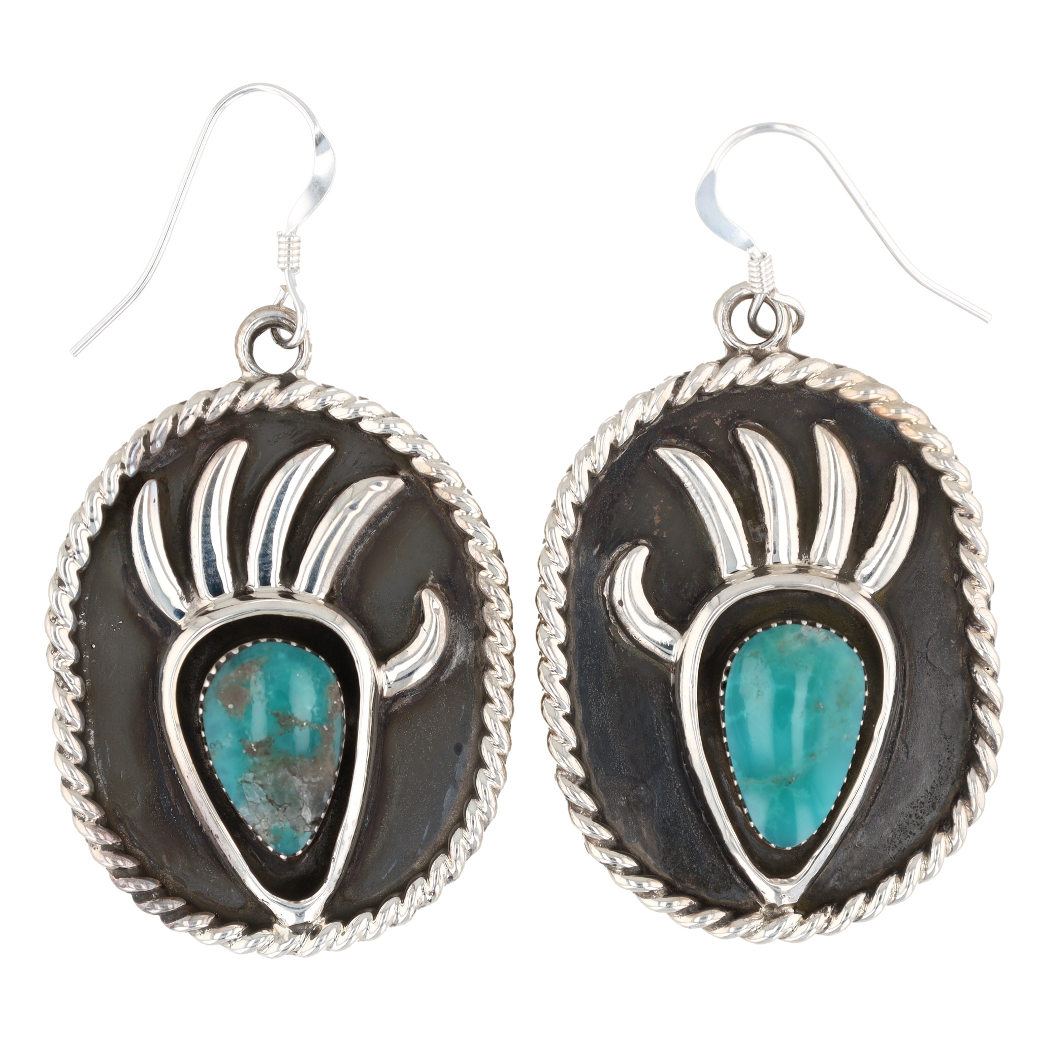 A pair of Native American Navajo sterling silver and turquoise dangle earrings by Jimson Berlin, each featuring an oval-shaped silver-tone metal setting with a twisted wire border. The central design depicts a stylized bear paw motif in polished silver-tone metal, set against a dark, likely oxidized or patinated ground, cradling a single, bezel-set teardrop-shaped turquoise cabochon stone. The reverse of each earring is polished silver-tone and bears a stamped maker’s mark "RB" for Running Bear Shop. A visible retail tag identifies the item as "Navajo – Jimson Belin – Earrings". The metal appears to be sterling silver.