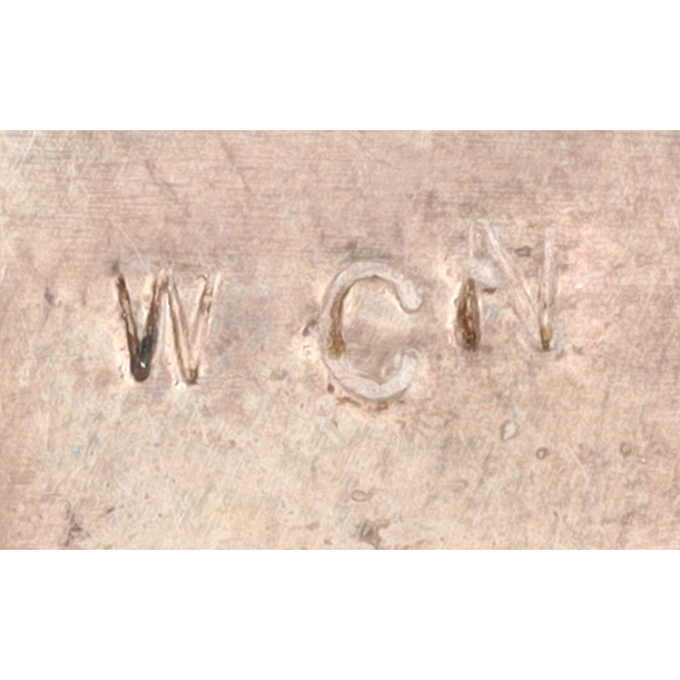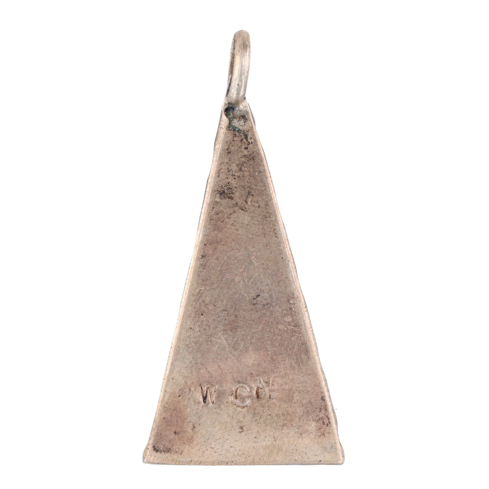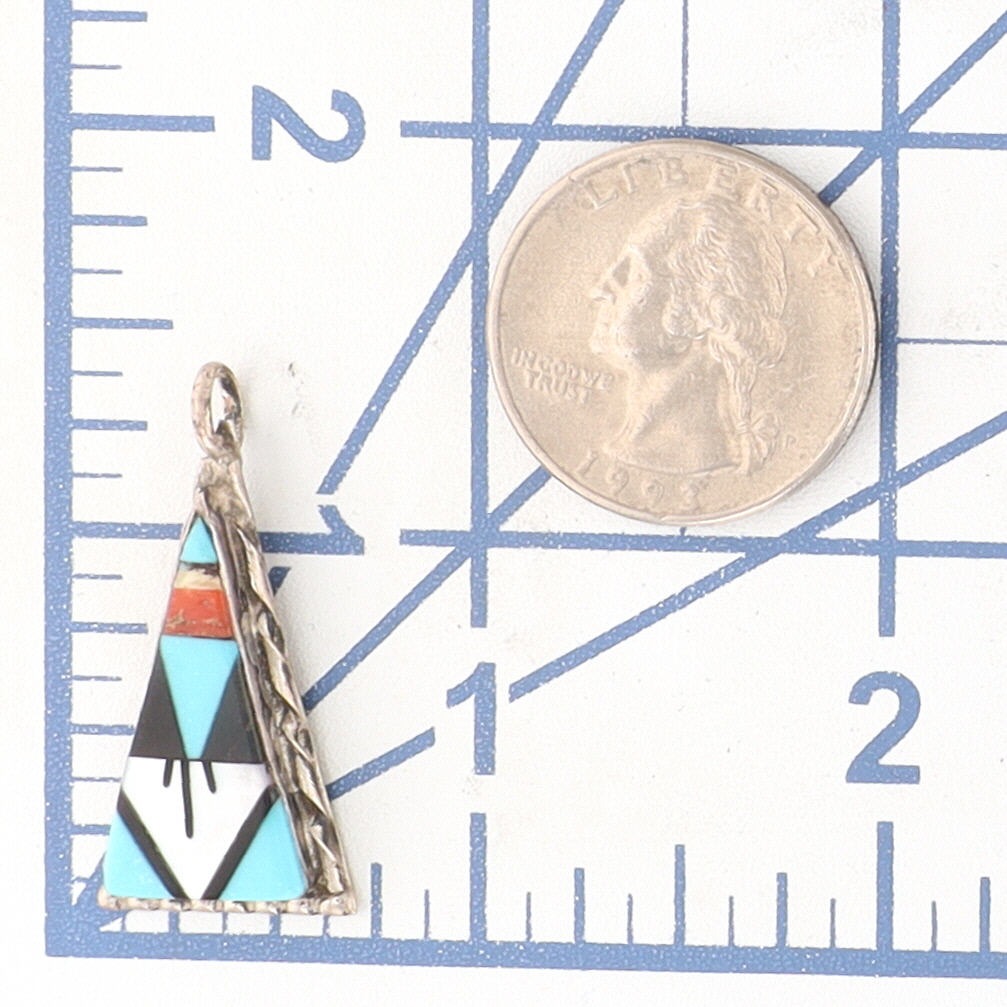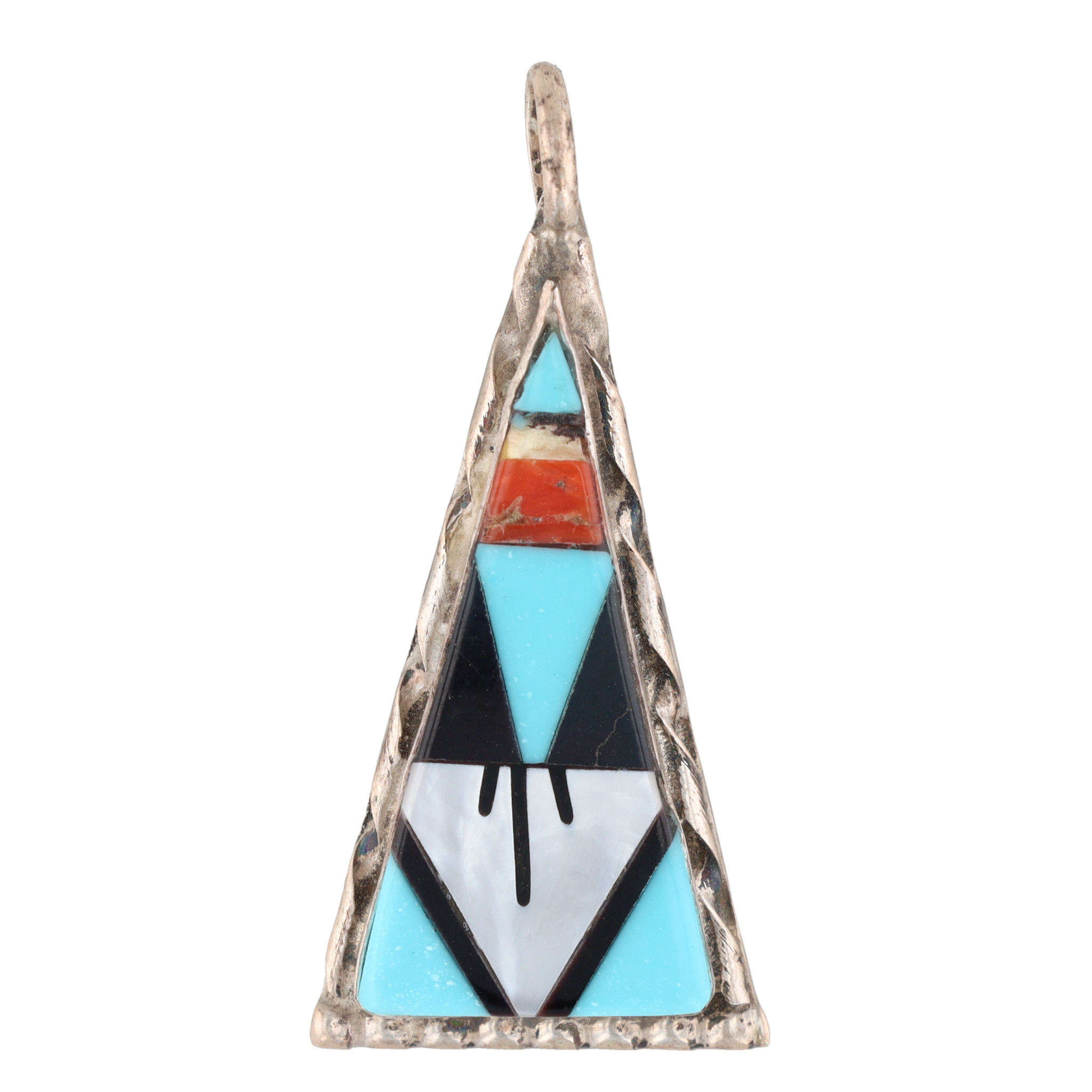 A Zuni multi-stone geometric inlay sterling silver triangular pendant by Wilson and Carol Niiha. The pendant features a textured silver-toned frame with an integrated bale at its apex. The front is adorned with a symmetrical abstract geometric pattern composed of inlaid, polished sections of coral, turquoise, mother of pearl, and onyx. The reverse side is plain metal with a stamped marking "W CN" near the base.